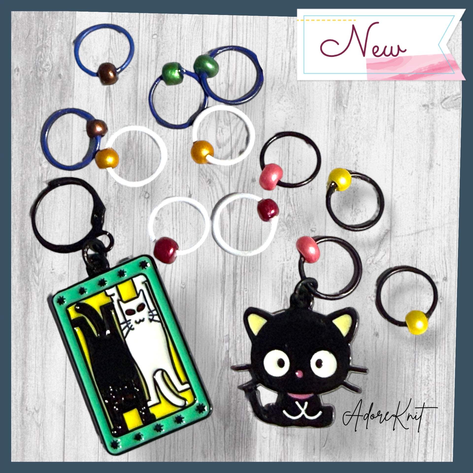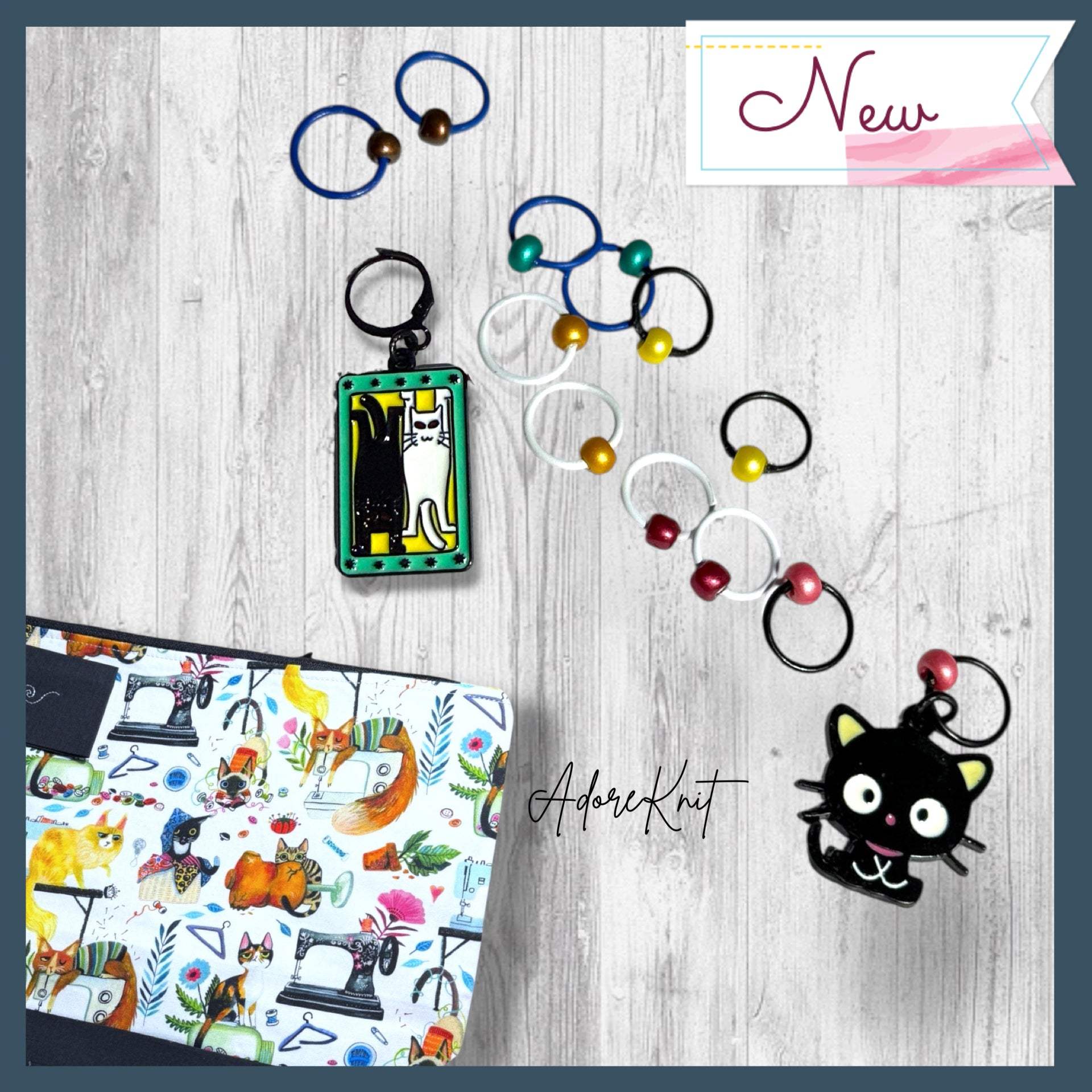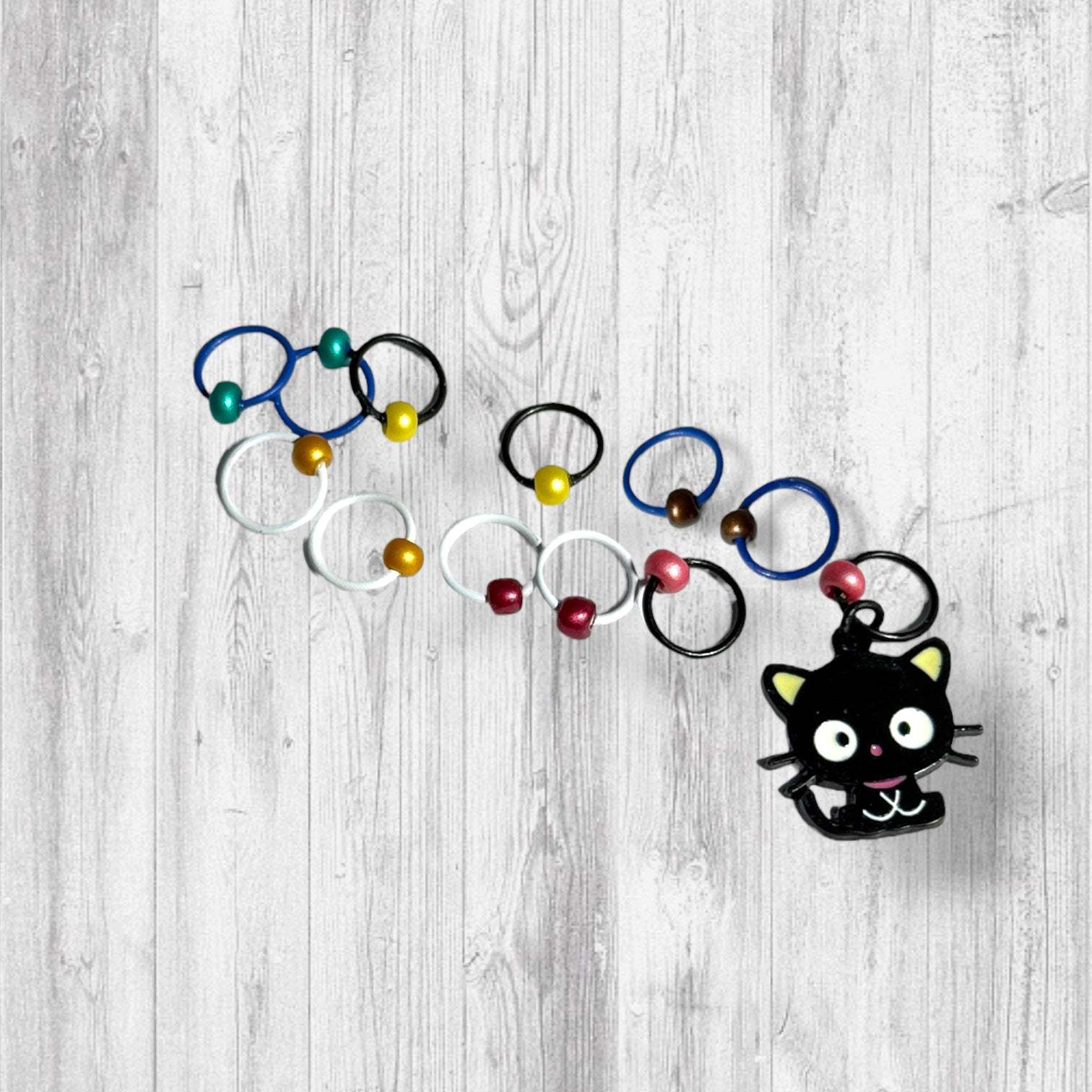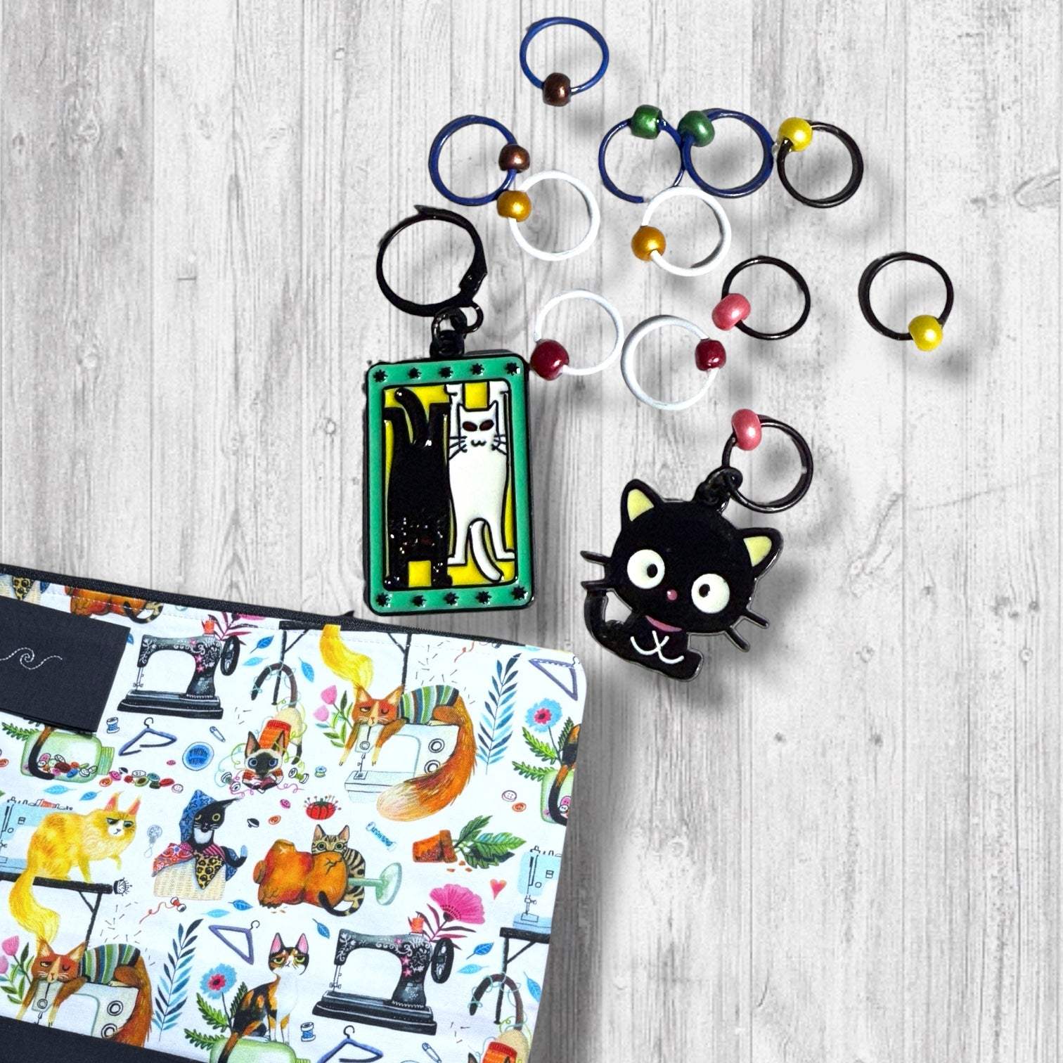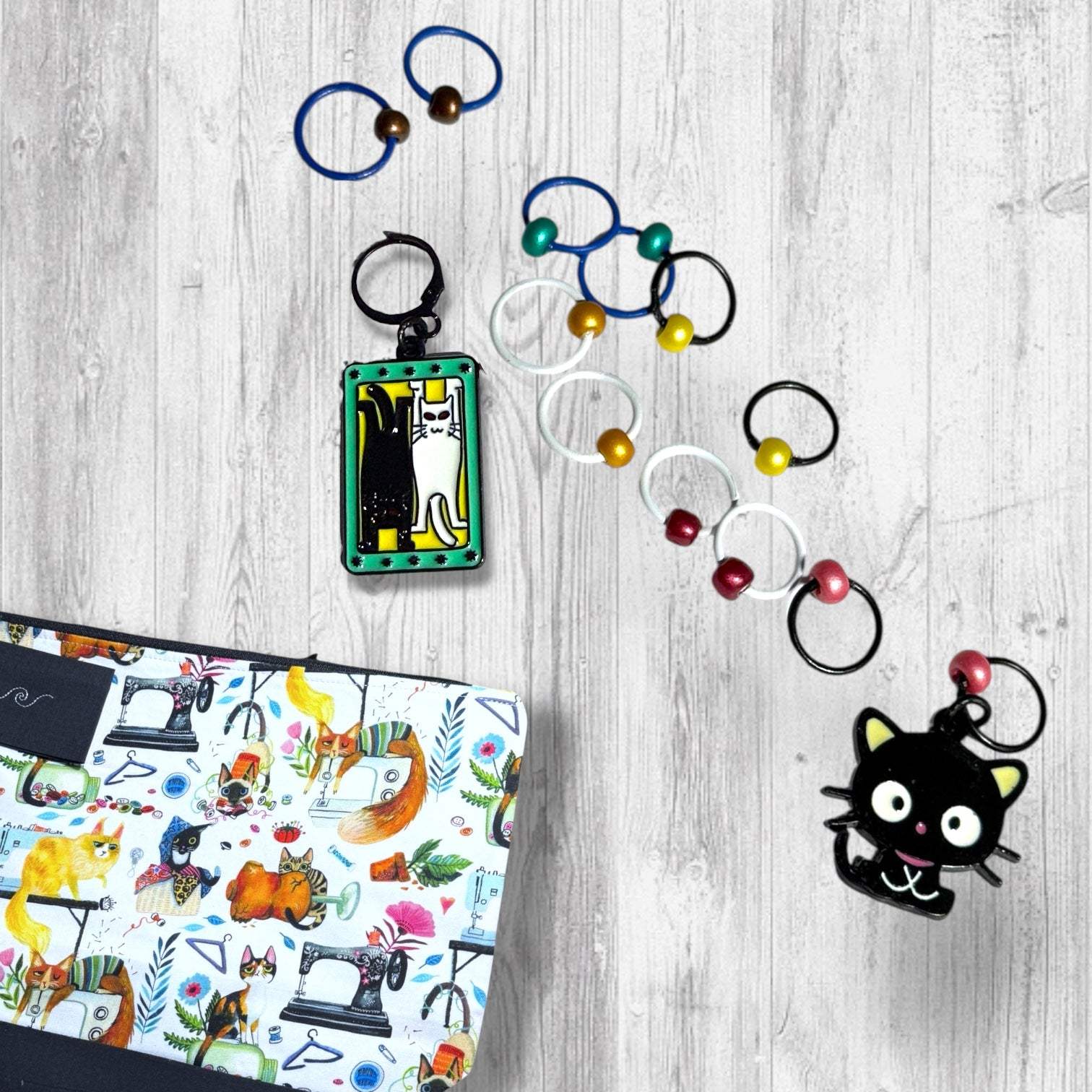 • Set of 12 Stitch Markers (including a curious black cat)