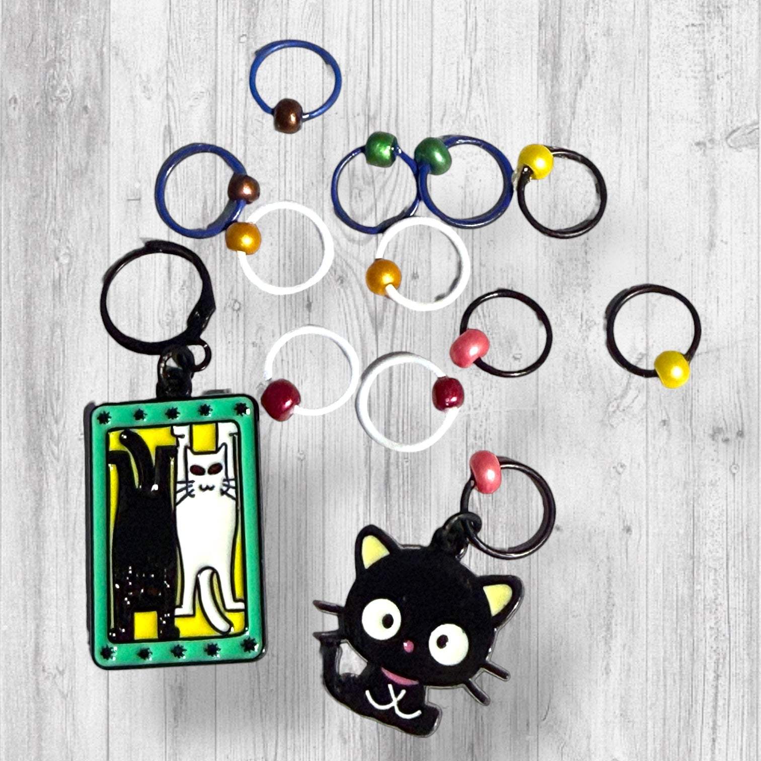 Iron coated rings in white, black, and navy blue carry sateen glass beads in warm gold, sunny yellow, leafy green, maroon, pink, and brown, echoing the cozy palette of lounging cats, yarn baskets, and everyday knitting mischief.