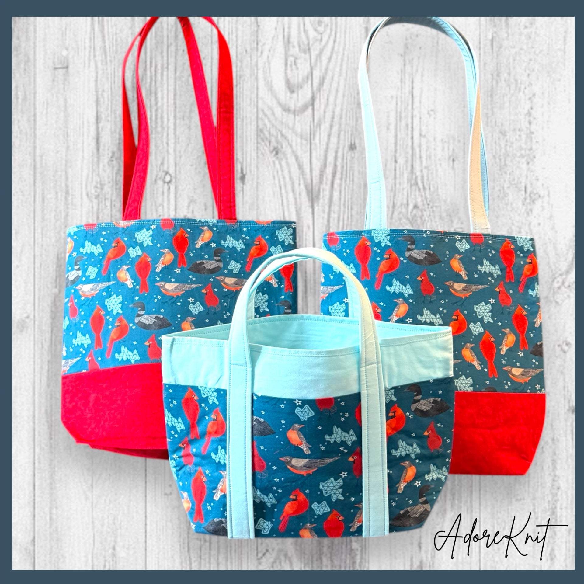 Carry All Tote Bag is slightly larger than our medium sized bag, made to a minimum of 8” high, 9" long by 4" wide. Square bottom and sturdy straps allow you to carry the bag without losing its shape. The straps and the interior of project bag are a rich solid red fabric. Exterior of the bag features 6 different size pockets, great for your phone or keys. It will easily fit a three skein projects and works great for shawl, cowl, hats, and mitten projects. Or load up several projects and carry them all in this adorable mid-sized tote.
