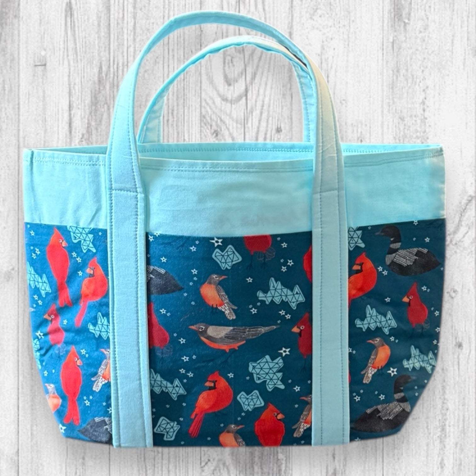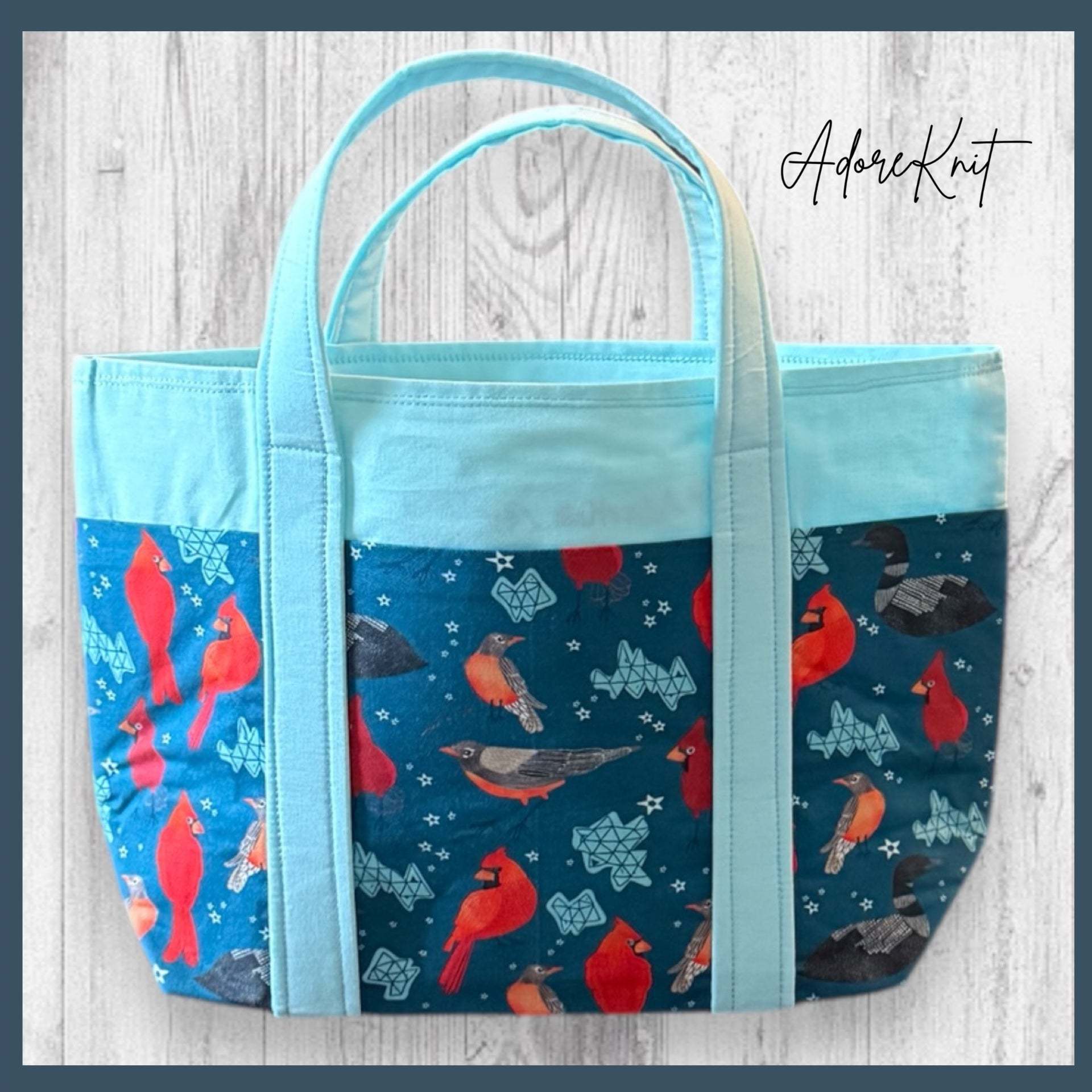 Commuter Tote Bag is our largest sized bag, made to a minimum of 12” high, 16” wide at the top, with a rectangular bottom of 12” by 4”. This bag is an open-mouthed bag, it does not have a zipper. Sturdy straps allow you to carry the bag without losing its shape. The bag will comfortably fit six or even eight skein projects and is ideal for sweaters, larger shawl projects, and even blankets. Or throw all your other project bags in this one.