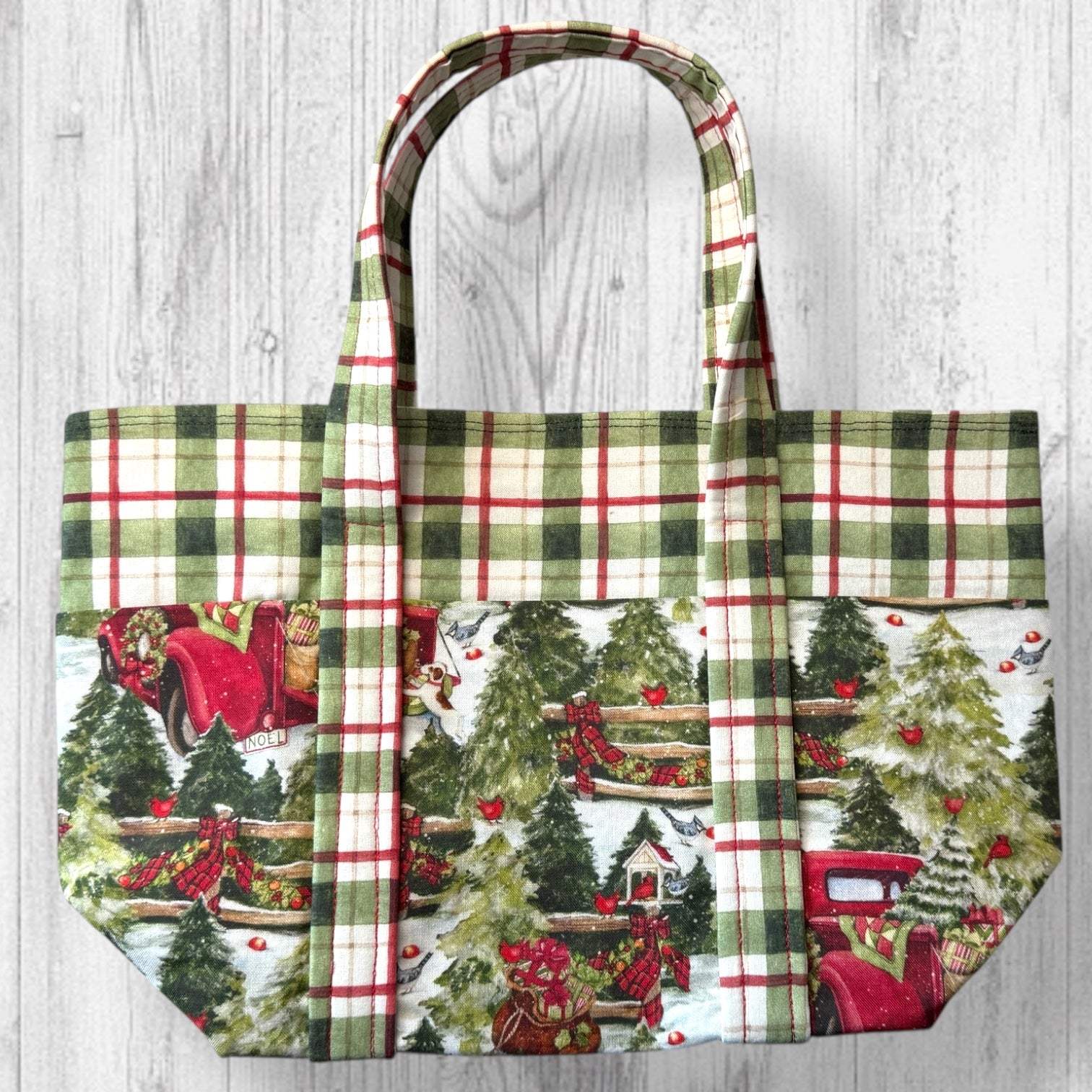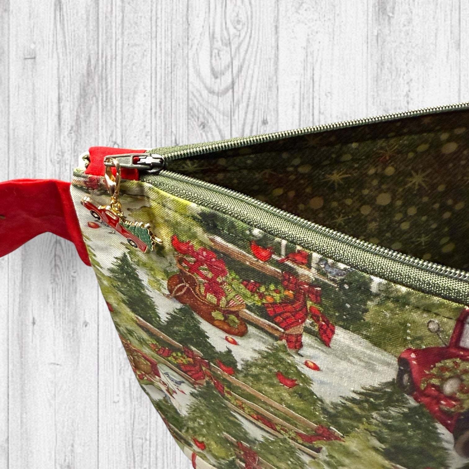 Snowy Pines Pickup Project Bag This project bag brings all the charm of a winter postcard right to your knitting chair. The centerpiece is a vintage red truck loaded with evergreens gifts and seasonal cheer, rolling along a snowy woodland road lined with decorated fences and friendly cardinals. Deep greens cheerful reds and snowy whites create a classic Christmas palette that feels both nostalgic and festive.