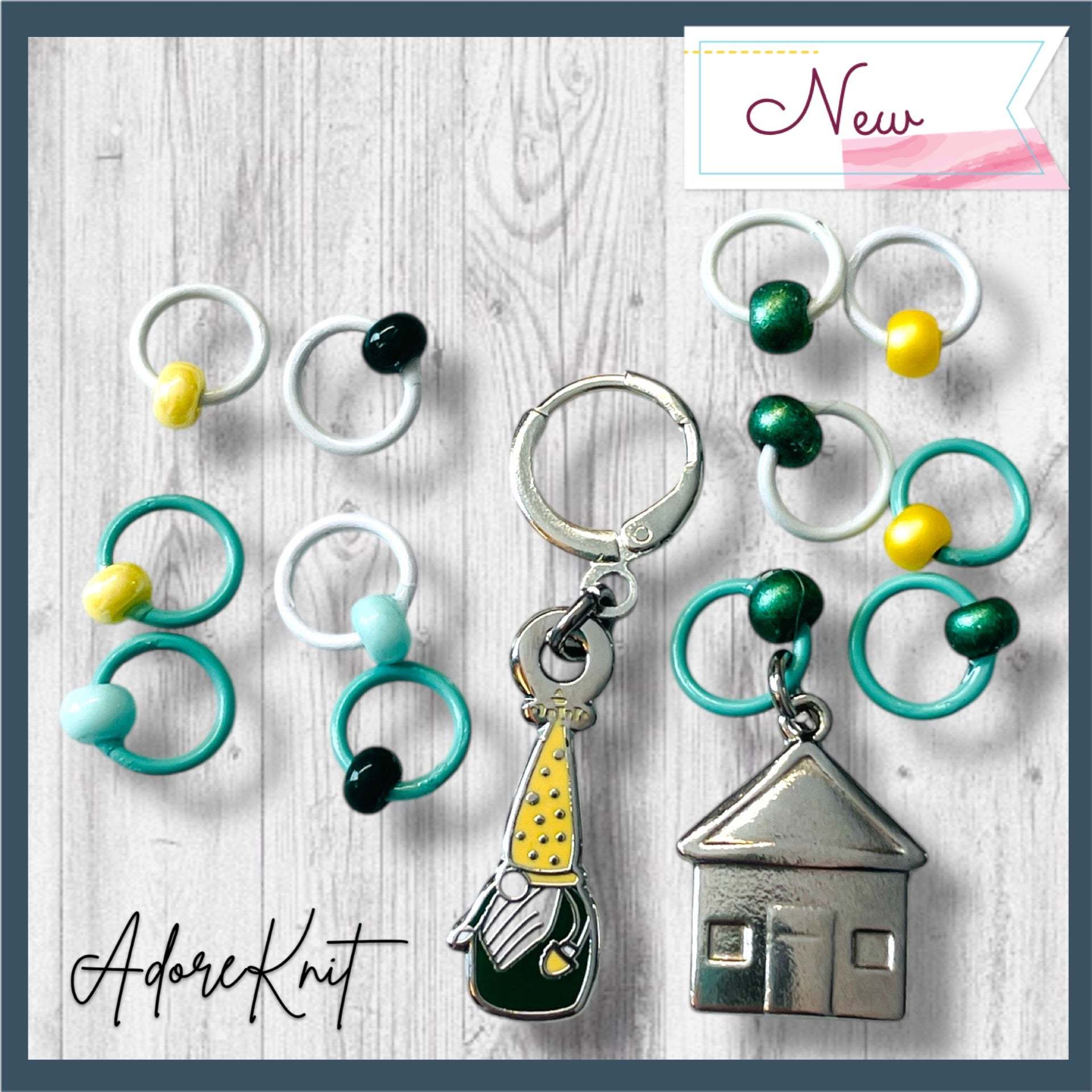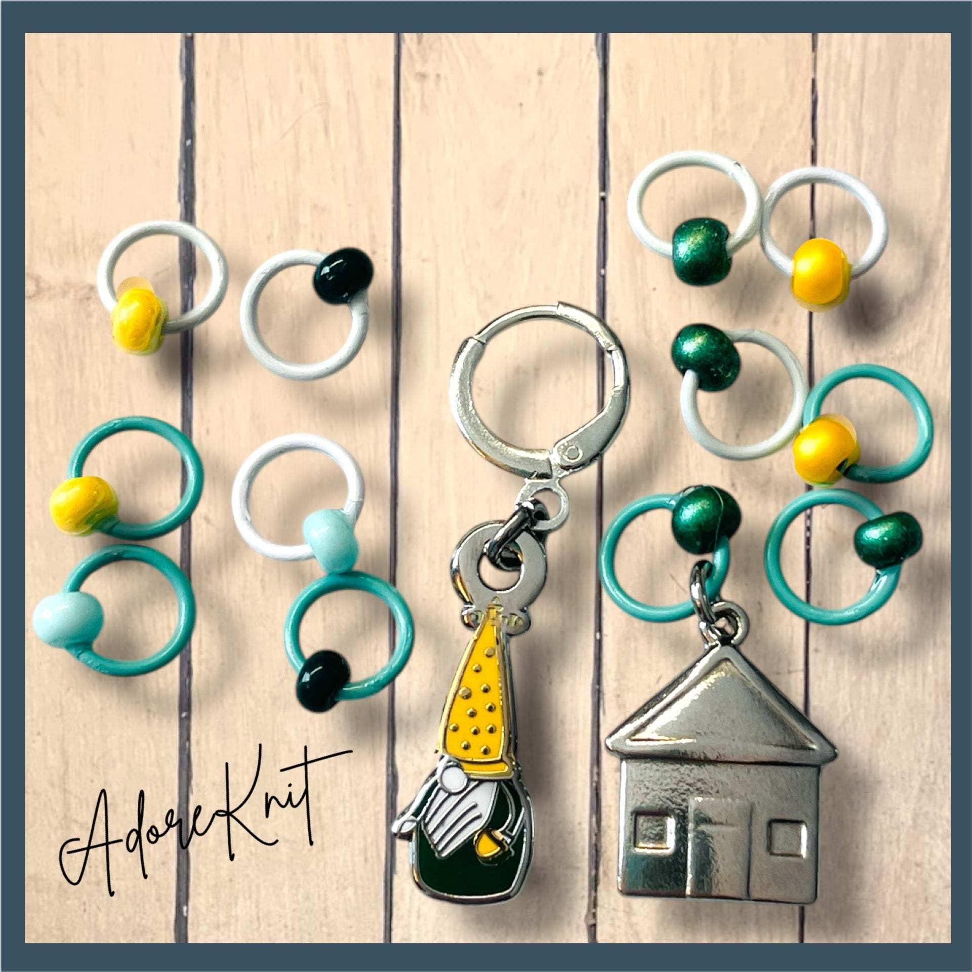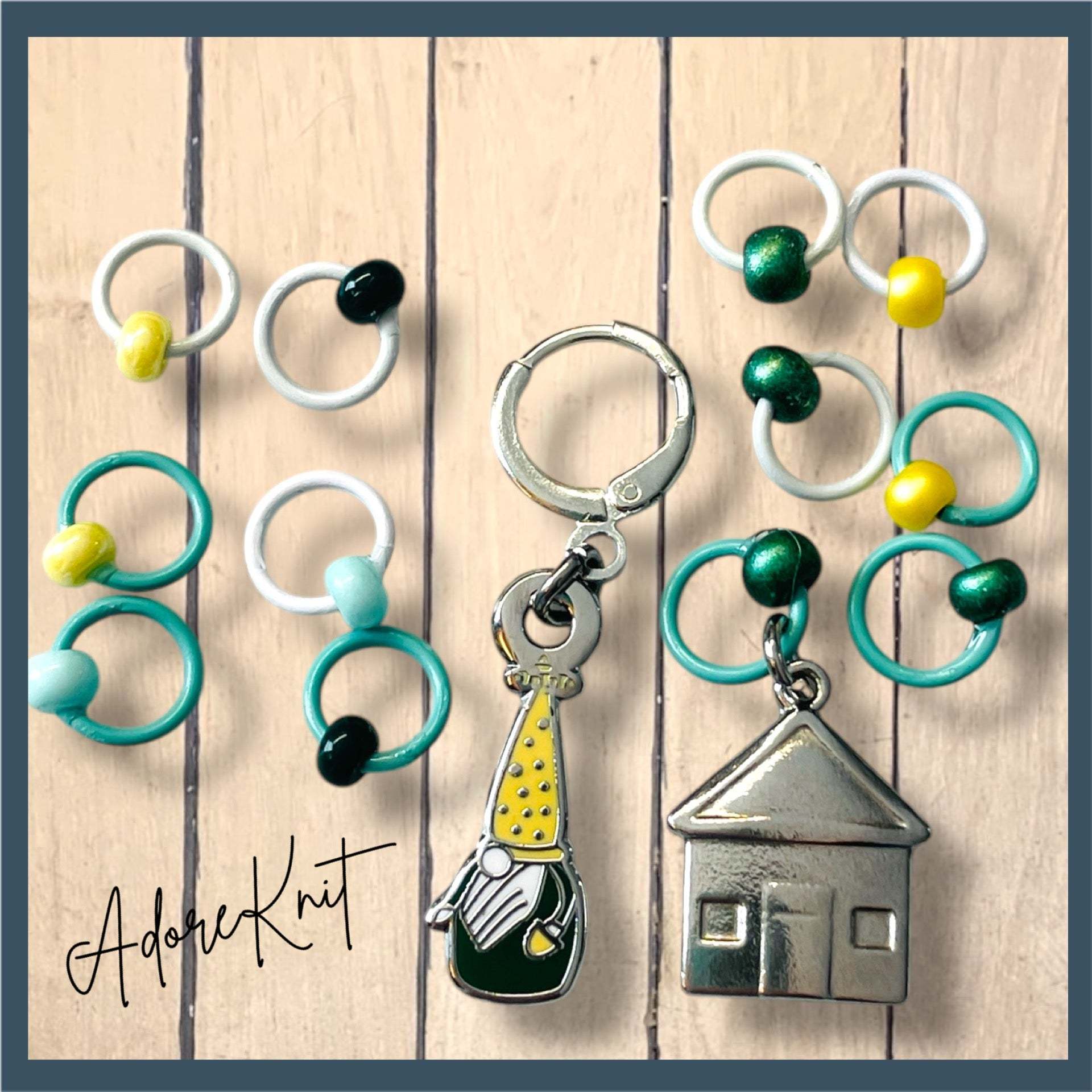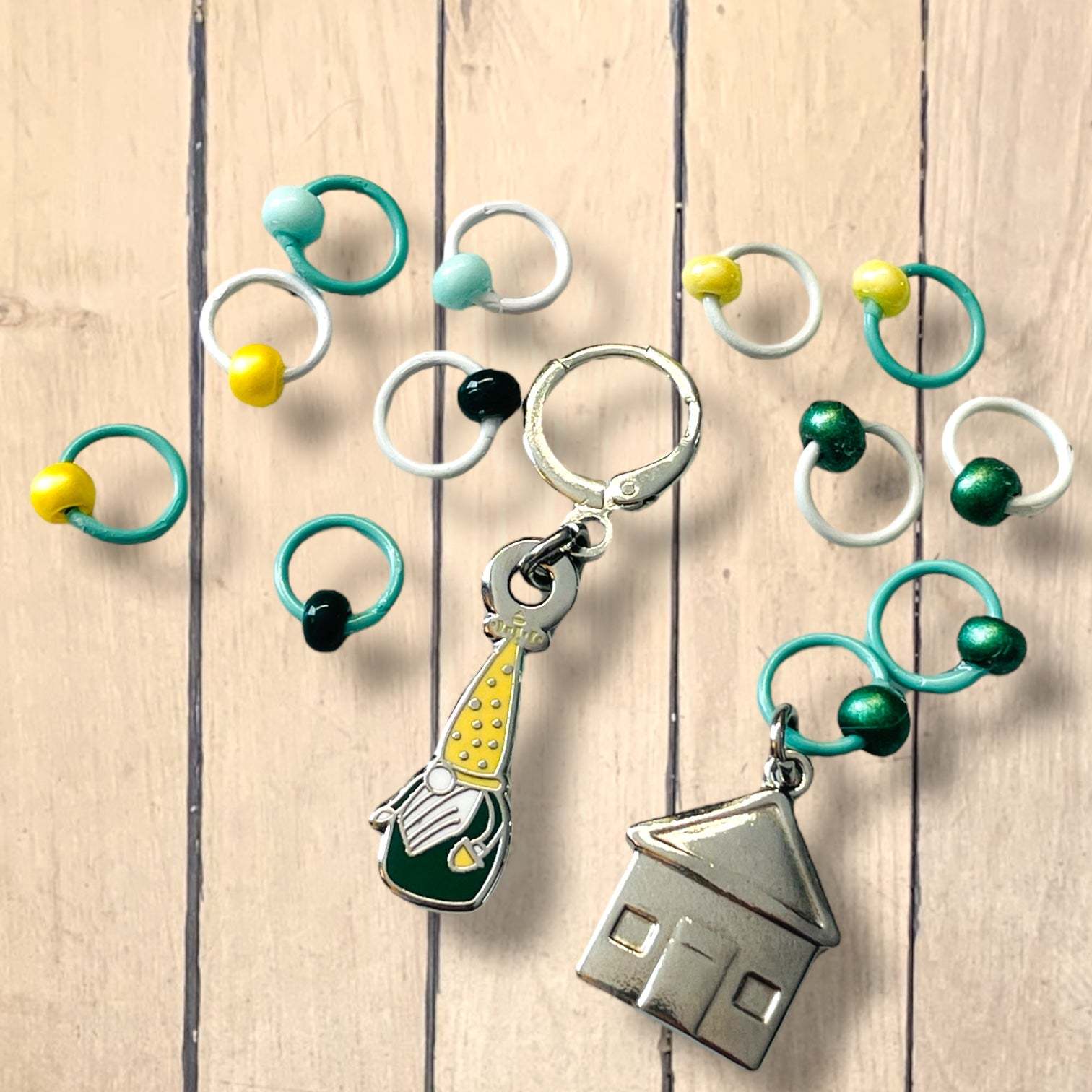 Spruce and Honey Gnectar Progress Marker Set: A set of 12 stitch markers featuring iron-coated rings in white and arctic blue, adorned with sateen and shiny beads in spruce, arctic blue, and light honey. Gnectar’s cozy home is the beginning of the round marker.