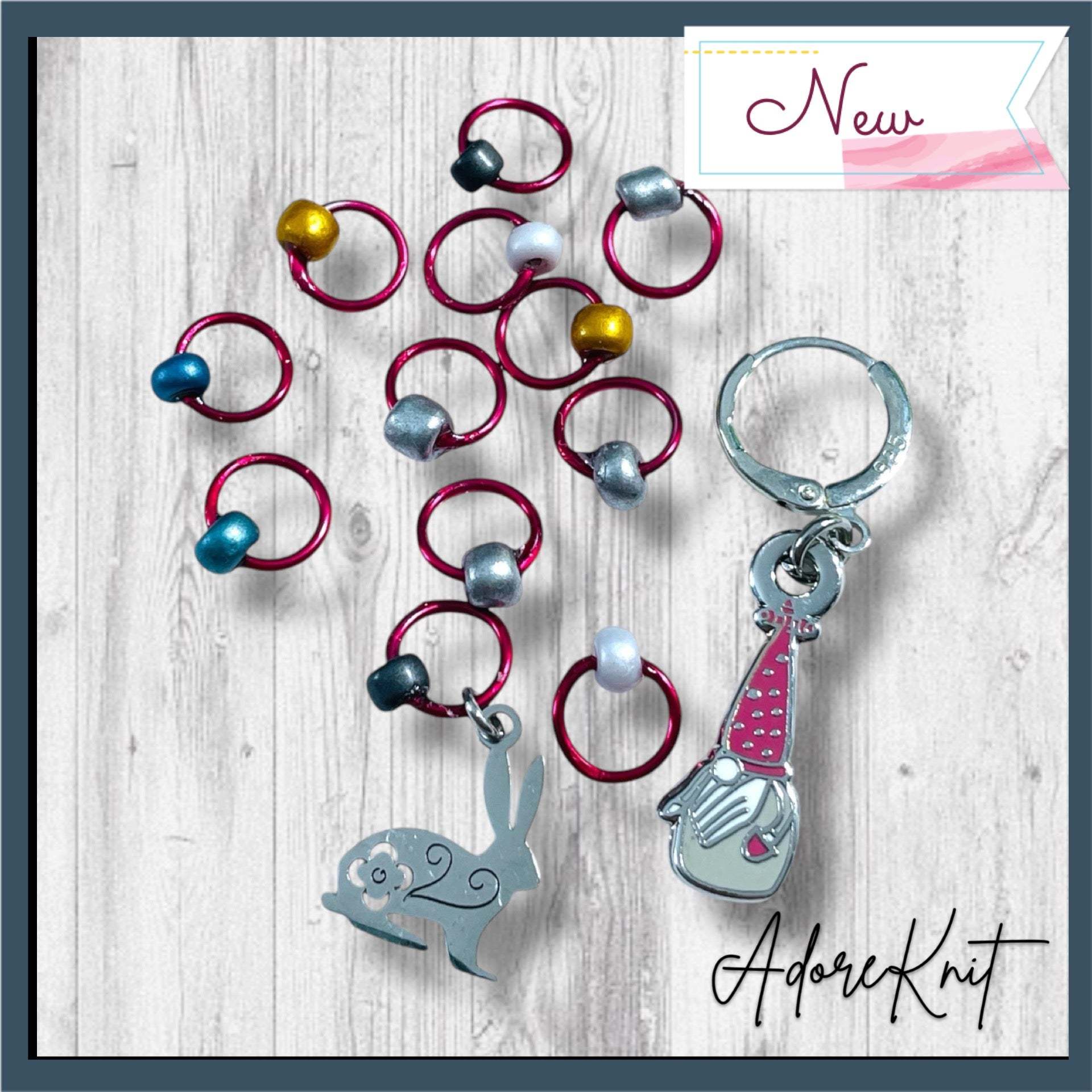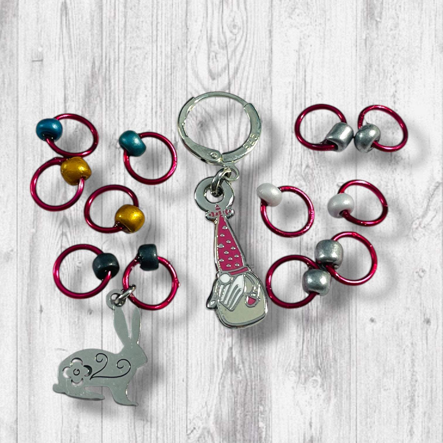 Smoke and Raspberry Jam Gnectar Progress Marker Set: A set of 12 stitch markers with raspberry jam-colored metal alloy rings, accented with sateen beads in spruce, honey, smoke, light gray, and white. Gnectar's sweet bunny buddy is the beginning of the round marker.