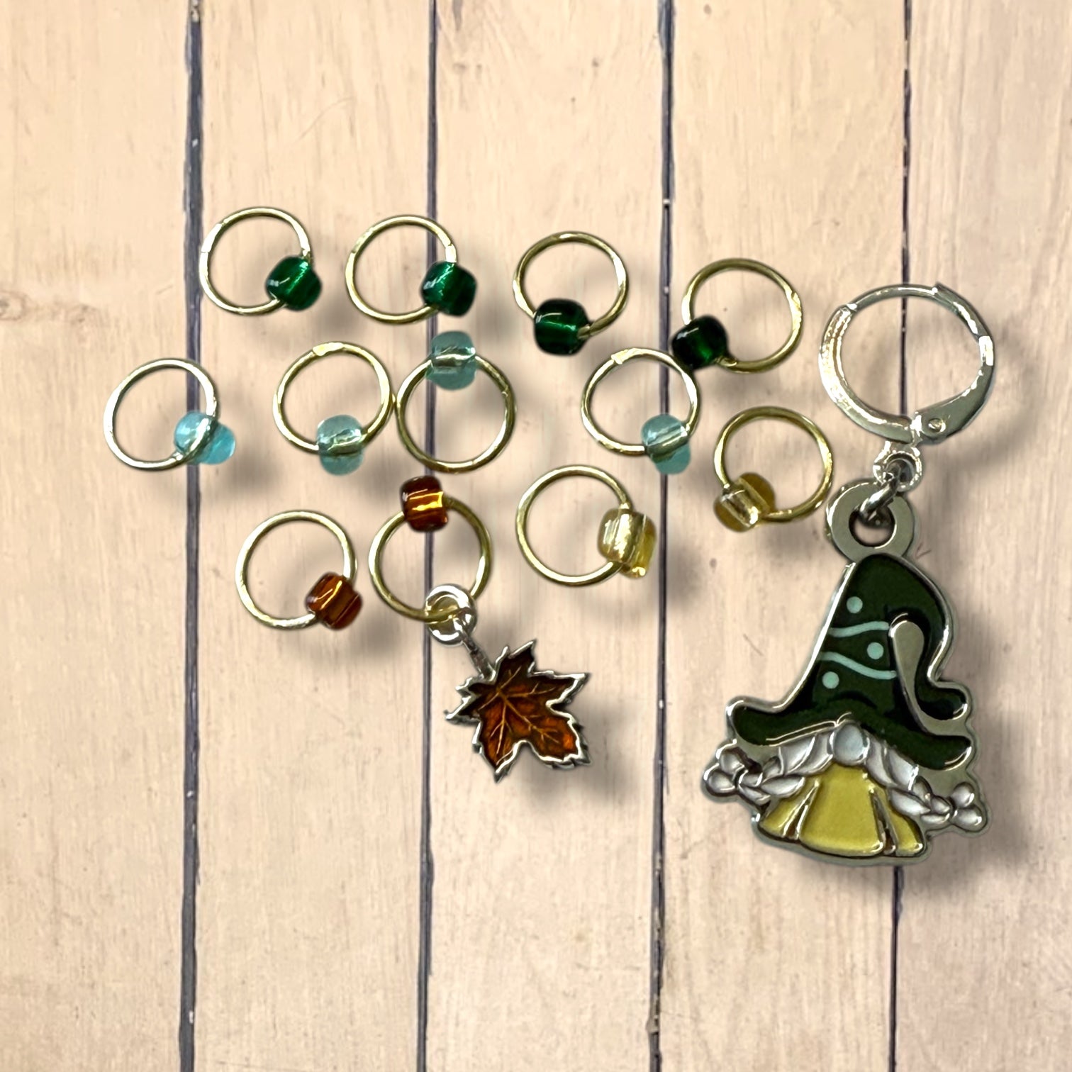 - Gnorah and Leaf Progress & Stitch Marker Set: Rustling leaves, golden light, and a swirl of autumn color, this set captures Gnorah’s love for every leaf-tossed day of fall perfectly. Each of the 12 stitch markers features pale yellow metal alloy rings to match her dress, with clear teal, green, gold, and amber beads. A tiny amber leaf serves as the beginning-of-round marker, a little reminder that Gnorah never arrives at the Gnomeleaf Gathering without a leaf or two tucked in her pocket.