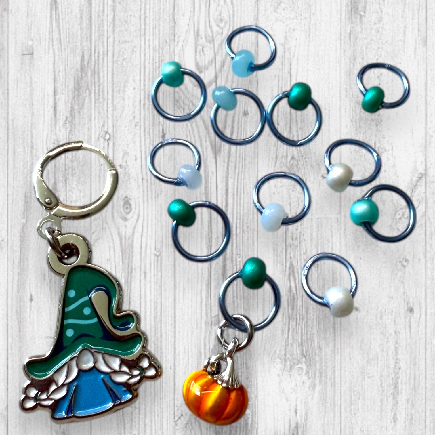 - Gnorah and Pumpkin Progress & Stitch Marker Set: Playful and full of fall charm, this set of 12 stitch markers perfectly captures Gnorah’s cozy autumn spirit. Each features periwinkle blue metal alloy rings to match her dress, with jade, white, and teal beads in a mix of opaque and sateen finishes to complement her outfit. A stout little pumpkin serves as the beginning-of-round marker because of course Gnorah would bring one along to the Gnomeleaf Gathering!