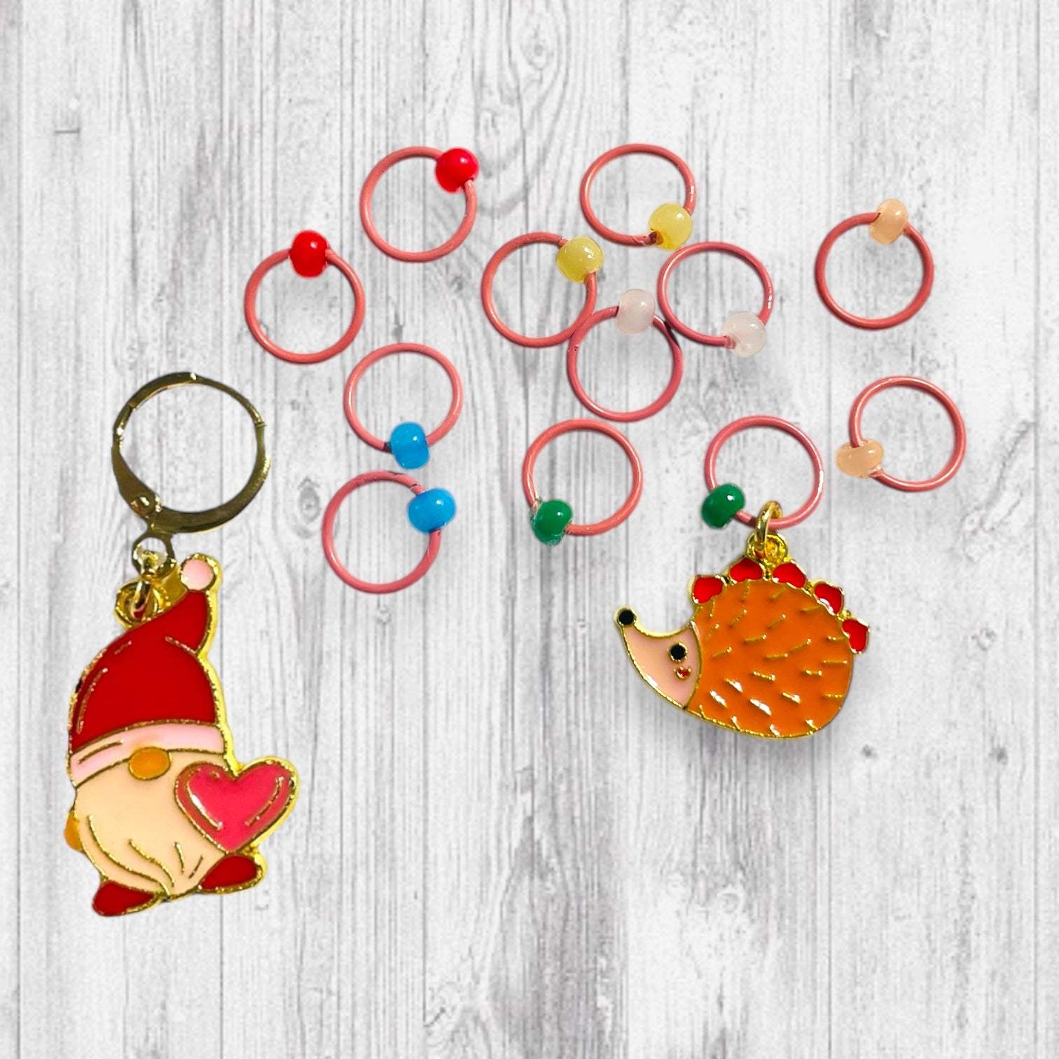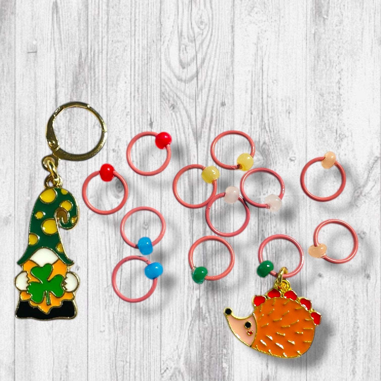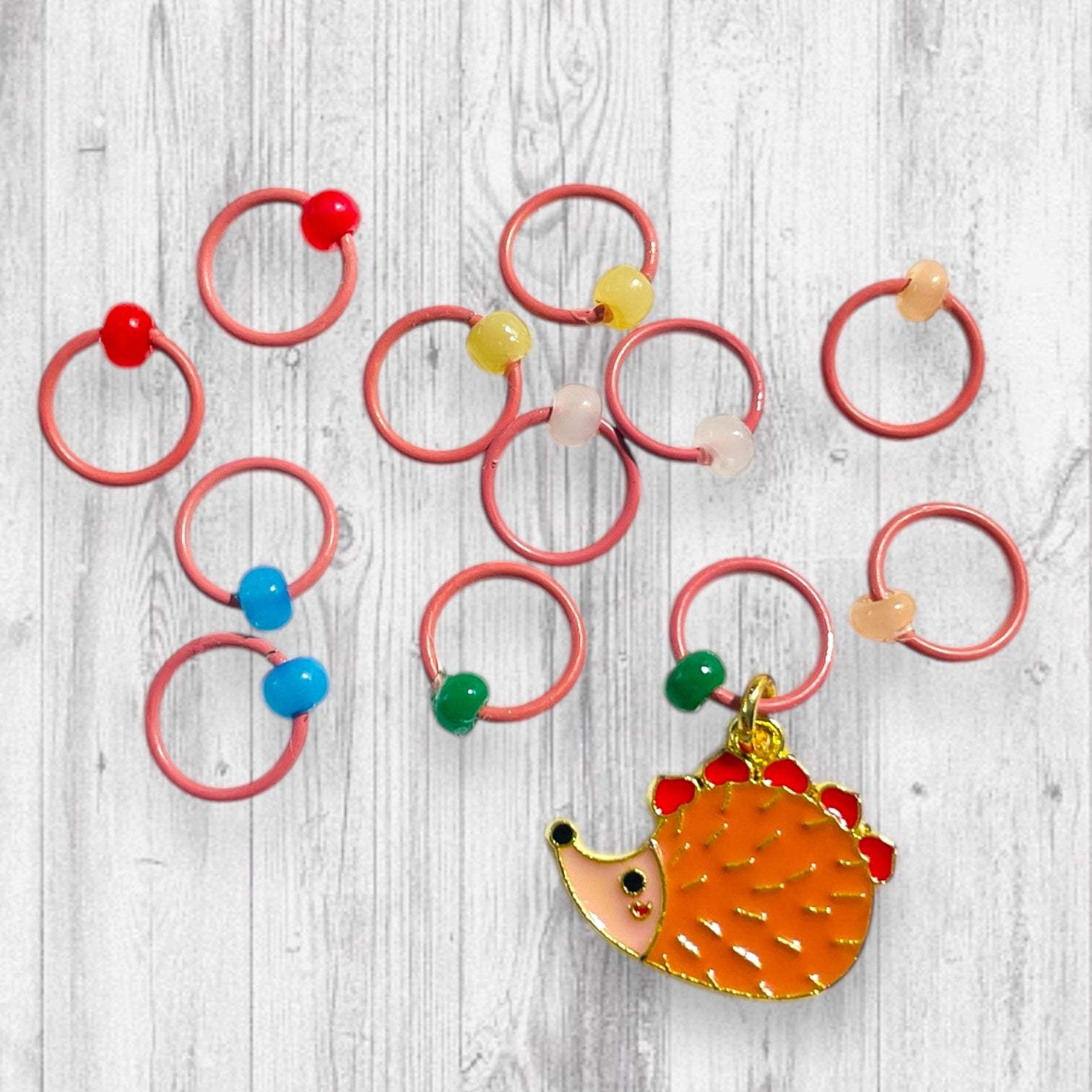 Set of 12 stitch markers: matte gnome nose pink iron coated rings carry opaque beads of yellow, cherry red, clover green, sky blue, peach, and white beads. The beginning of the round marker is a hedgehog, the perfect pet for gnomes