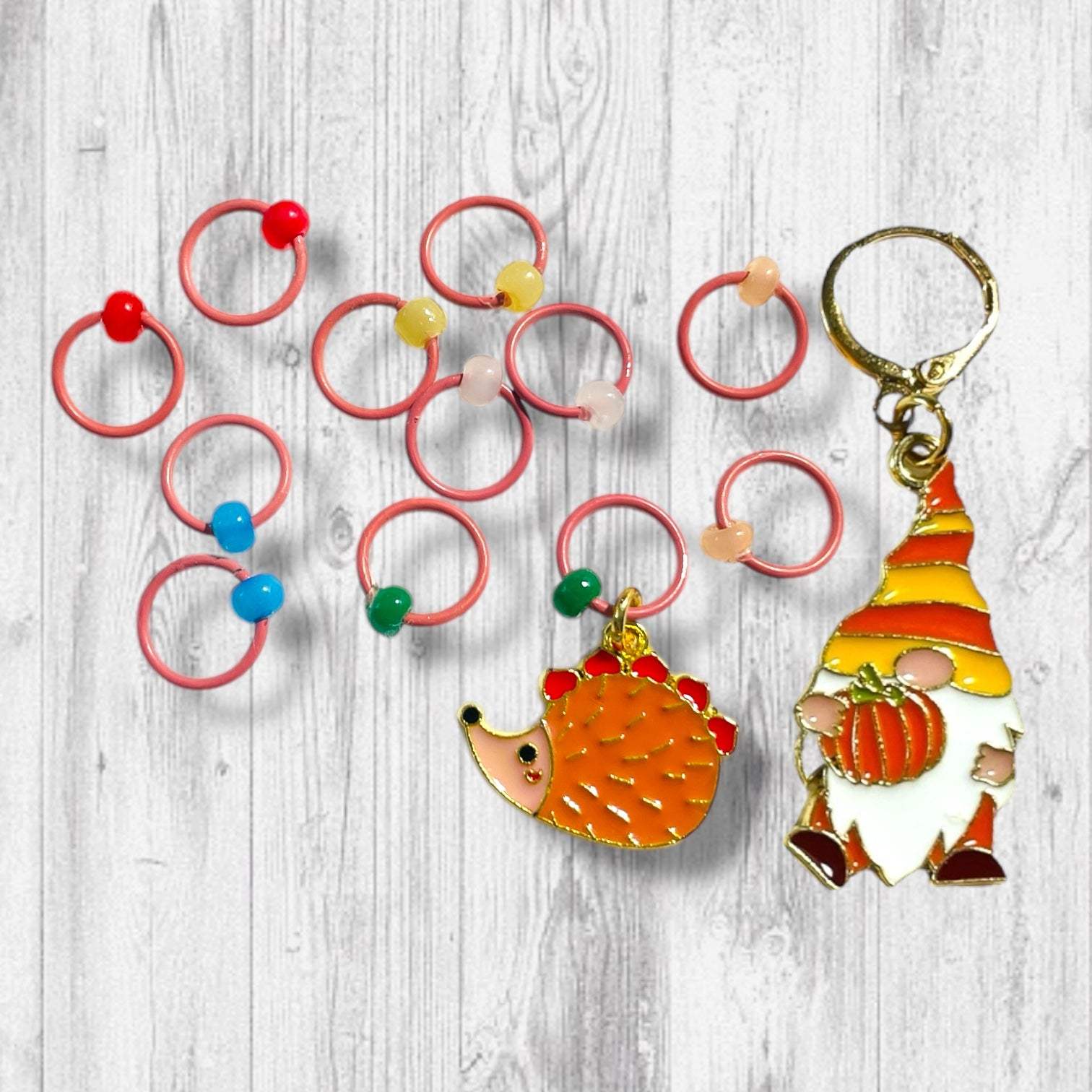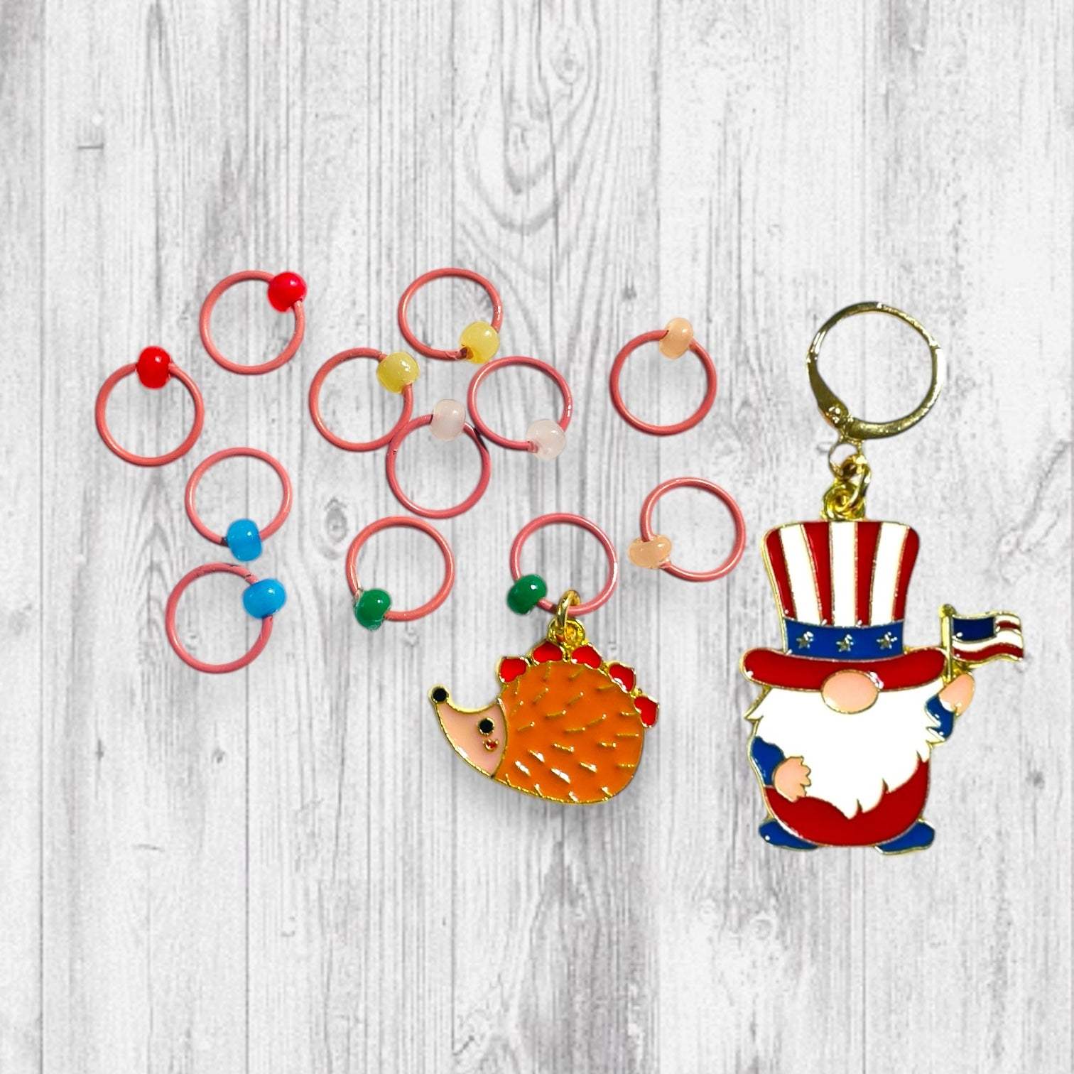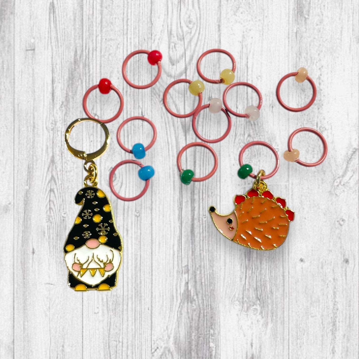 Set of 12 stitch markers: matte gnome nose pink iron coated rings carry opaque beads of yellow, cherry red, clover green, sky blue, peach, and white beads. The beginning of the round marker is a hedgehog, the perfect pet for gnomes