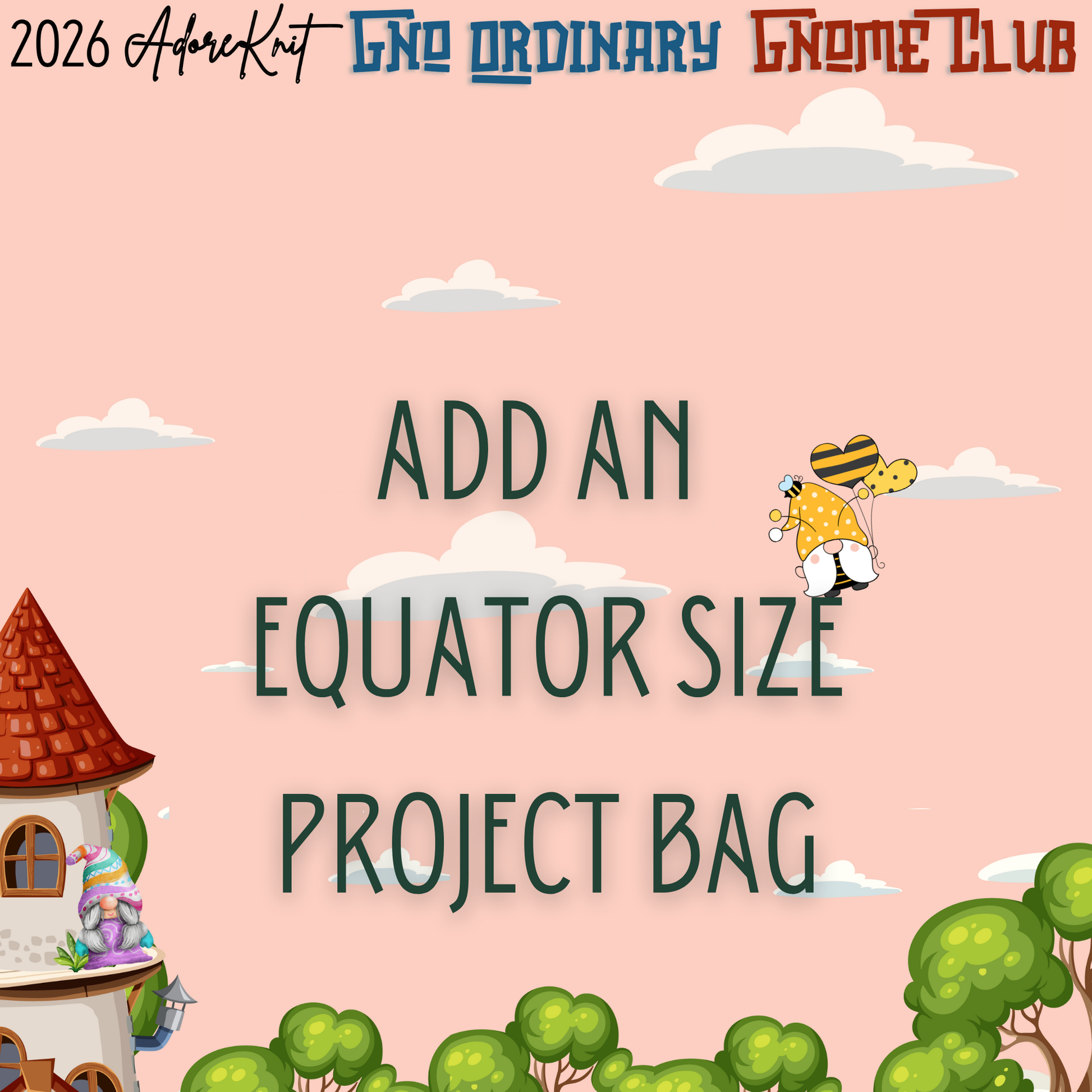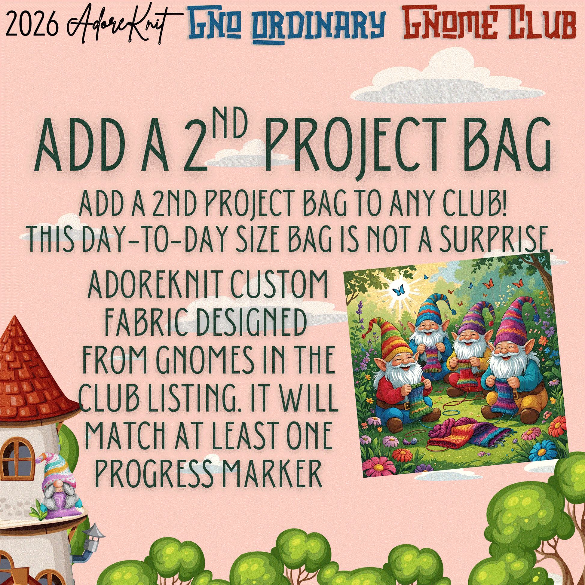 The 2nd smaller project bag is an exclusive to AdoreKnit fabric, featuring the knitting gnomes pictured. This zippered bag, designed to keep your projects and needles secure, measures at least 8” high, 10” wide at the top, with a 6” by 4” rectangular bottom. Perfect for two-skein projects like socks or small shawls, and the exciting part is that it will match at least one of the progress markers included in the club.