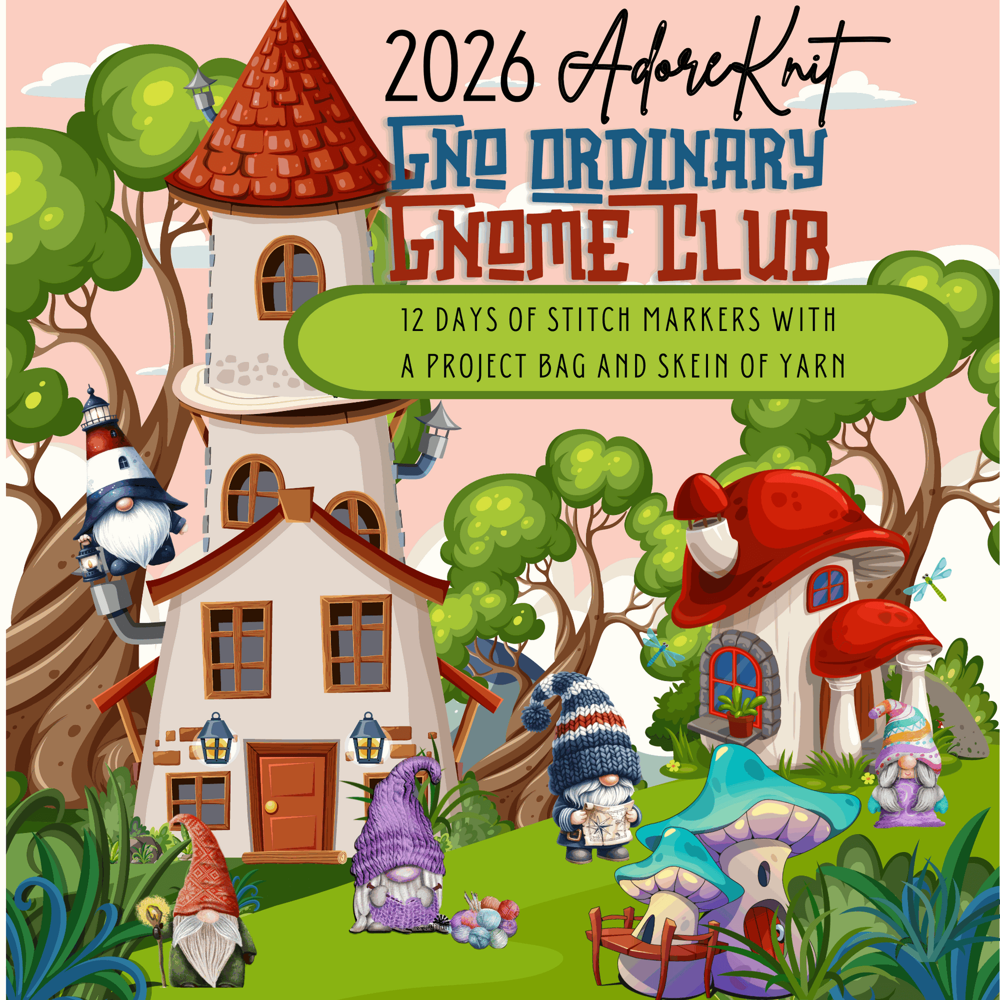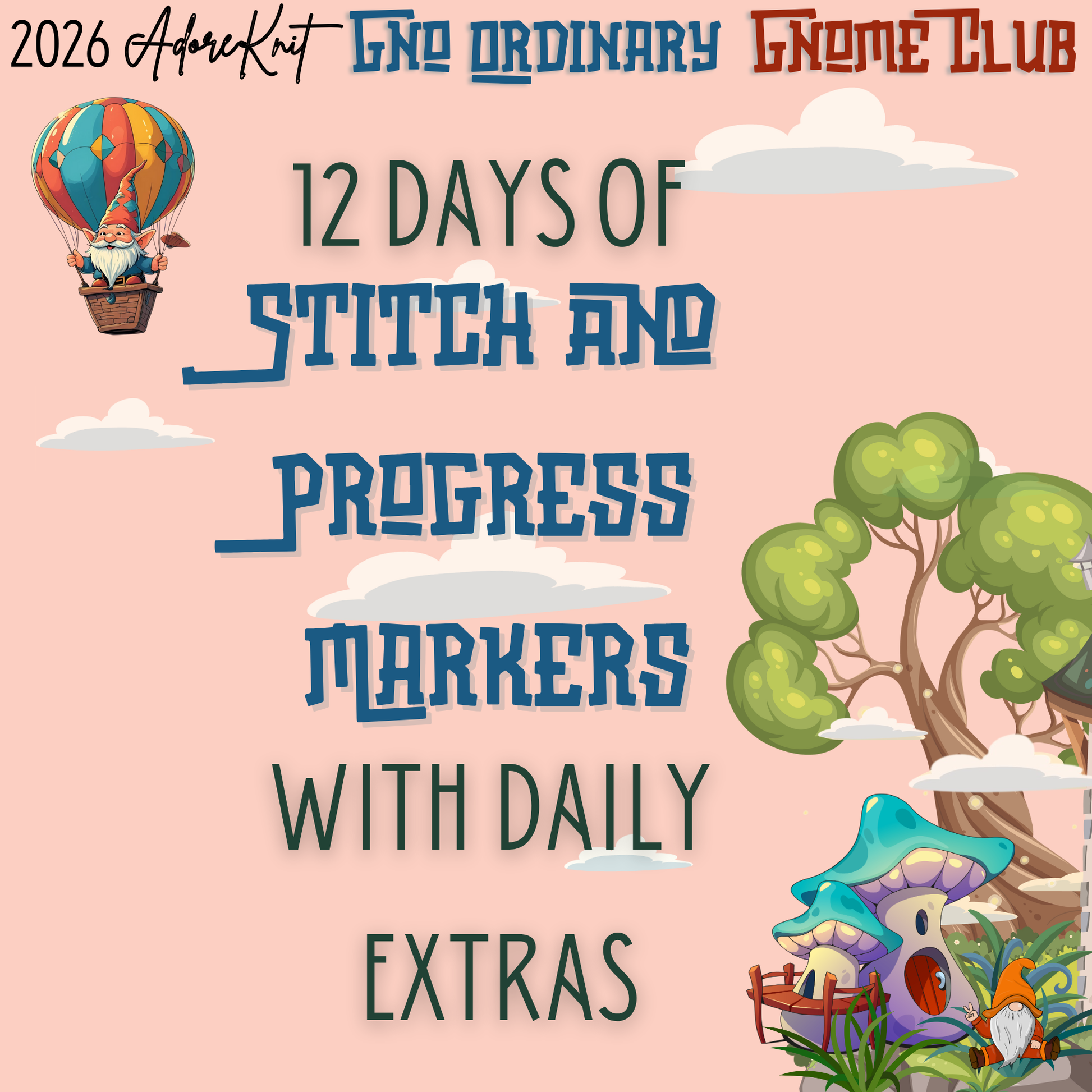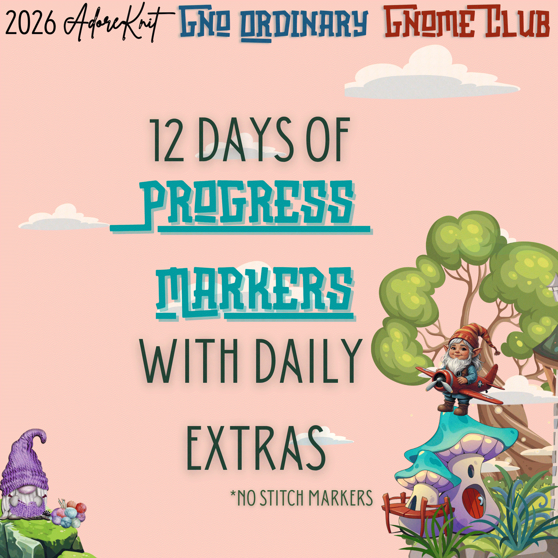 2026 GNo Ordinary GNOMES Countdown Club, 12 Days of Stitch & Progress Markers, Yarn, Project Bags