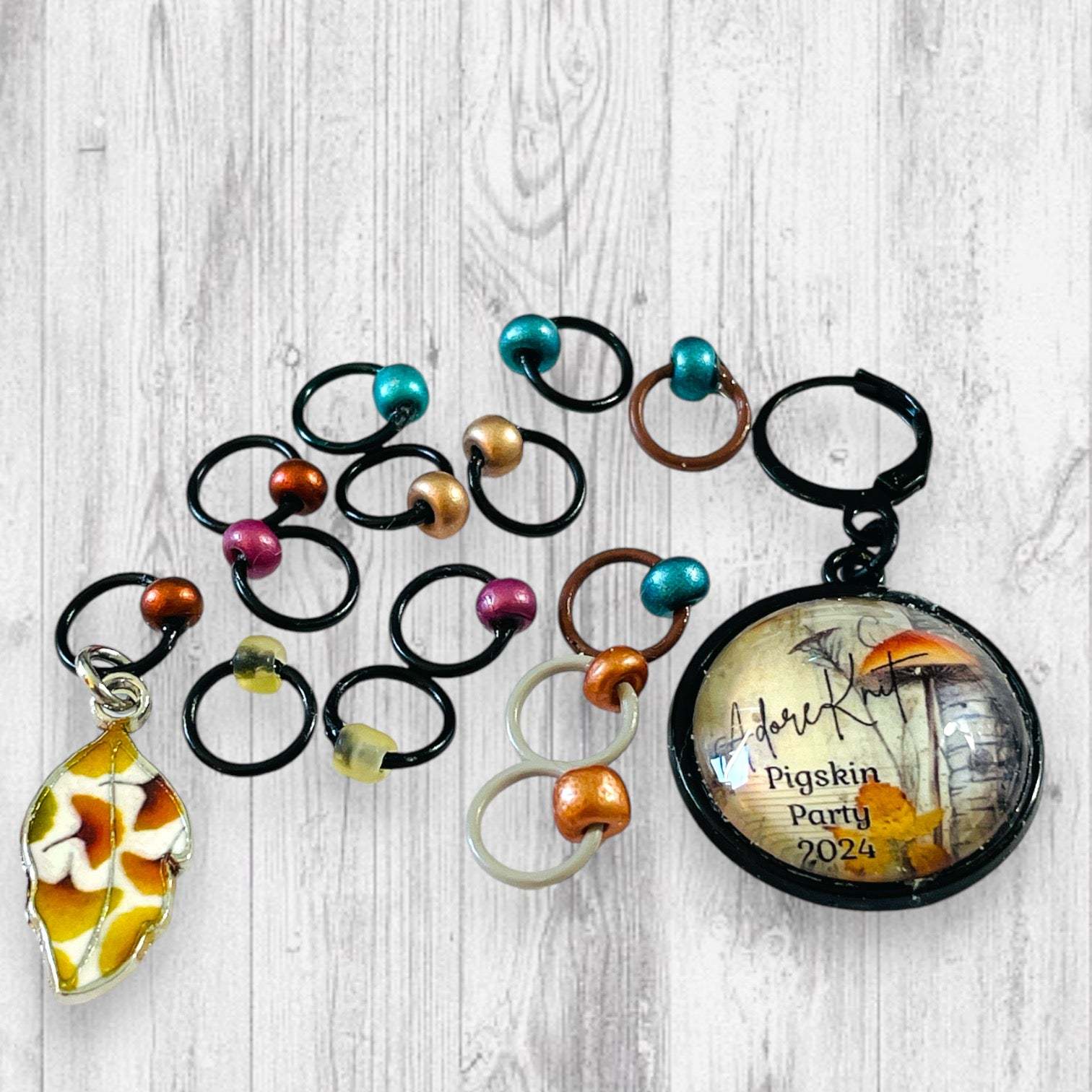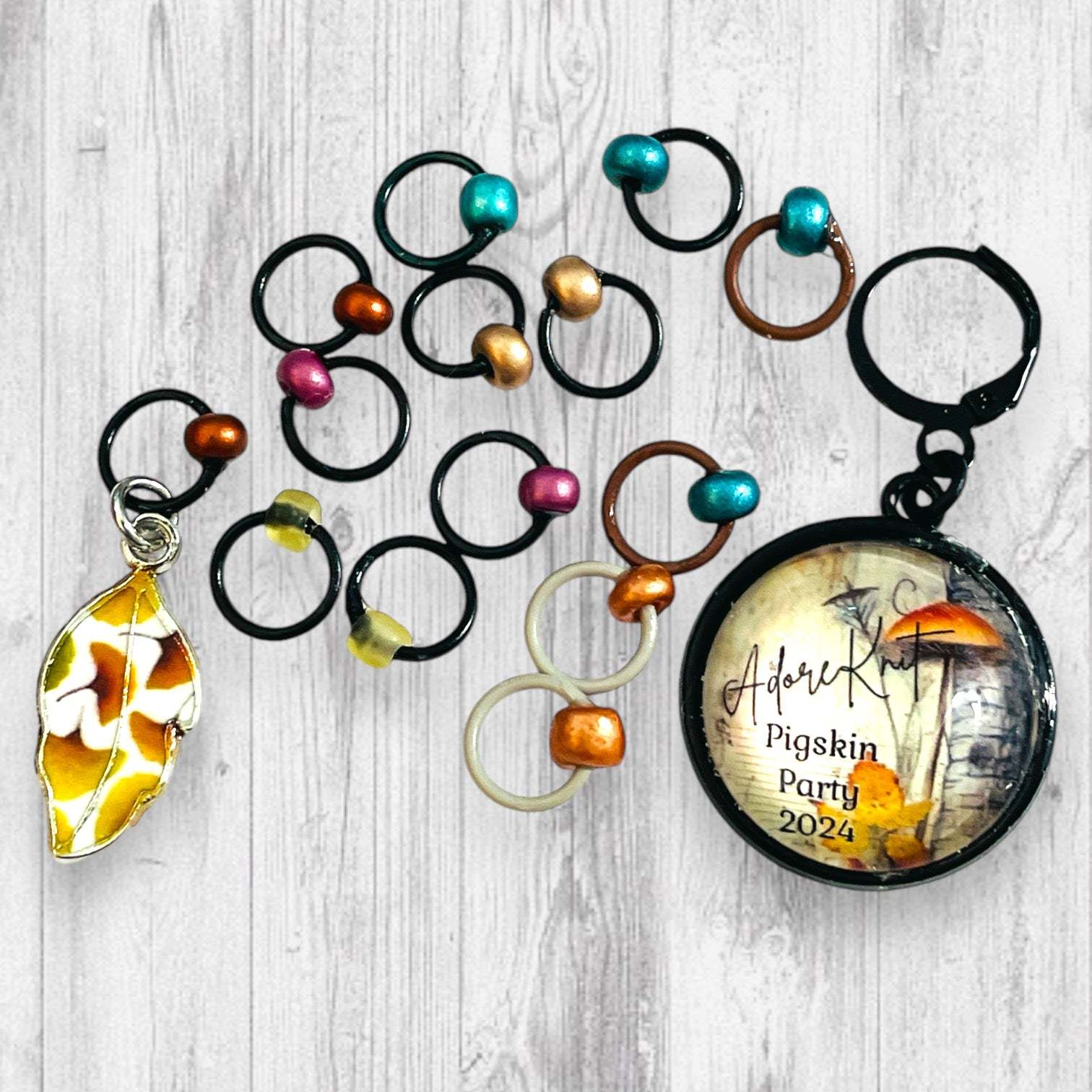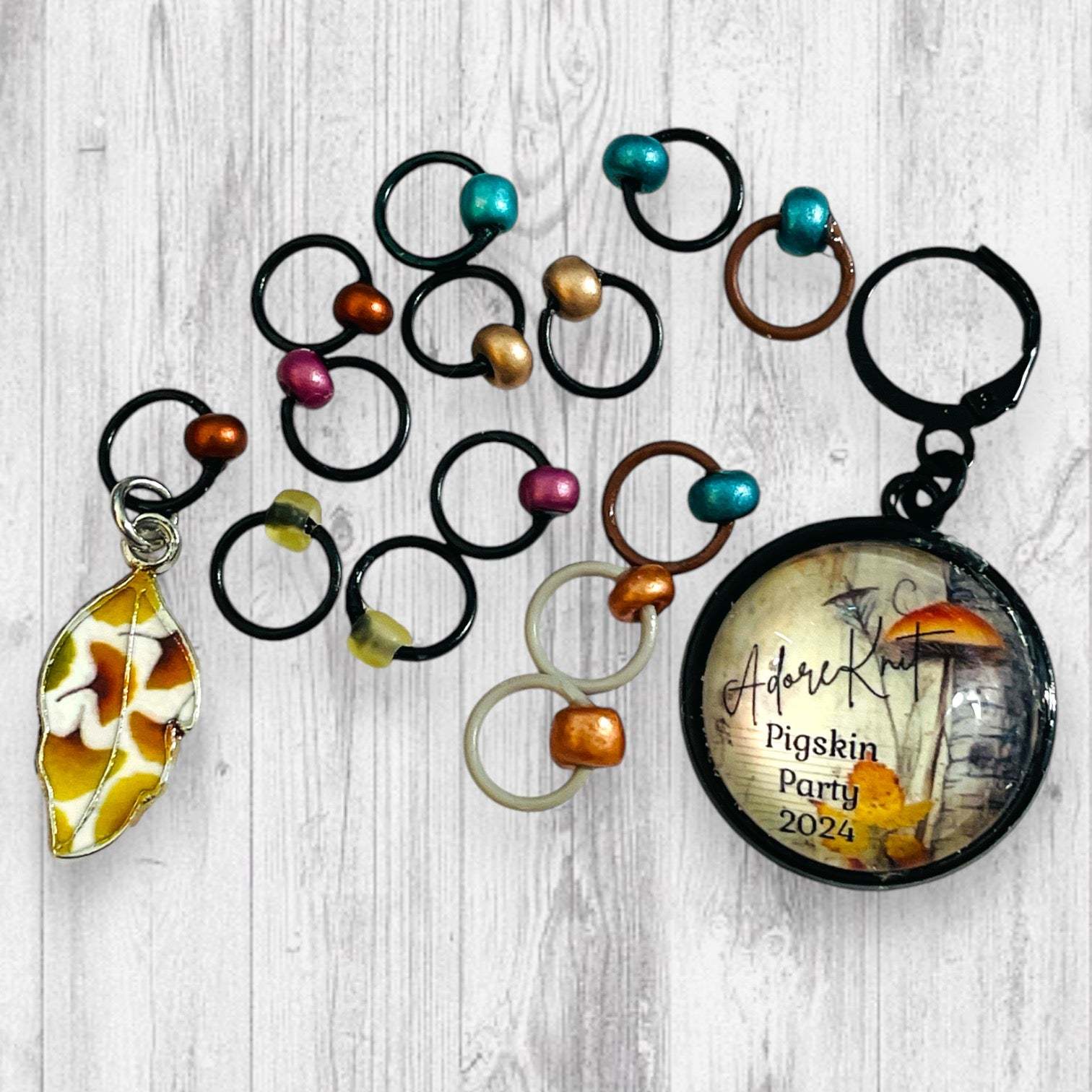 This set includes 12 markers; black, brown and gray iron coated rings carrying saten beads of teal, violet, copper, champagne, and rust color as well as dusty beads of cream color.Ā The perfect atumnal pallet.Ā A leaf shaped leaf with mushrooms on it serves as a beginning of the round marker.Ā The progress marker features a design from the fabric and includes the text "AdoreKnit" and "Pigskin Party 2024".