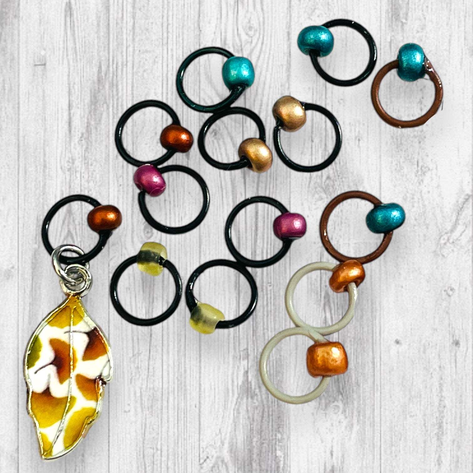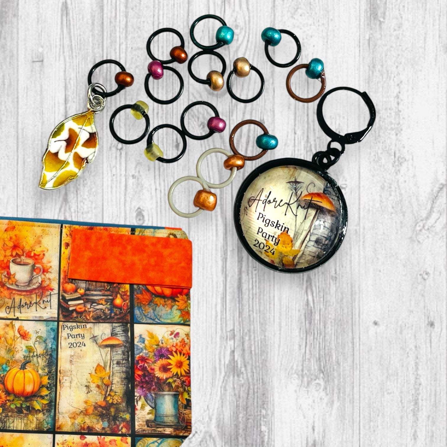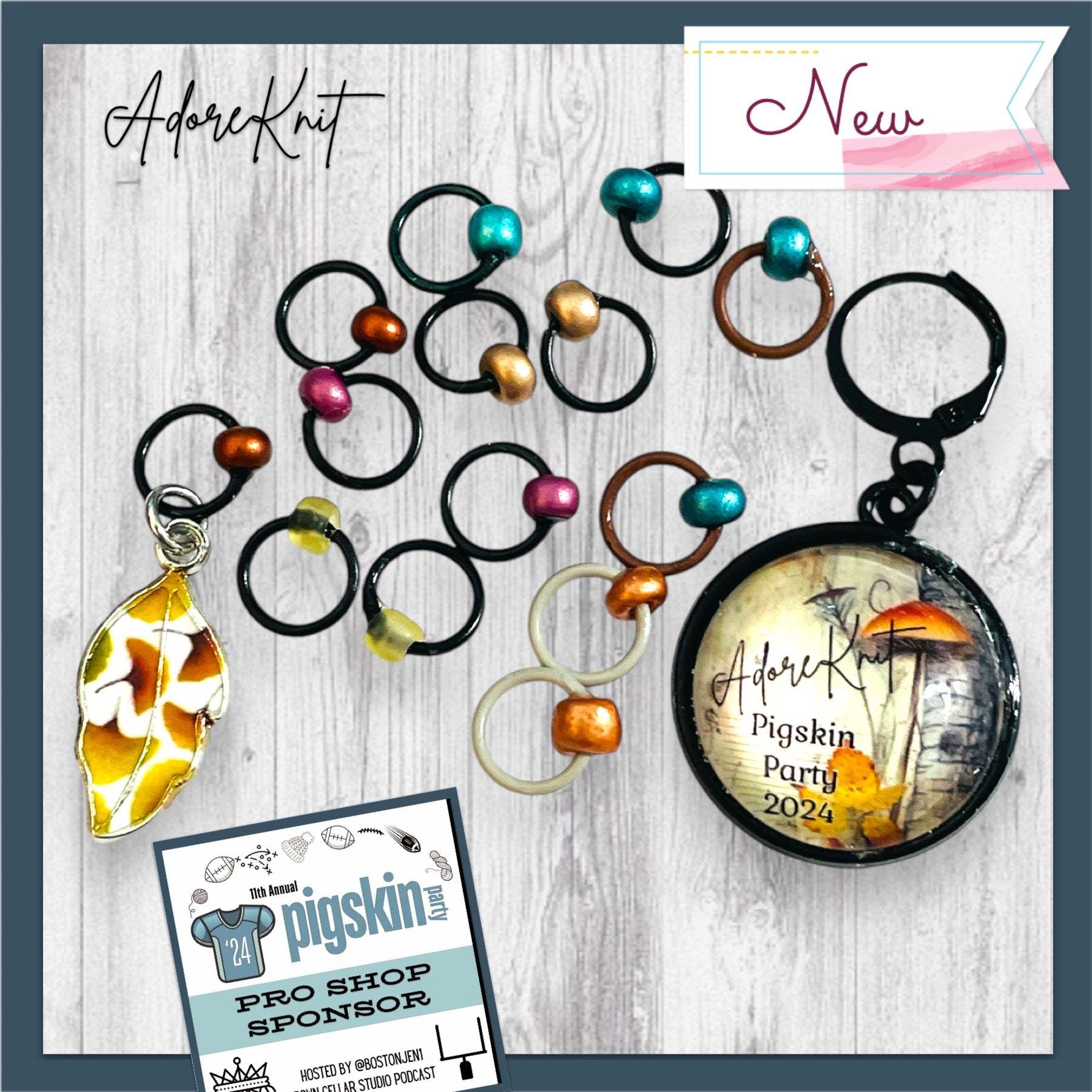 This set includes 12 markers; black, brown and gray iron coated rings carrying saten beads of teal, violet, copper, champagne, and rust color as well as dusty beads of cream color.Ā The perfect atumnal pallet.Ā A leaf shaped leaf with mushrooms on it serves as a beginning of the round marker.Ā The progress marker features a design from the fabric and includes the text "AdoreKnit" and "Pigskin Party 2024".