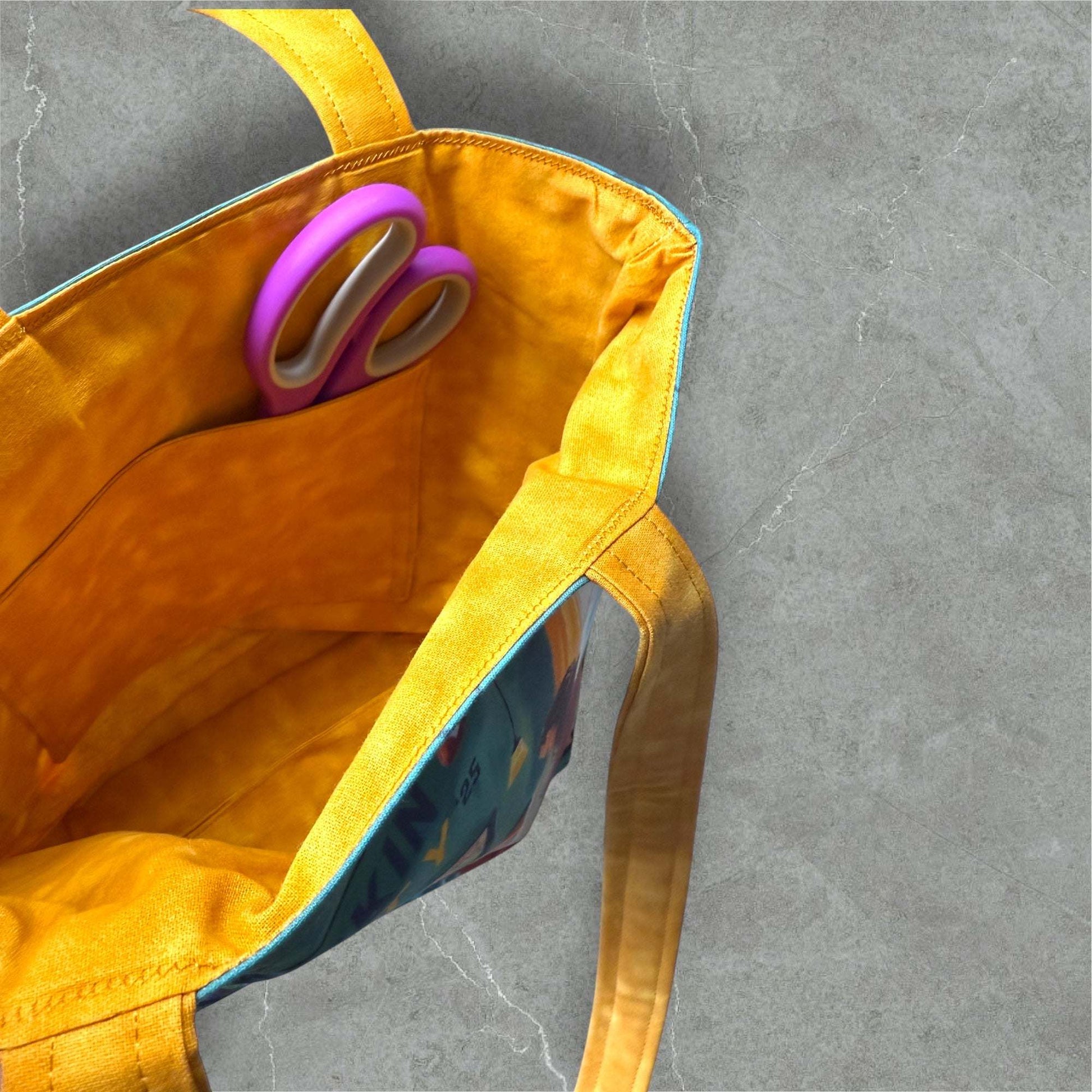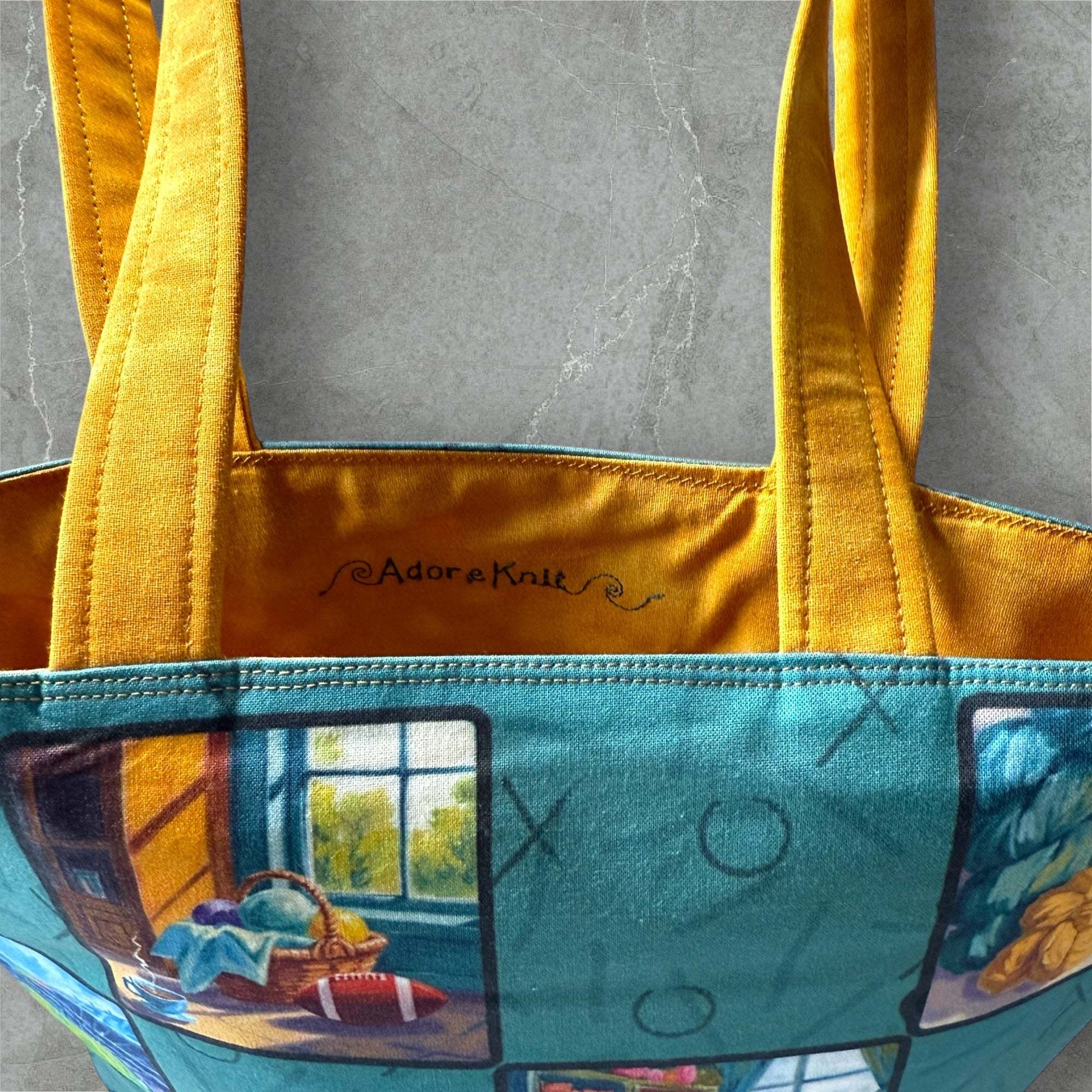 Commuter Tote Bag is our largest sized bag, made to a minimum of 12” high, 16” wide at the top, with a rectangular bottom of 12” by 4”. This bag is an open-mouthed bag, it does not have a zipper. Sturdy straps allow you to carry the bag without losing its shape. The bag will comfortably fit six or even eight skein projects and is ideal for sweaters, larger shawl projects, and even blankets. Or throw all your other project bags in this one.