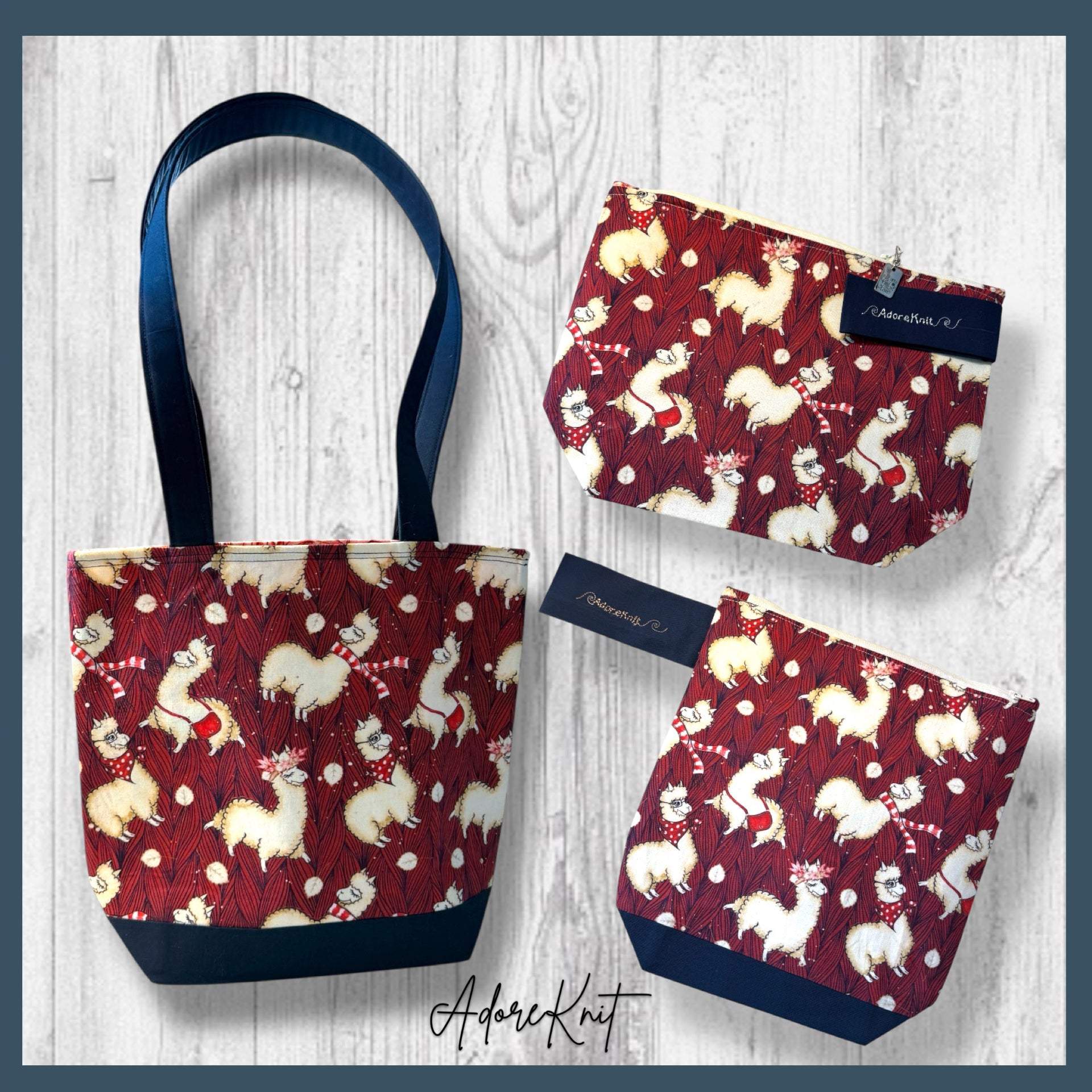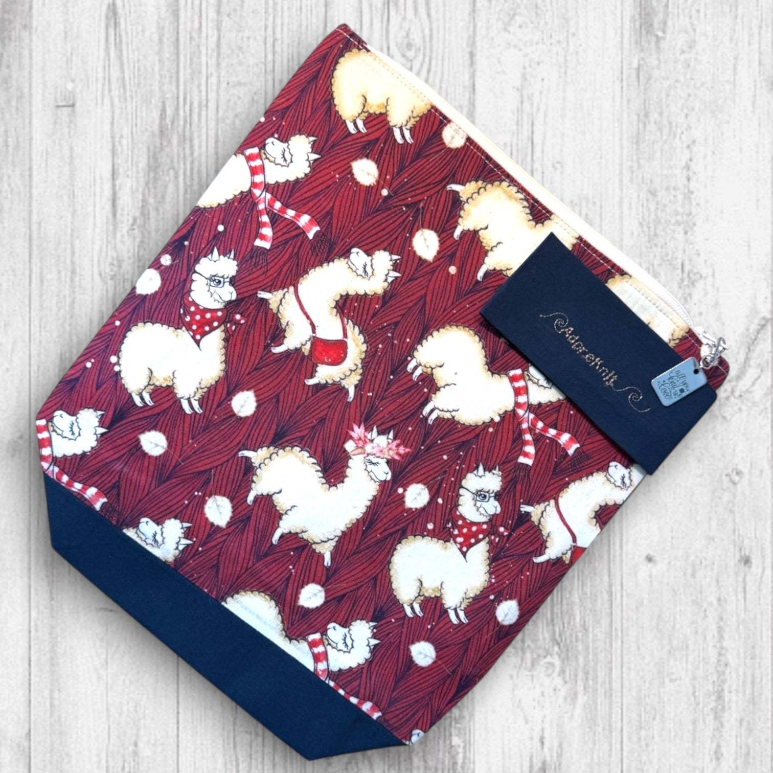 The zippered project bags are designed to keep knitting or crochet projects protected and organized. They are fully lined and interfaced so they hold their shape while keeping yarn, needles, and works in progress safely tucked inside. Each bag includes a decorative zipper pull, a wrist strap, and an embroidered AdoreKnit logo. The zipper pull is removable and can double as a progress keeper when needed. The wrist strap and contrast navy bottom coordinate with the zipper ends, while the interior is finished in a bright, cheerful zigzag fabric.
