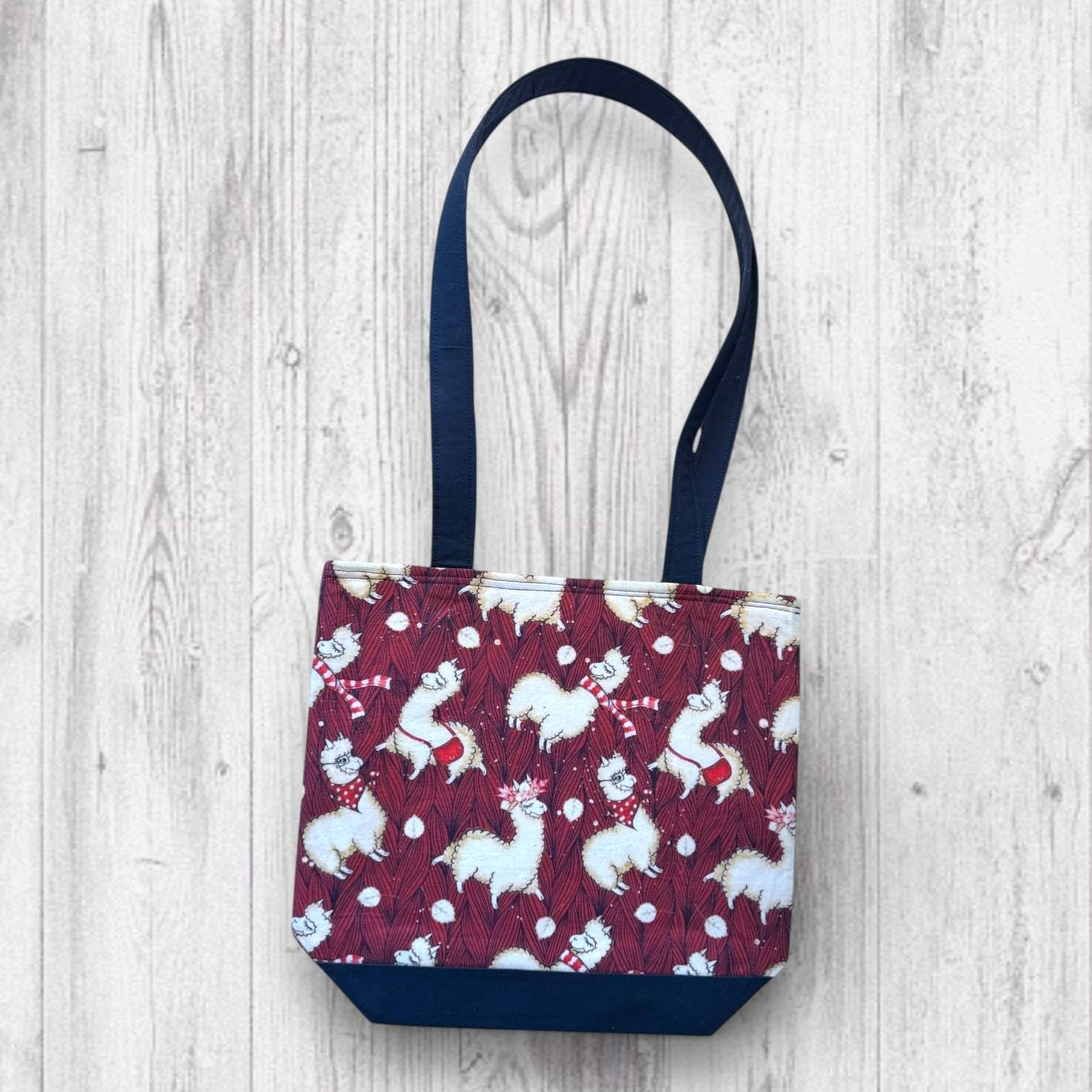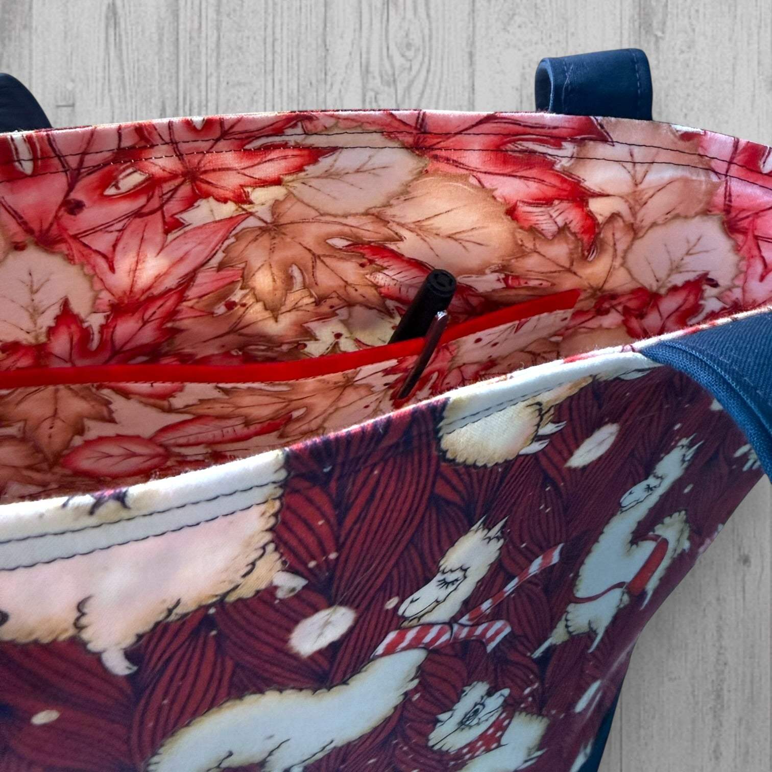 The Alpaca Your Bags Tote Bag features artwork you may recognize, now paired with a new contrasting navy bottom and expanded size options. It is available as zippered project bags in Day-to-Day, Extra Tall Day-to-Day, and Equator sizes, as well as the Voyager Tote. The Extra Tall Day-to-Day and the Voyager Tote feature the contrast navy bottom.