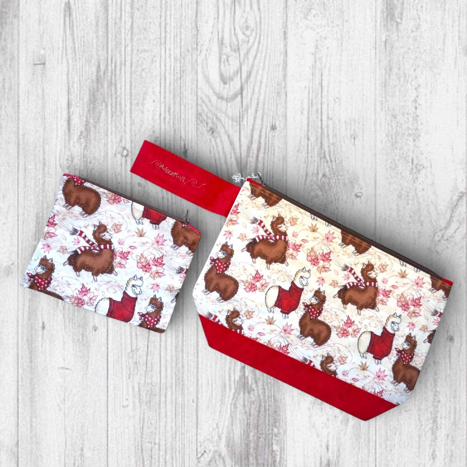 The zippered project bags are designed to keep knitting or crochet projects protected and organized. They are fully lined and interfaced so they hold their shape while keeping yarn, needles, and works in progress safely tucked inside. Each bag includes a decorative leaf zipper pull, a wrist strap, an embroidered AdoreKnit logo, and a contrasting red bottom. The zipper pull is removable and can double as a progress keeper when needed. The wrist strap and contrast red bottom coordinate with the zipper ends, while the interior is finished with a coordinating leaf print.