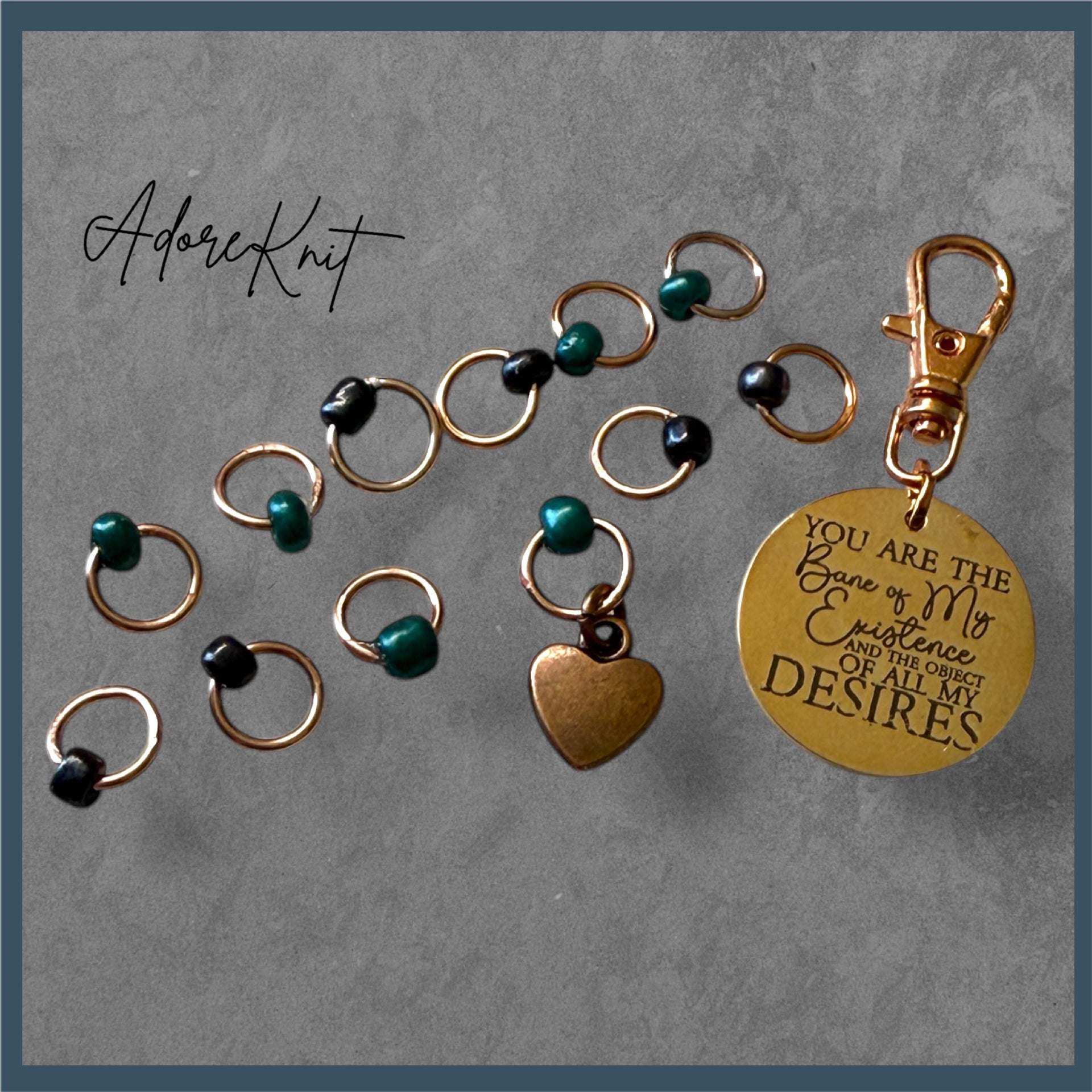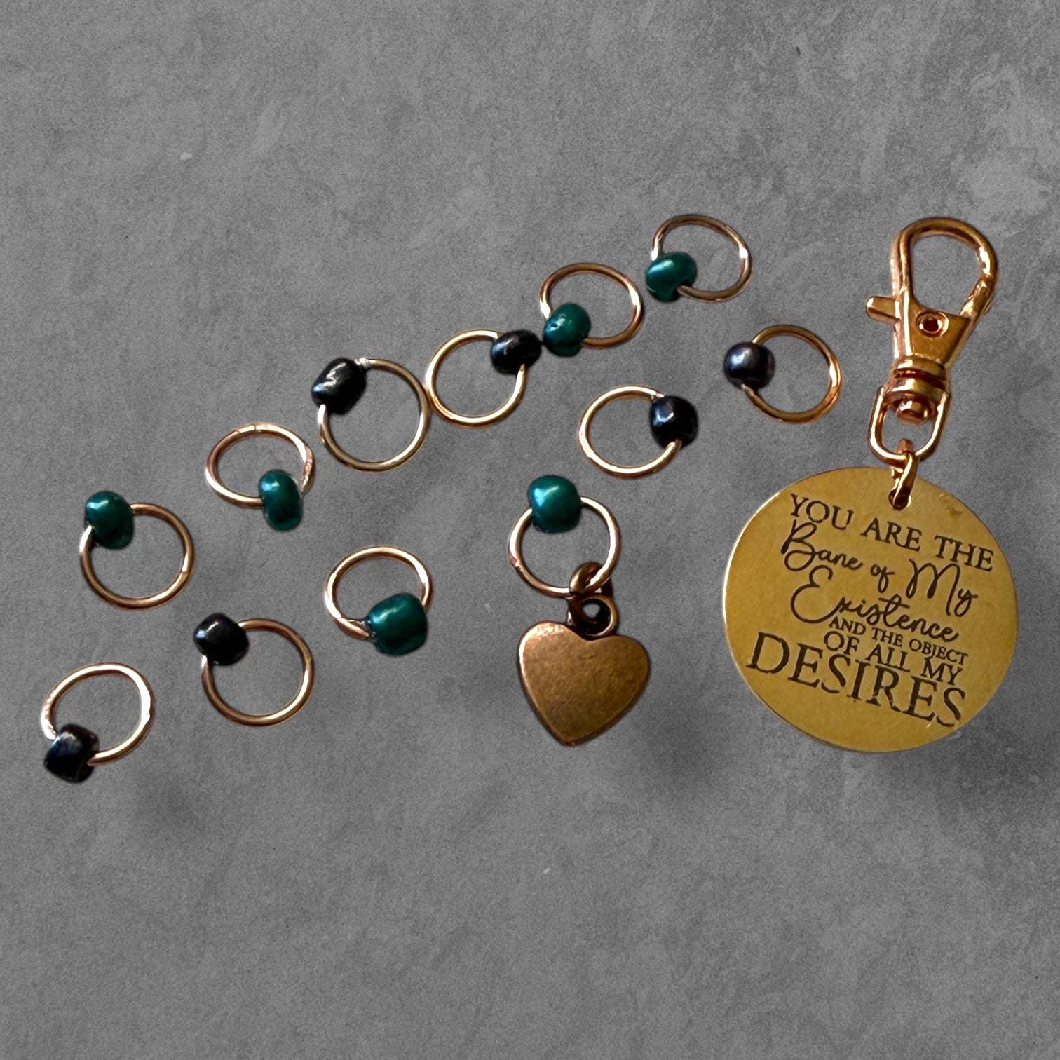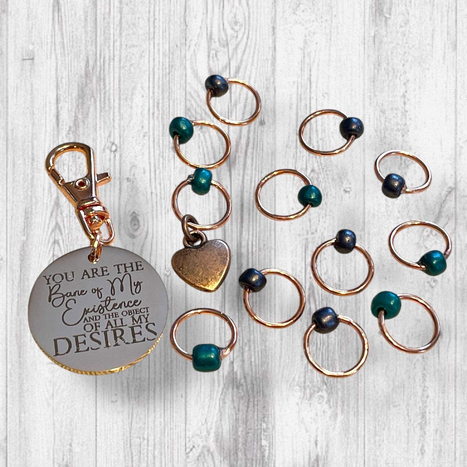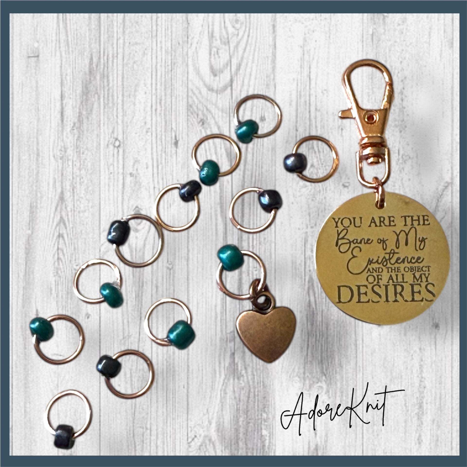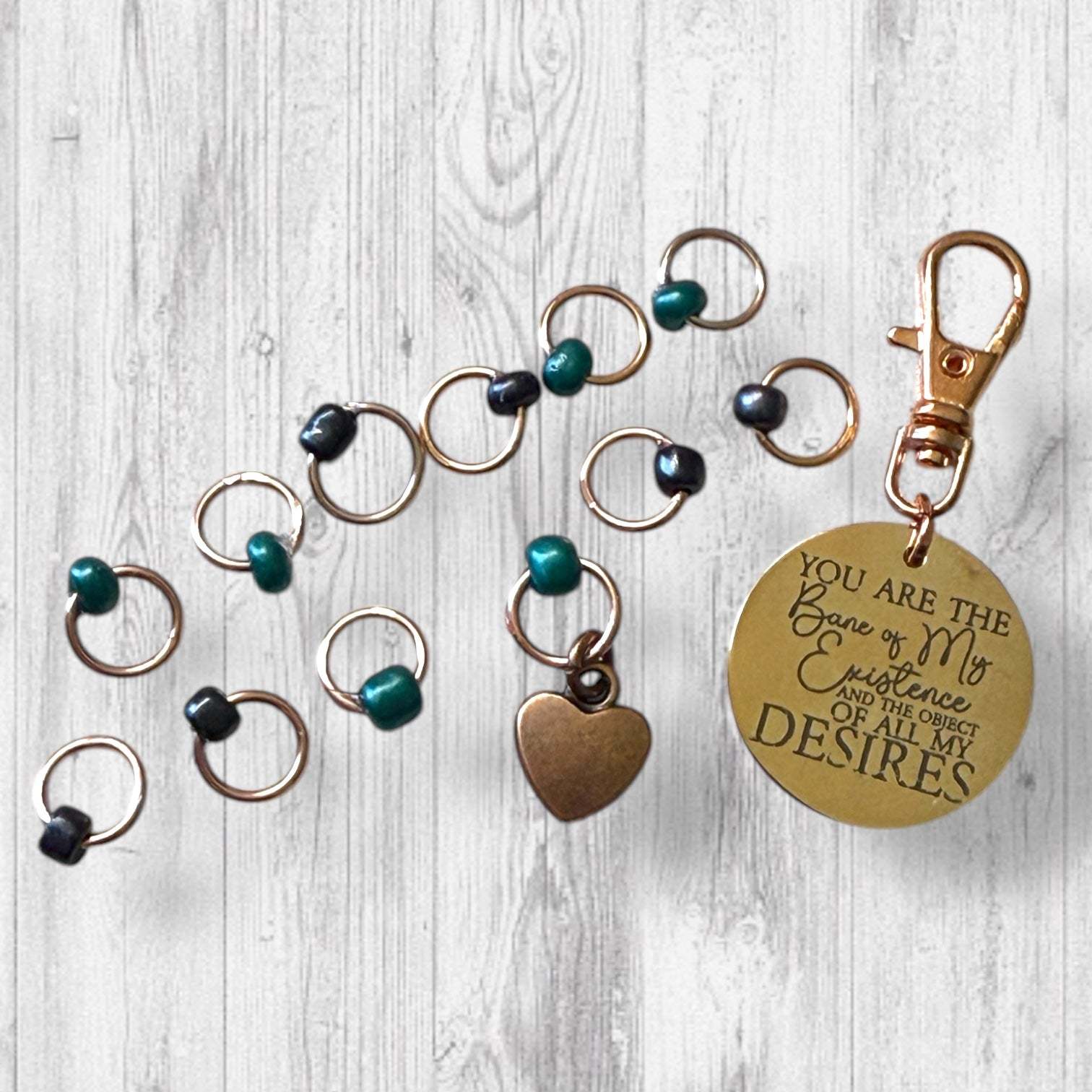 The Bane of My Existence Stitch Marker Set is a tribute to passion wrapped in propriety, and longing barely disguised by wit. Inspired by the slow-burn brilliance of Anthony Bridgerton and Kate Sharma, this collection is for those who know that love can be equal parts frustration and fire. Made for knitters and crocheters who appreciate enemies-to-lovers arcs, smoldering glances, and a little dramatic flair in every stitch. Perfect for anyone who stitches by candlelight (or at least dreams of it), this set adds a touch of brooding elegance and graceful beauty to your knitting or crochet