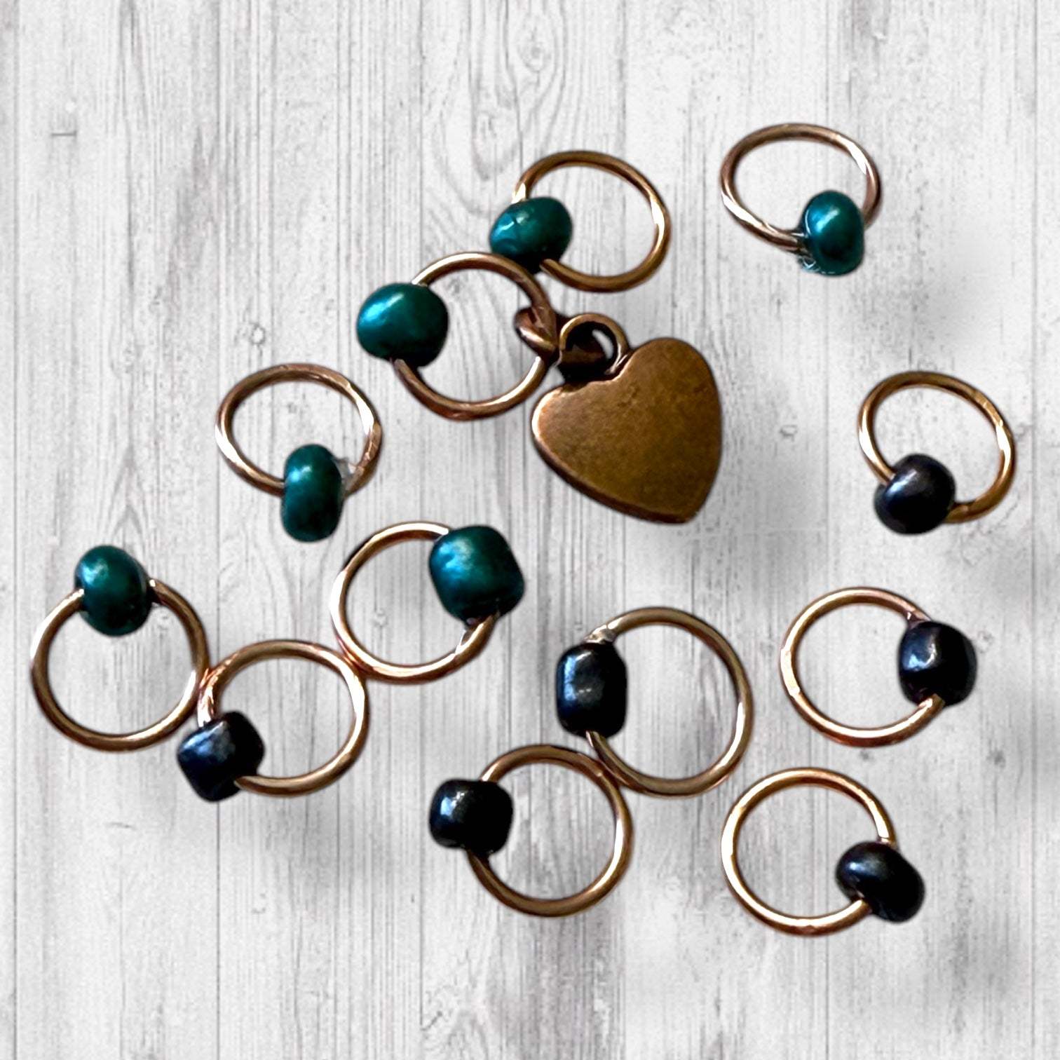 This set of 12 stitch markers features metal alloy rose gold rings carrying shiny beads of dark navy and spruce green.