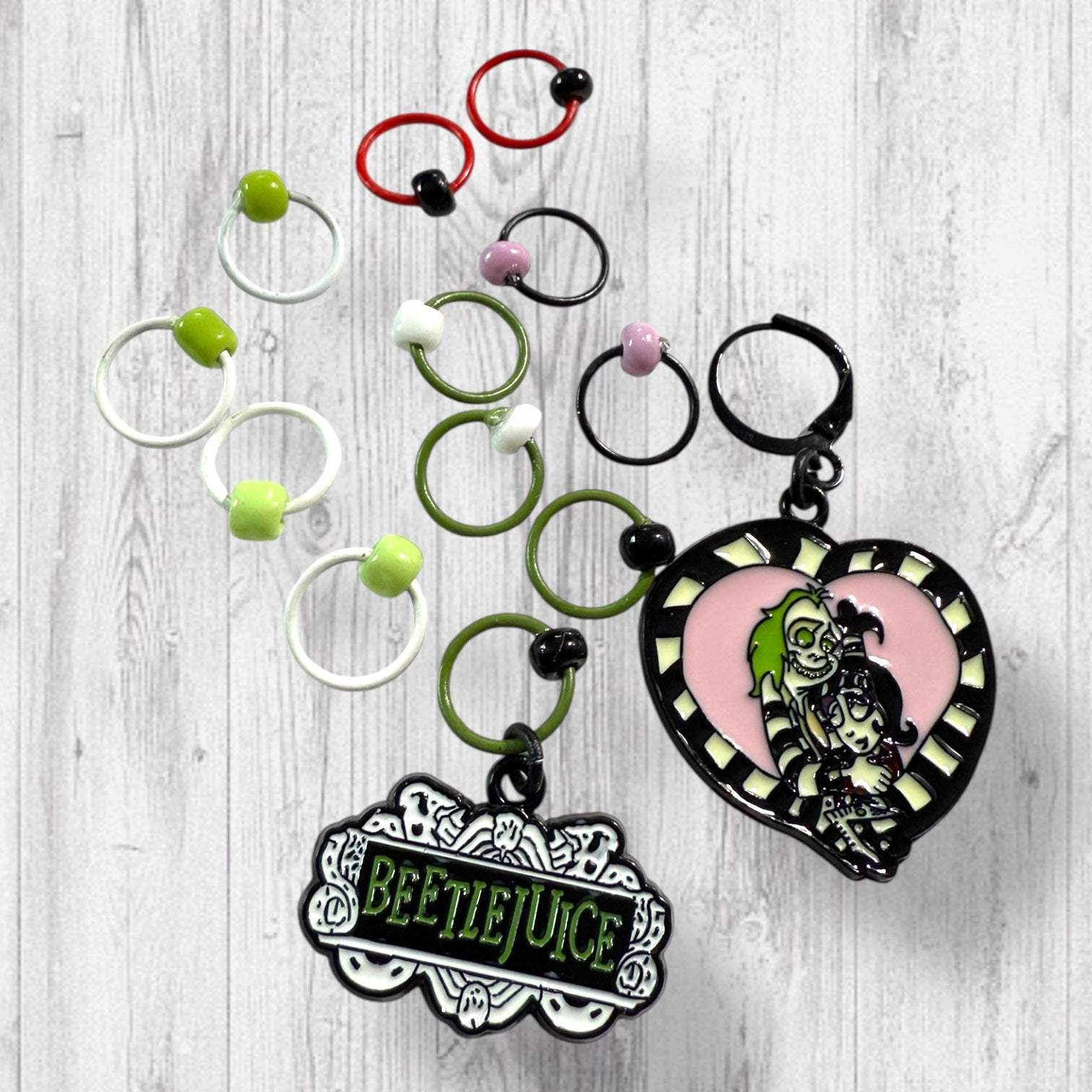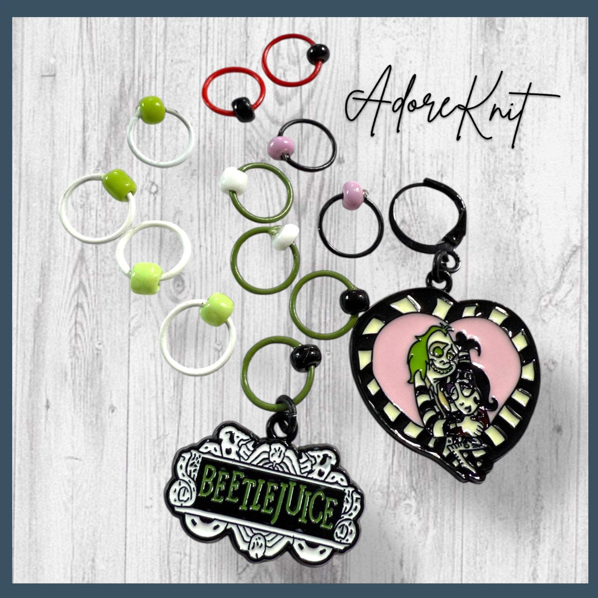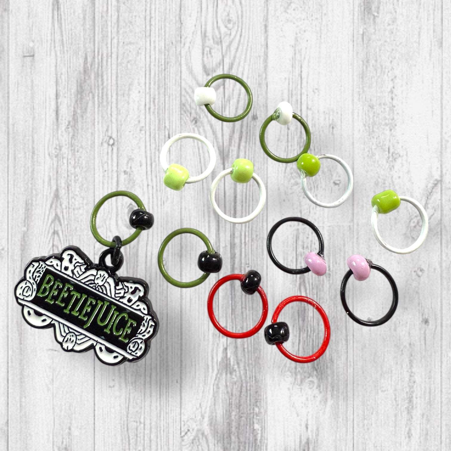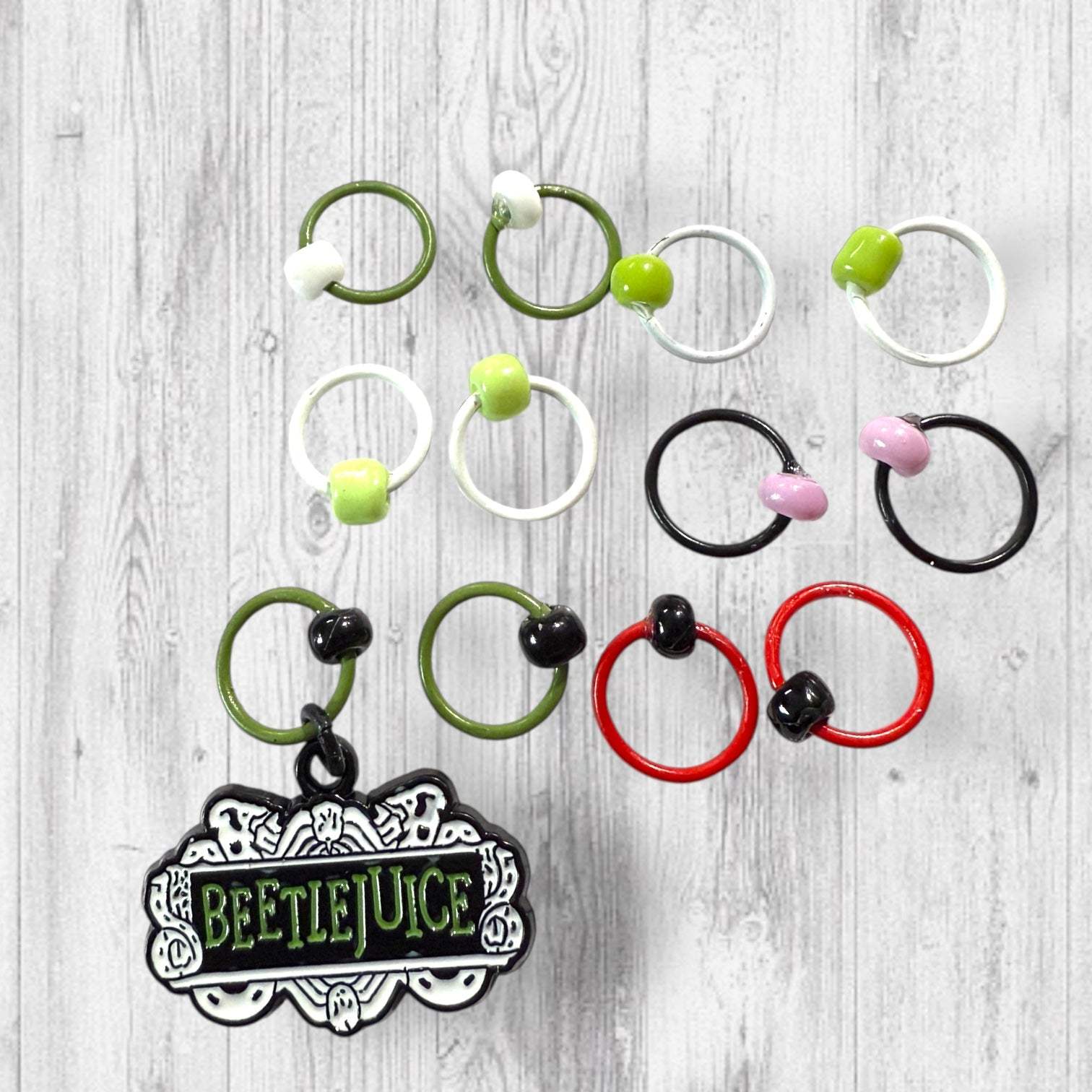 * A Set of 12 Stitch Markers including a "Beetlejuice" sign beginning of round marker or