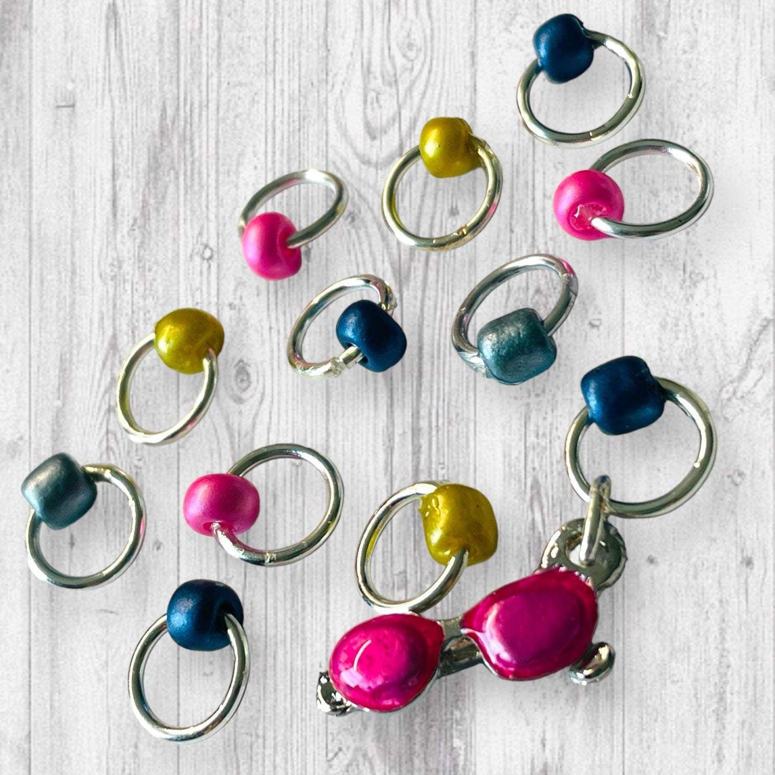 Set of 12 stitch markers; bright silver metal alloy rings carry saten beads of navy, pink, golden and slate gray.