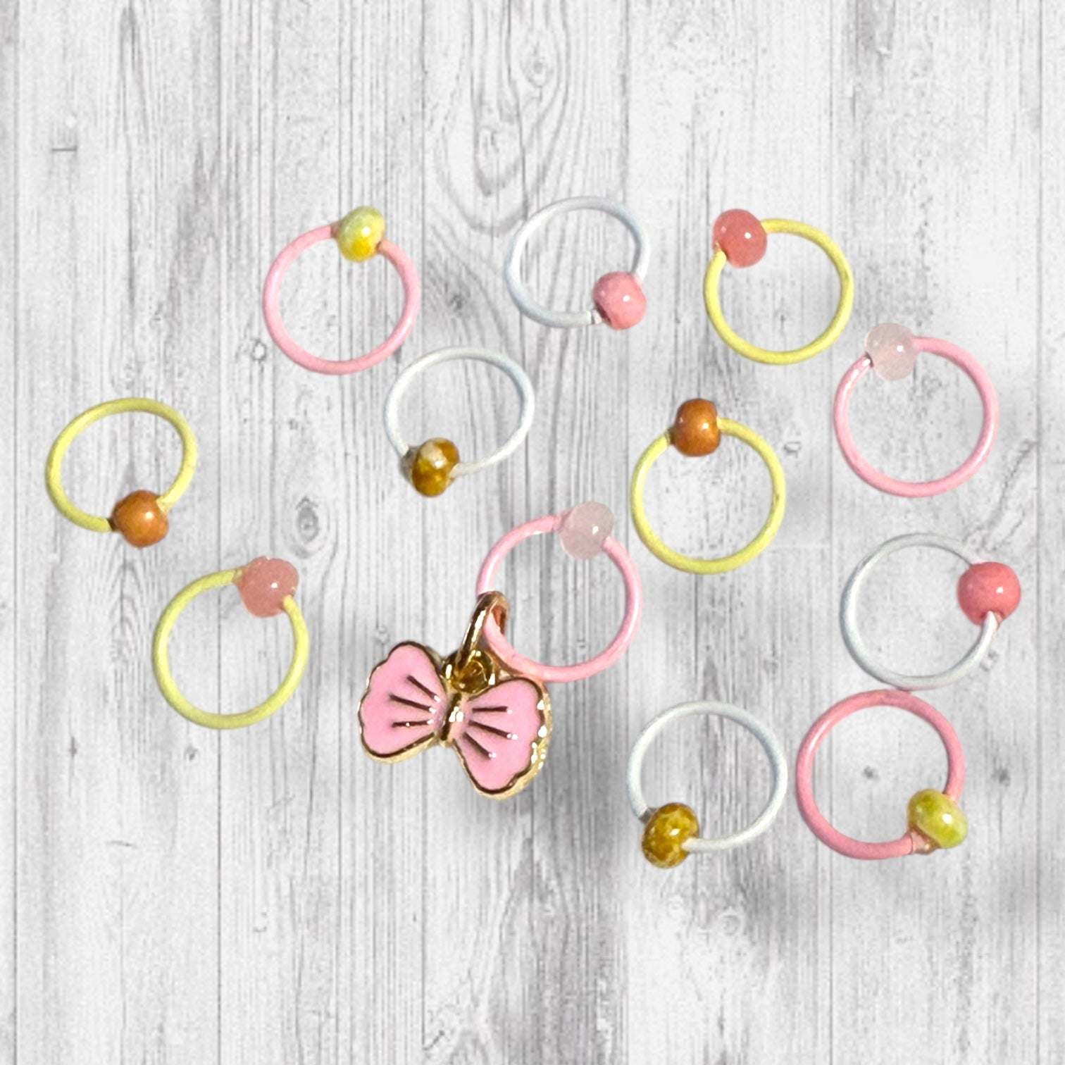 Set of 12 stitch markers featuring iron-coated rings in pale pink, yellow and white. Each ring holds a shiny bead in shades of pink and yellow and marigold to match Buzzabelle's hat.