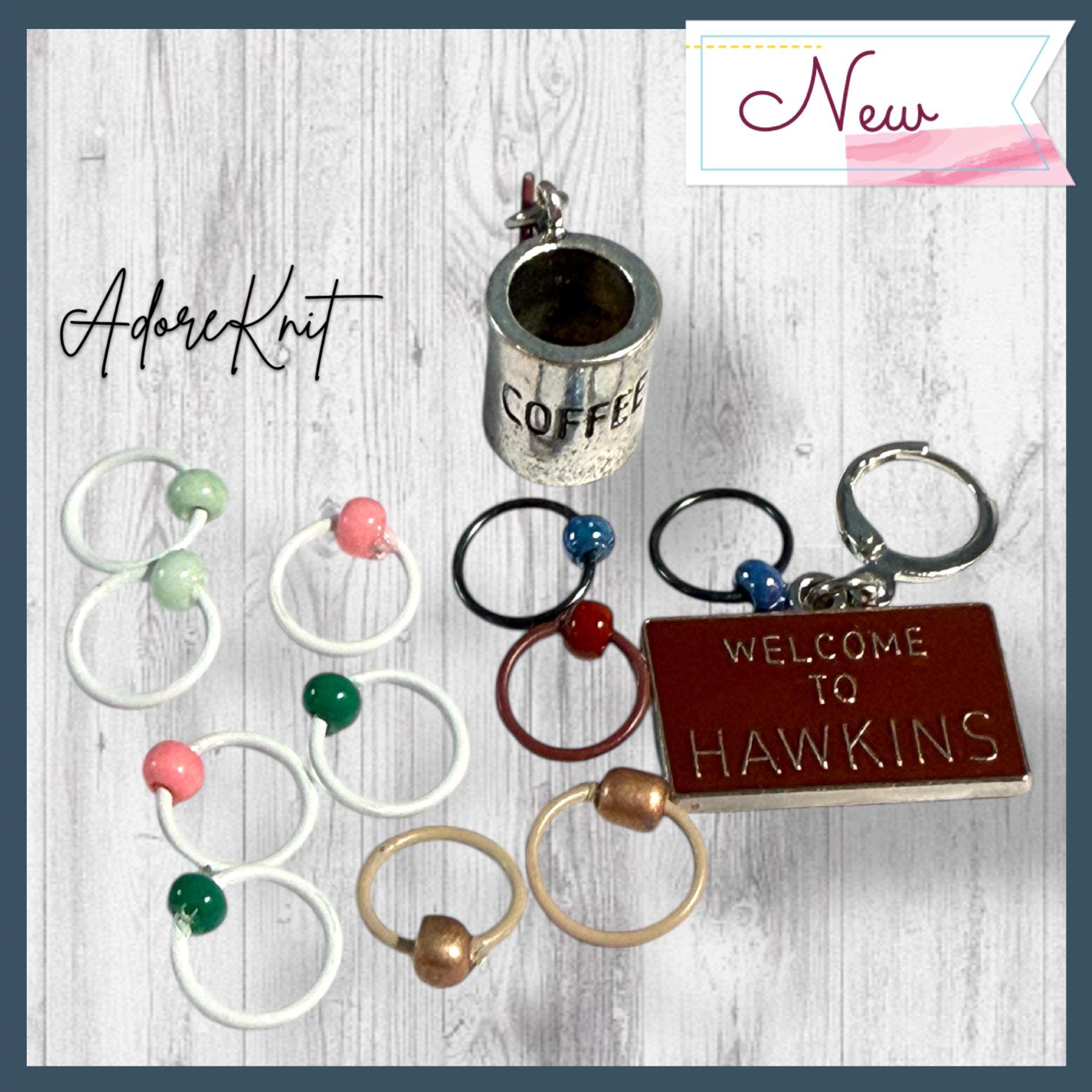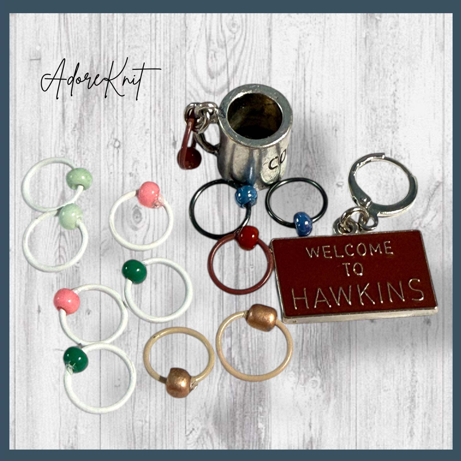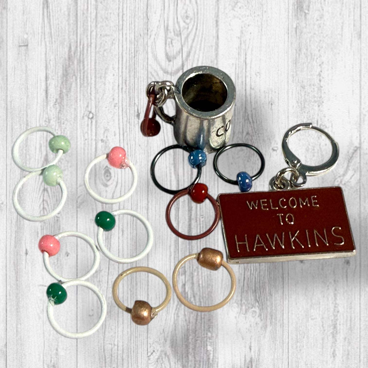 Each charm in this set captures that nostalgic 80s sci-fi vibe, with playful nods to dice games, walkie talkies, spooky shadows, and the power of friendship. These markers make a fun gift for knitters, crocheters, and anyone who grew up loving retro adventures and supernatural stories. Perfect for socks, hats, sweaters, or any project that deserves a touch of geeky fun.