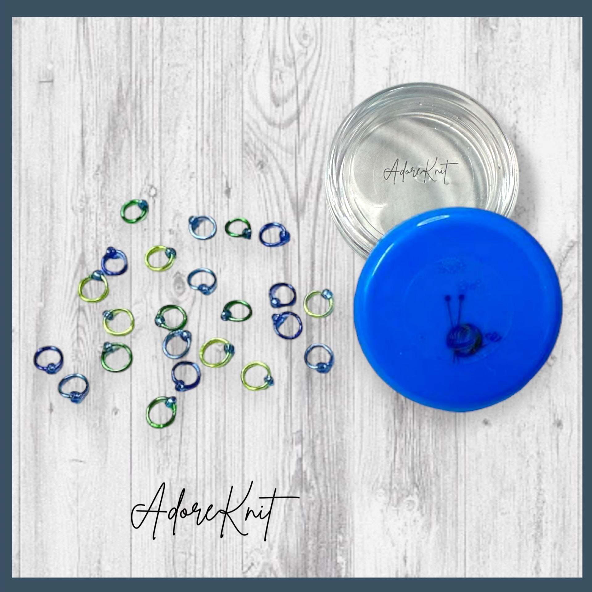 * A set of 24 stitch markers. All markers have clear cornflower blue beads. Cornflower blue, electric blue, emerald green, and chartreuse rings, 6 of each color.