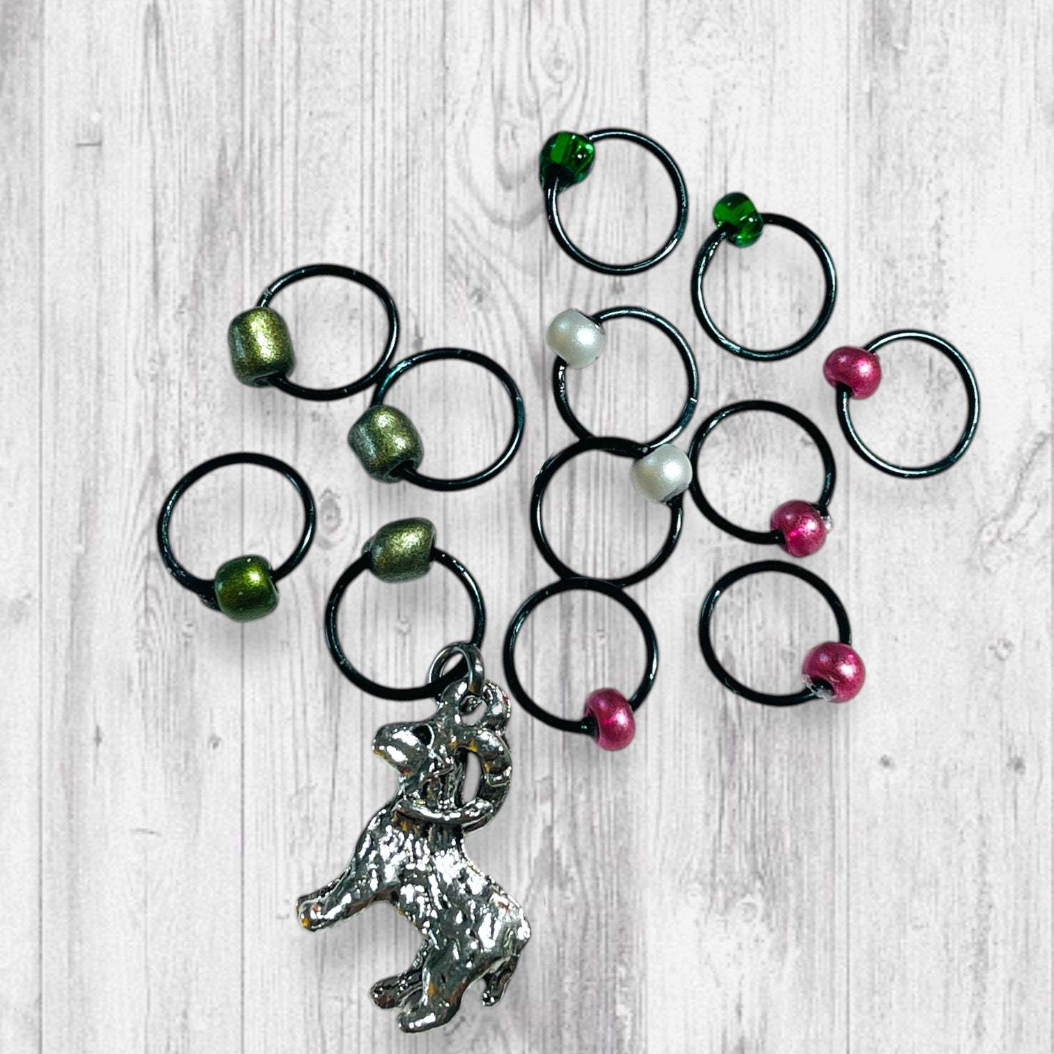 Set of 12 stitch markers: black metal alloy rings carry sateen beads of green, white, dusty pink and clear green.
