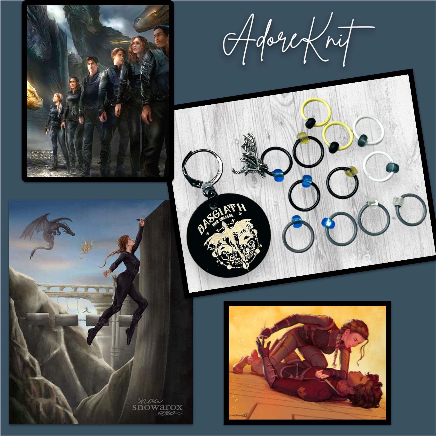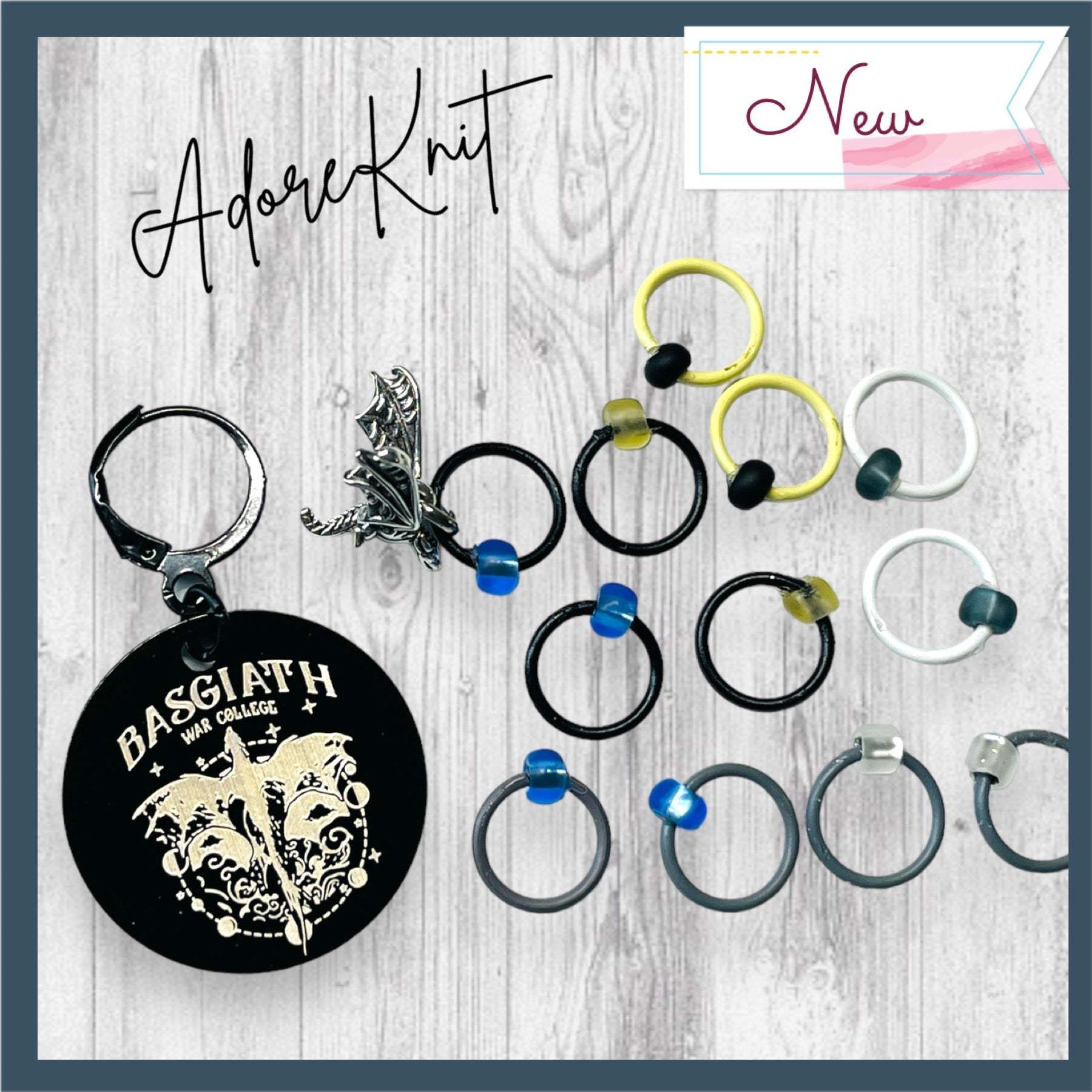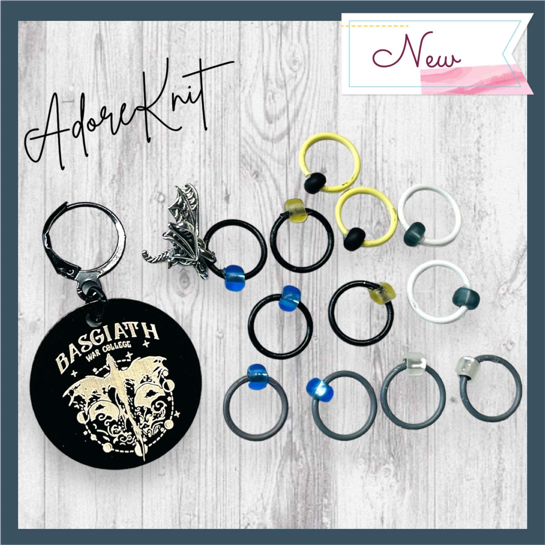 Dragon War College Progress and Stitch Markers are part of our Summer of Dragons Collection. Inspired by the Basgiath War College from Rebecca Yarros Fourth Wing series. They are prefect gift for a knitter who loves dragons! It is difficult to capture the details of the tiny dragon but trust us, he's very cool looking! These stitch markers are great for a knitter or crocheter. Include in a swap package, teacher gift, or a little pick me up for the knitter in your life.