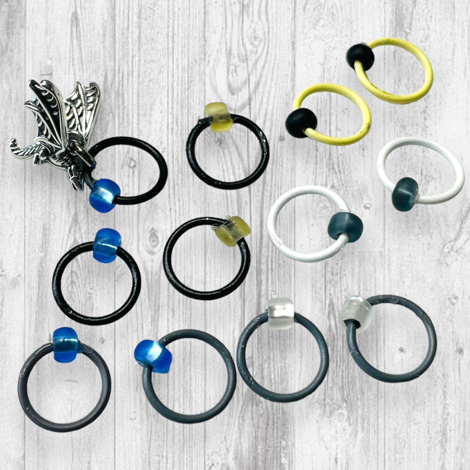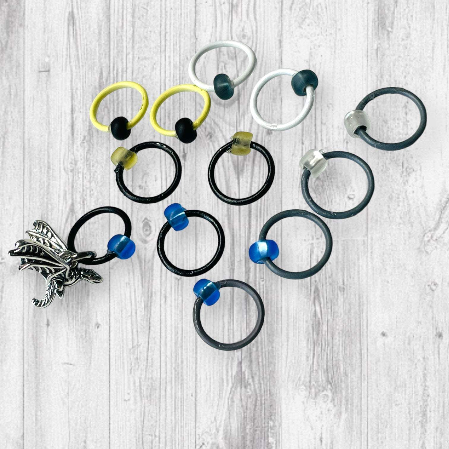 * A Set of 12 Stitch Markers that include a small detailed dragon beginning of the round (BOR) marker or