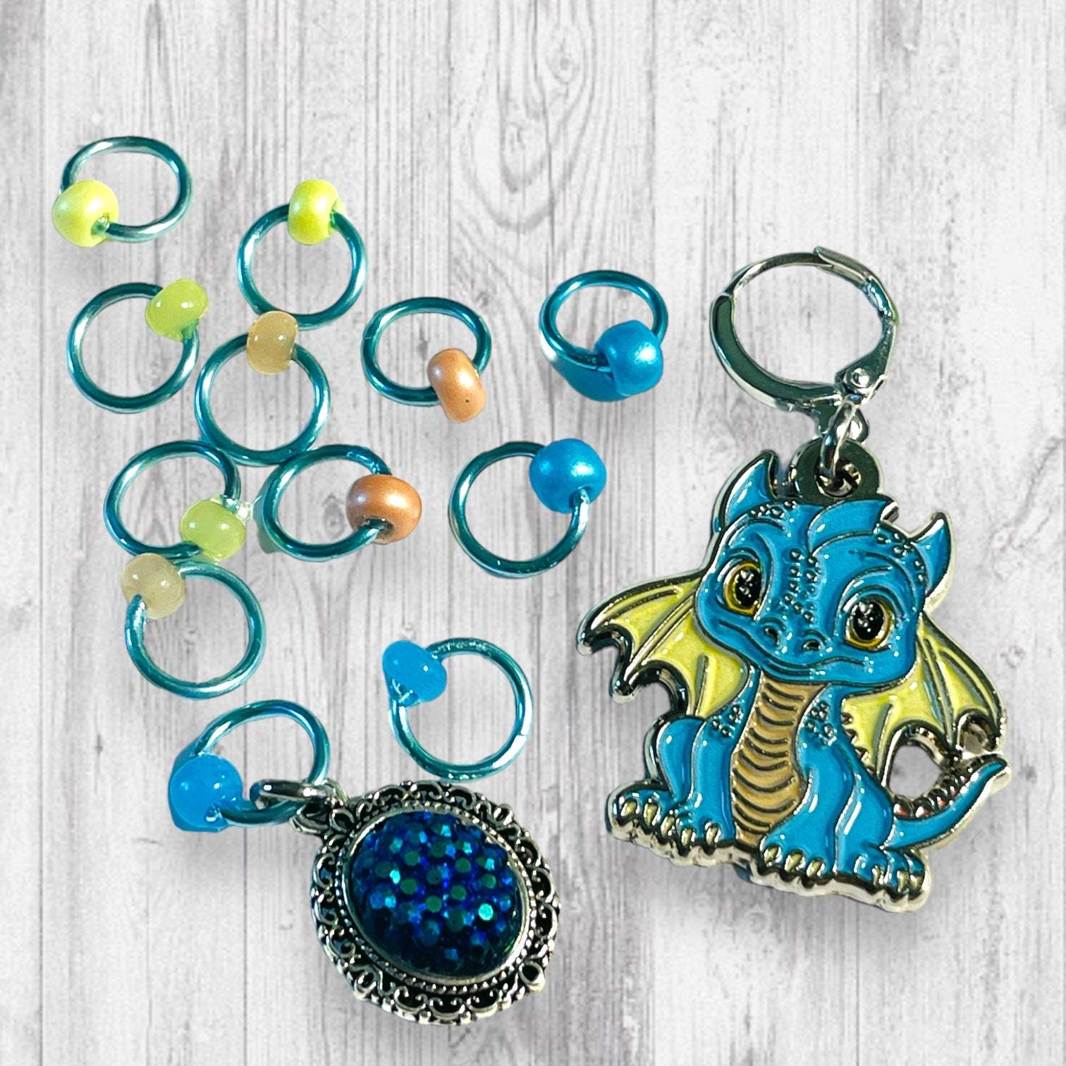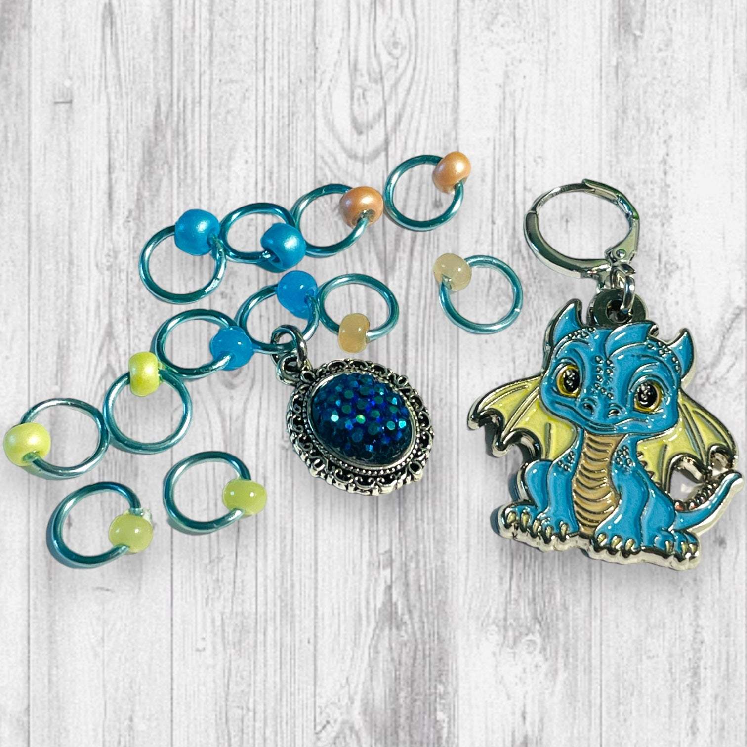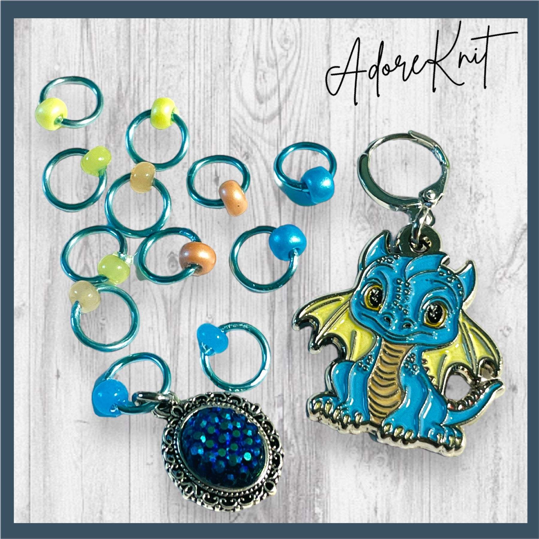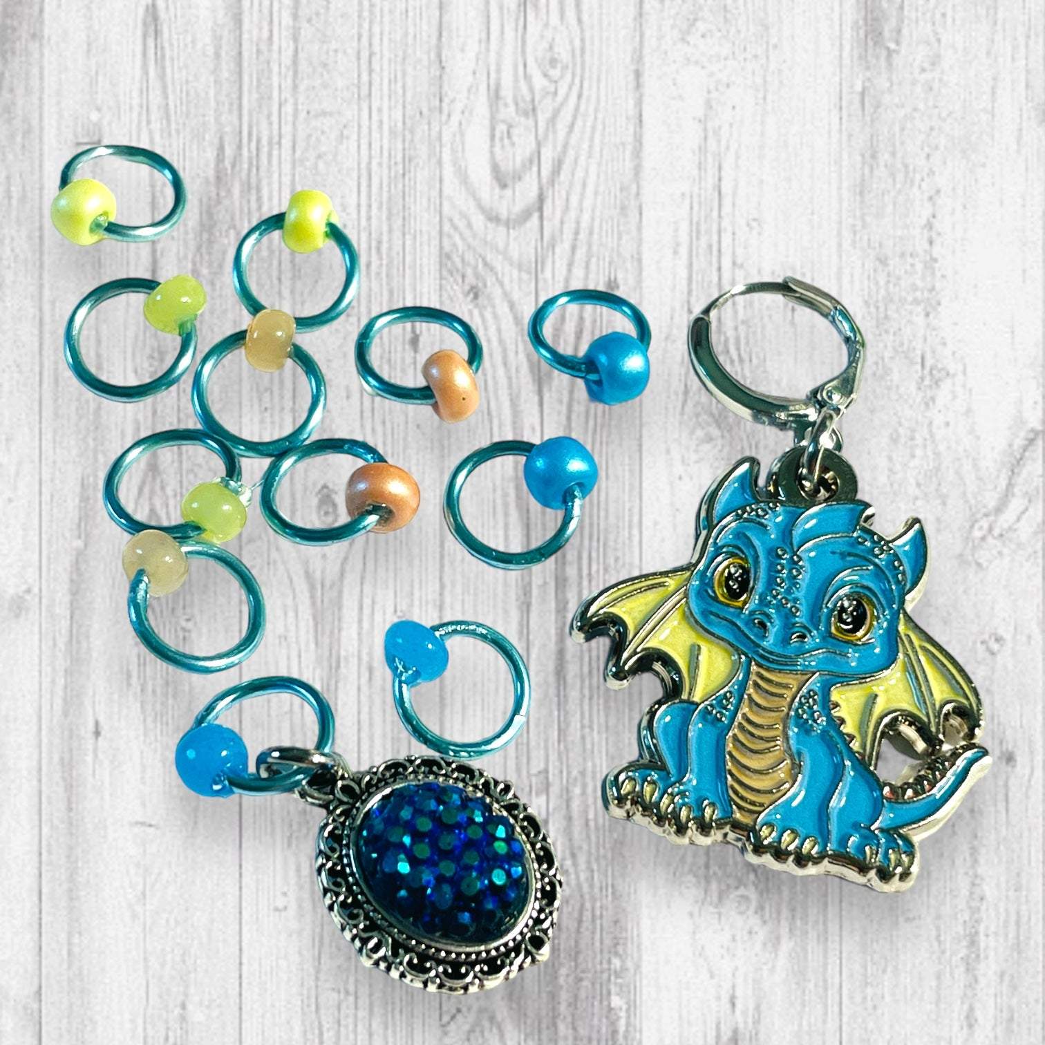 * A Set of 12 Stitch Markers that include a Blue Dragon Scale beginning of the round (BOR) marker or