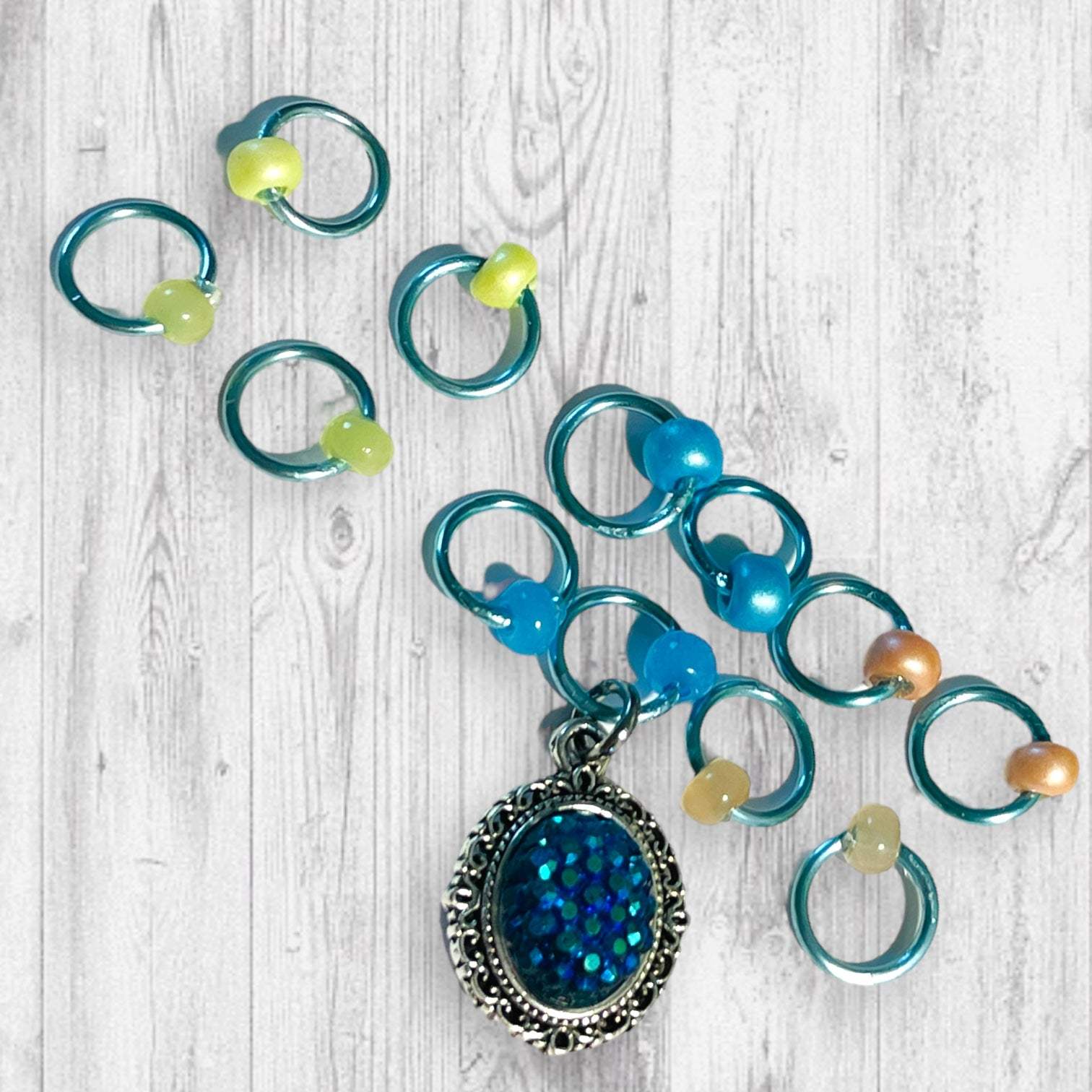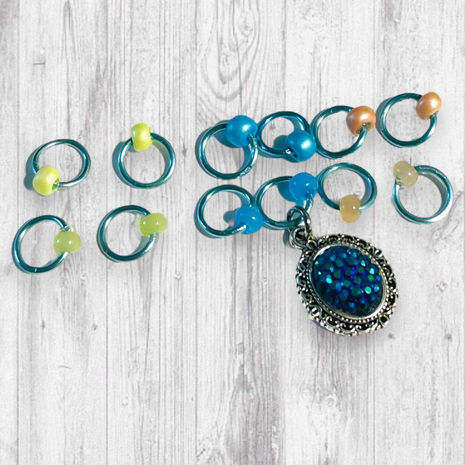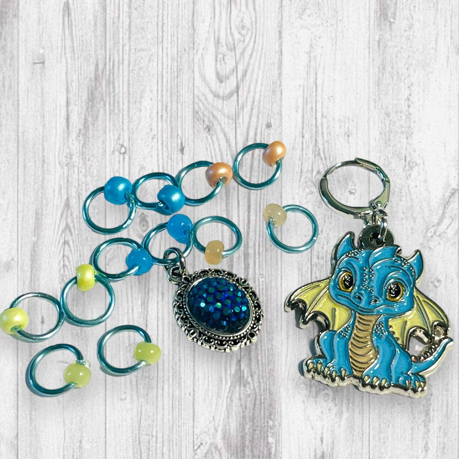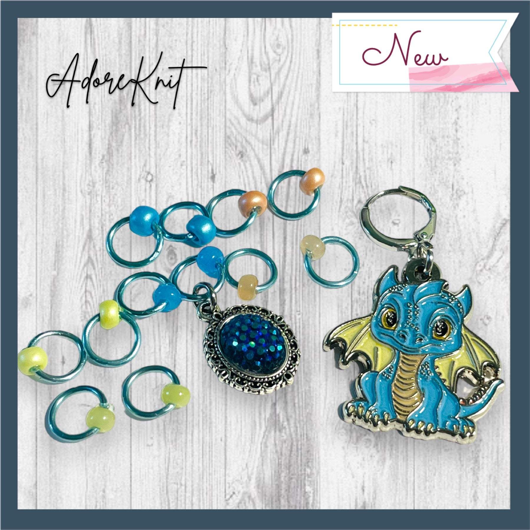 * A Set of 12 Stitch Markers that include a Blue Dragon Scale beginning of the round (BOR) marker or