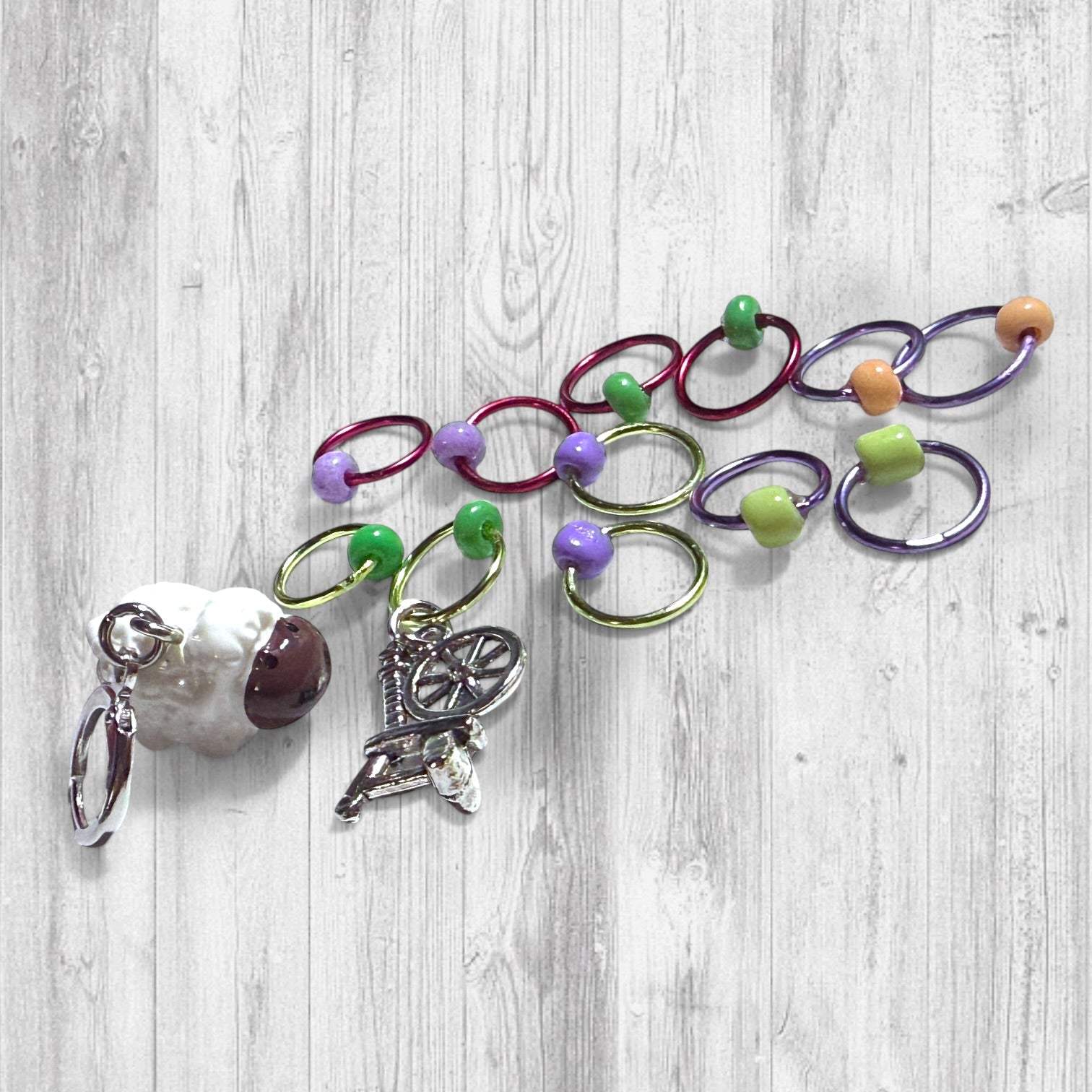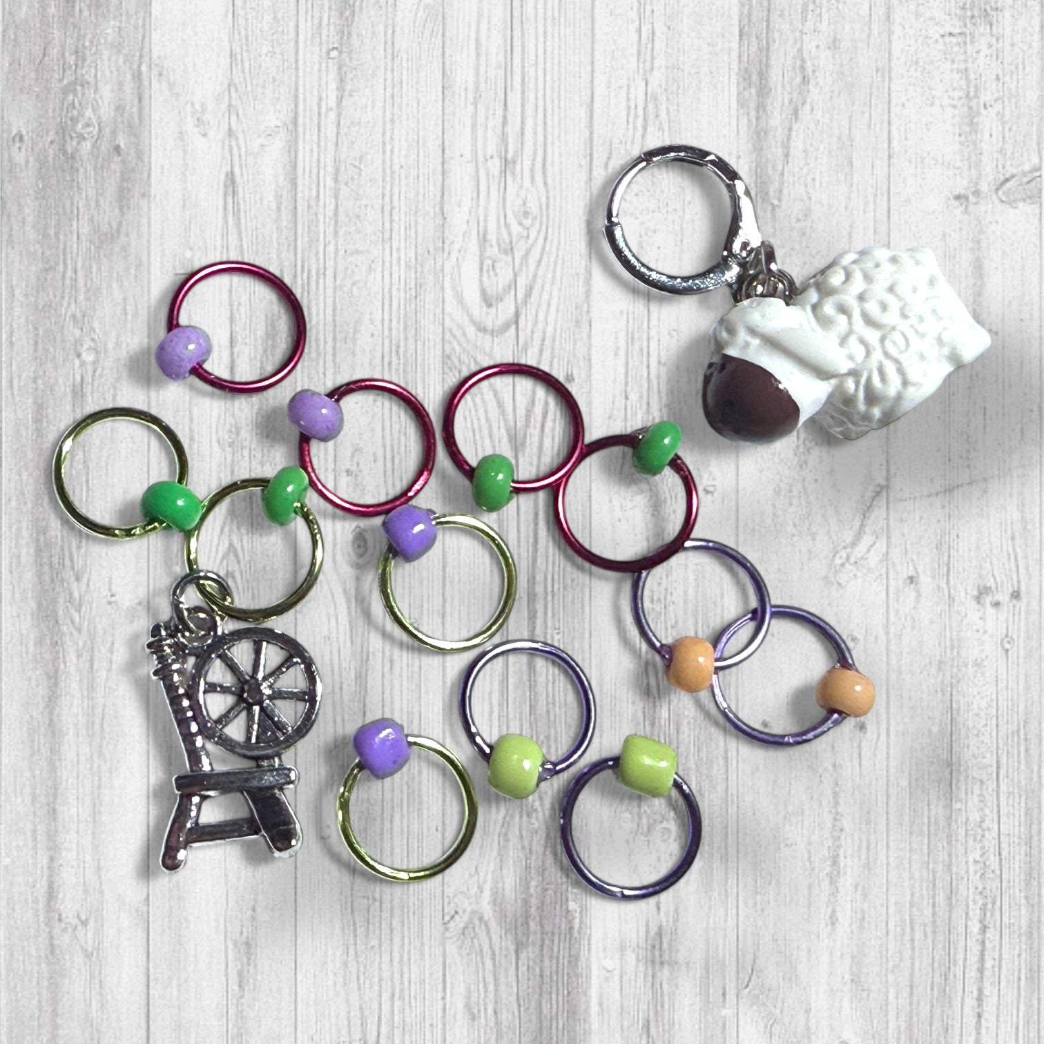 • A Sheep Progress Marker / Keeper with a Set of 12 Stitch Markers including a spinning wheel BOR marker
