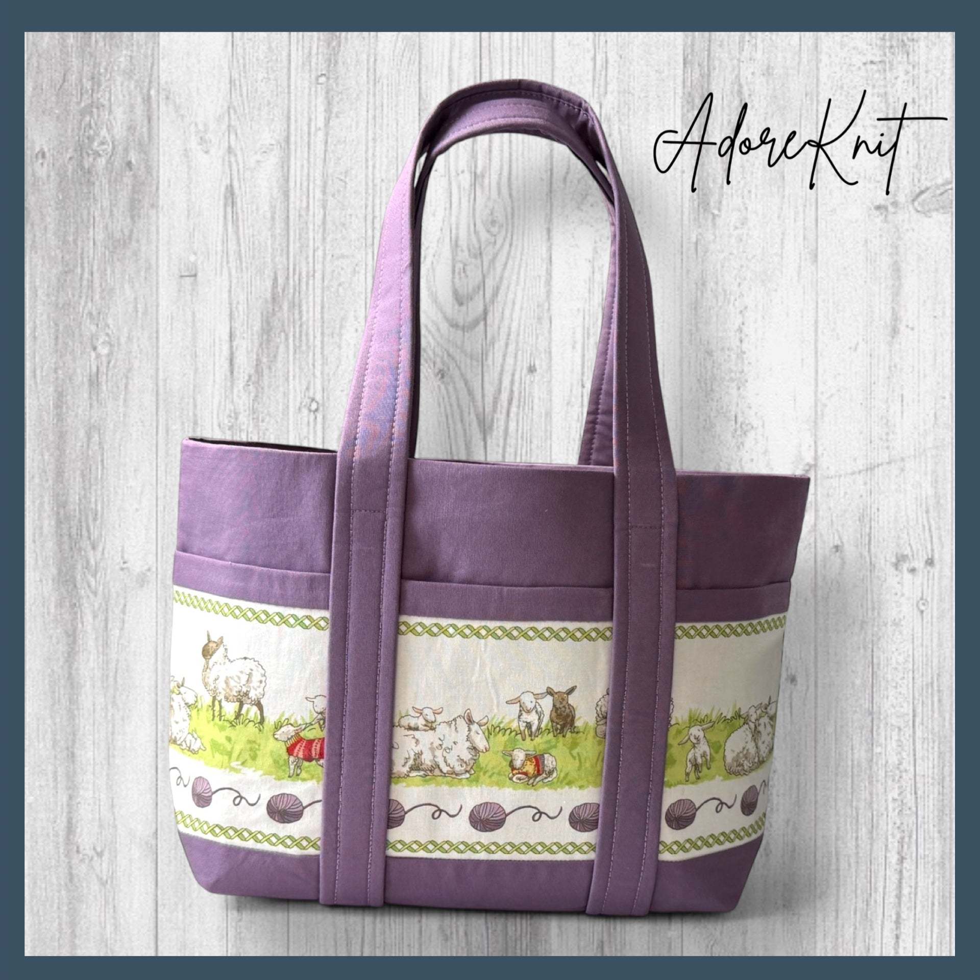 ~The Carry-All Tote is designed for makers who like to keep everything close at hand.  With sturdy straps and multiple exterior pockets, it is perfect for carrying your project along with all the little tools that come with it.  You will find an embroidered AdoreKnit logo tucked neatly inside.