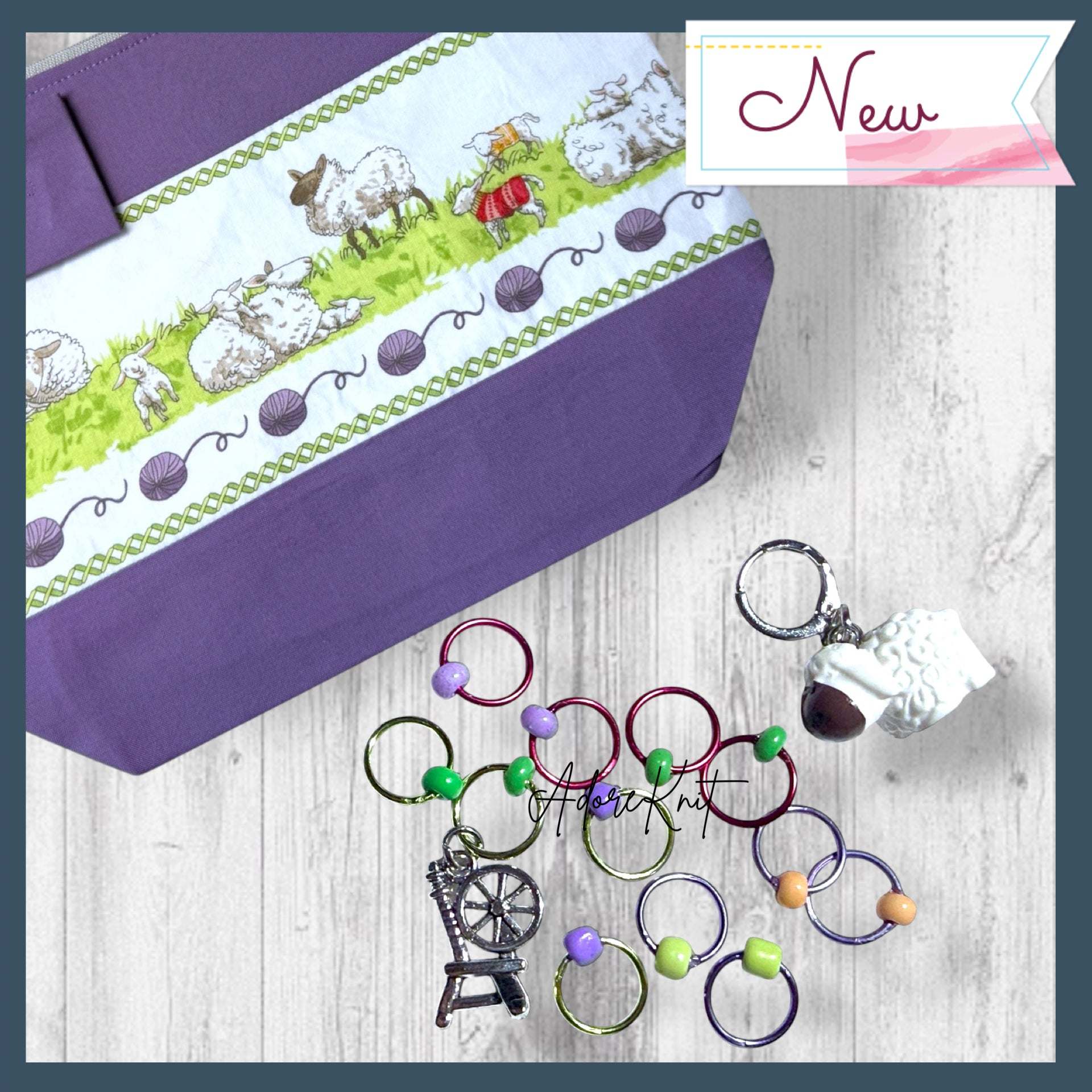 ~Both styles highlight the lively spring colors of the Ewe Made This Happen design, bringing a pasture full of joyful lambs right into your knitting space, paired with a contrasting warm lavender fabric.