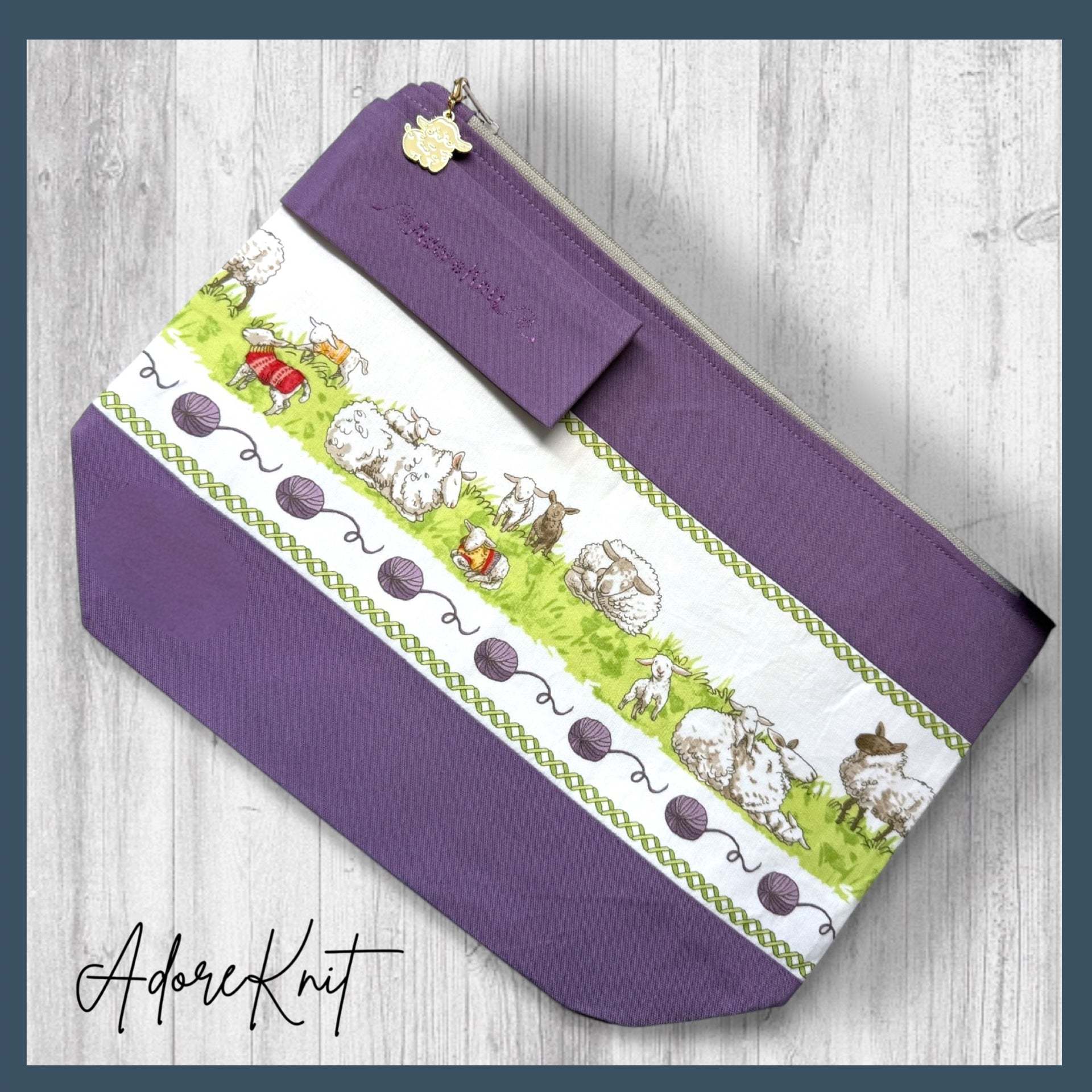 ~The Equator Bag is our classic medium sized project bag. It features a removable decorative zipper pull that can double as a progress keeper in a pinch, along with a comfortable wrist strap and an embroidered AdoreKnit logo.