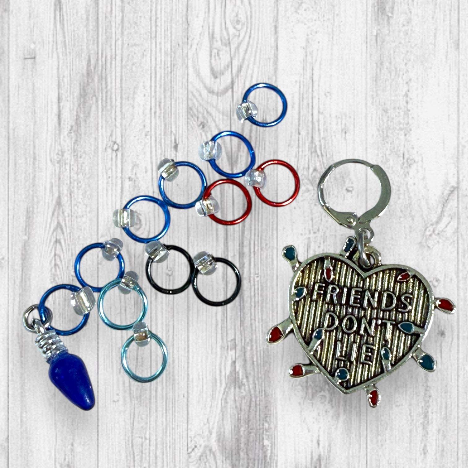 Friends Don't Lie Progress and Stitch Markers Retro Supernatural Adventure Stitch Markers, 80s Sci-Fi Inspired Knitting Markers, Nerdy Fiber Gifts by AdoreKnit.