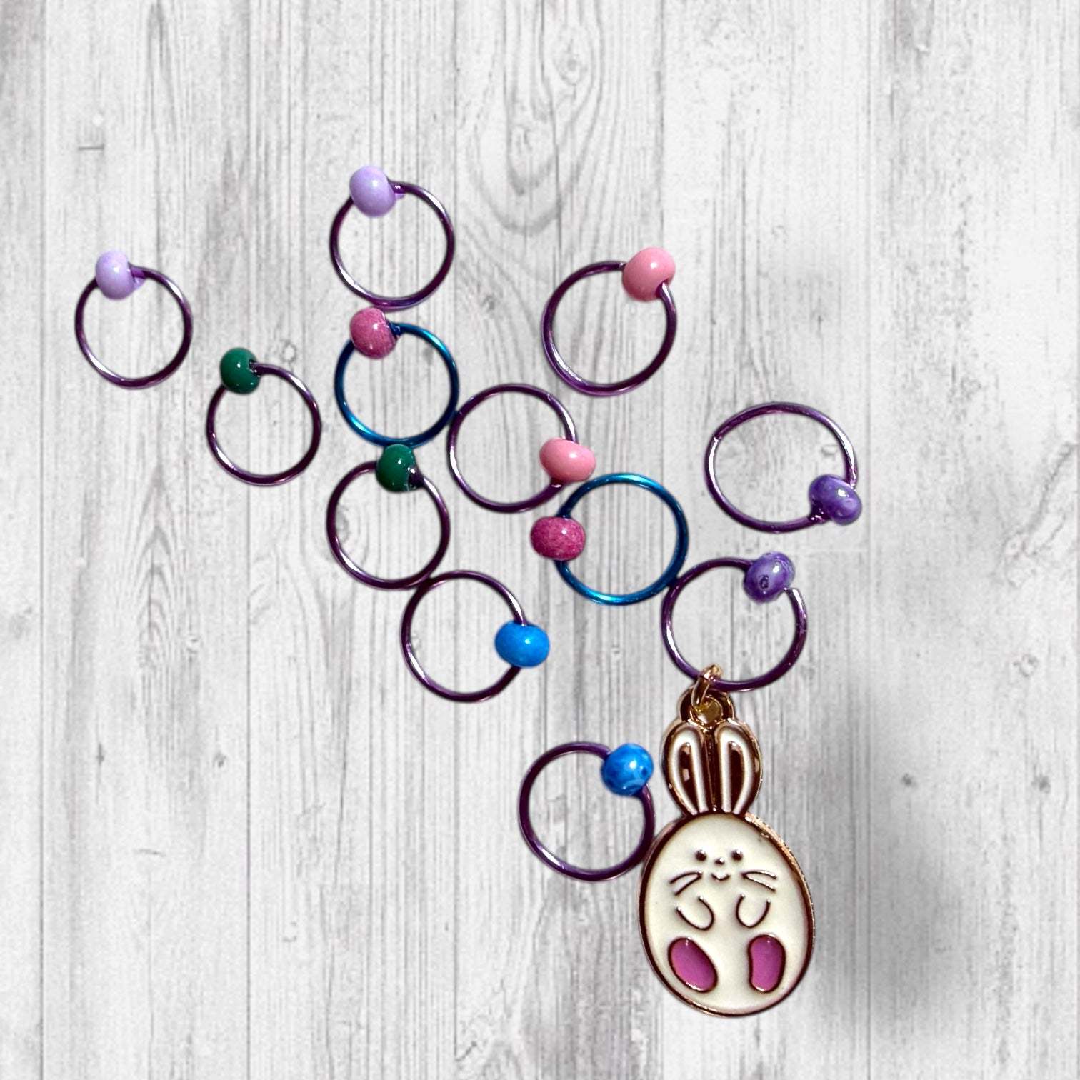 * A Set of 12 Stitch Markers that include a white bunny beginning of the round marker or
