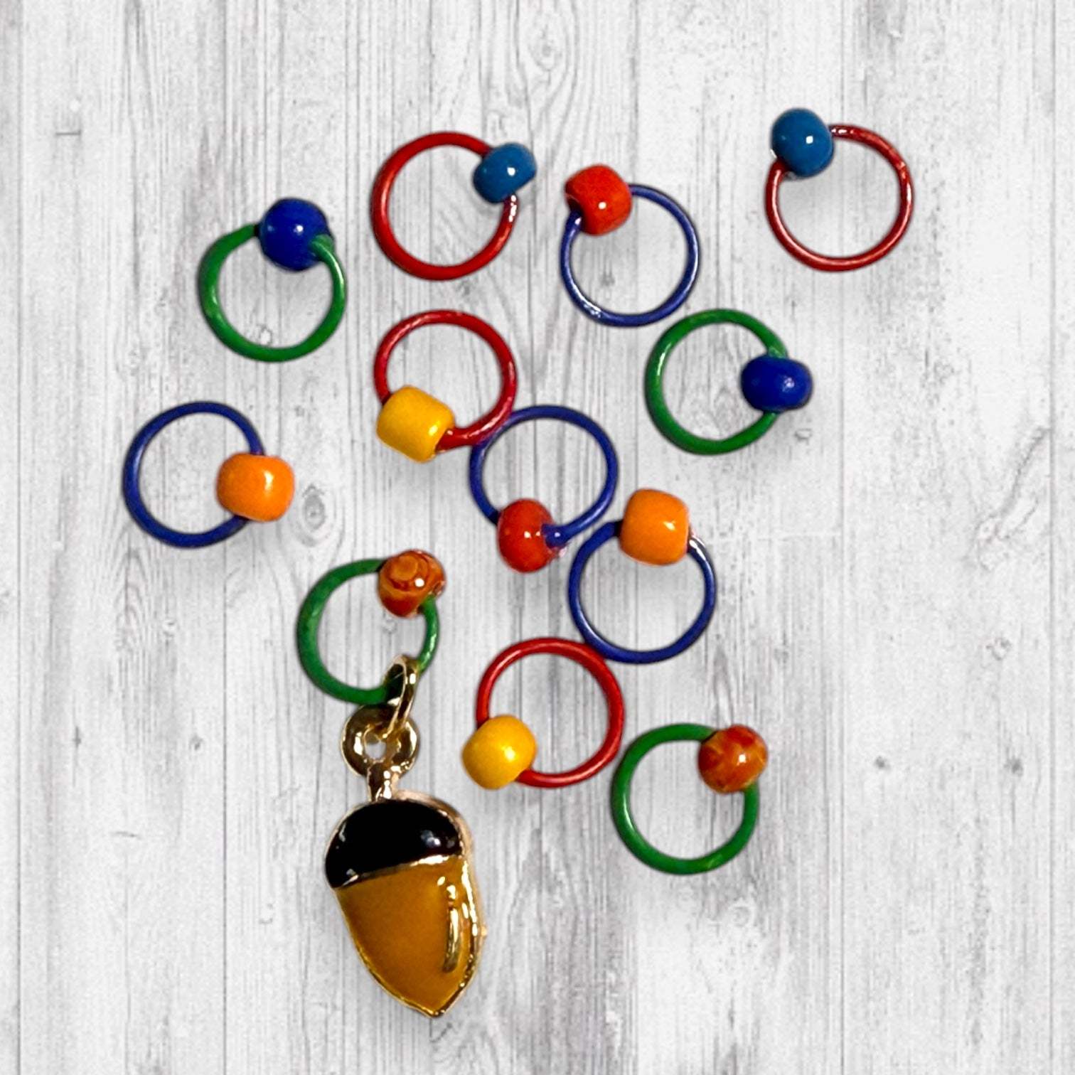 Set of 12 stitch markers featuring iron-coated rings in sage green, navy blue and red carry shiny beads of red, orange, yellow, country blue, and navy blue, as well as speckled orange.