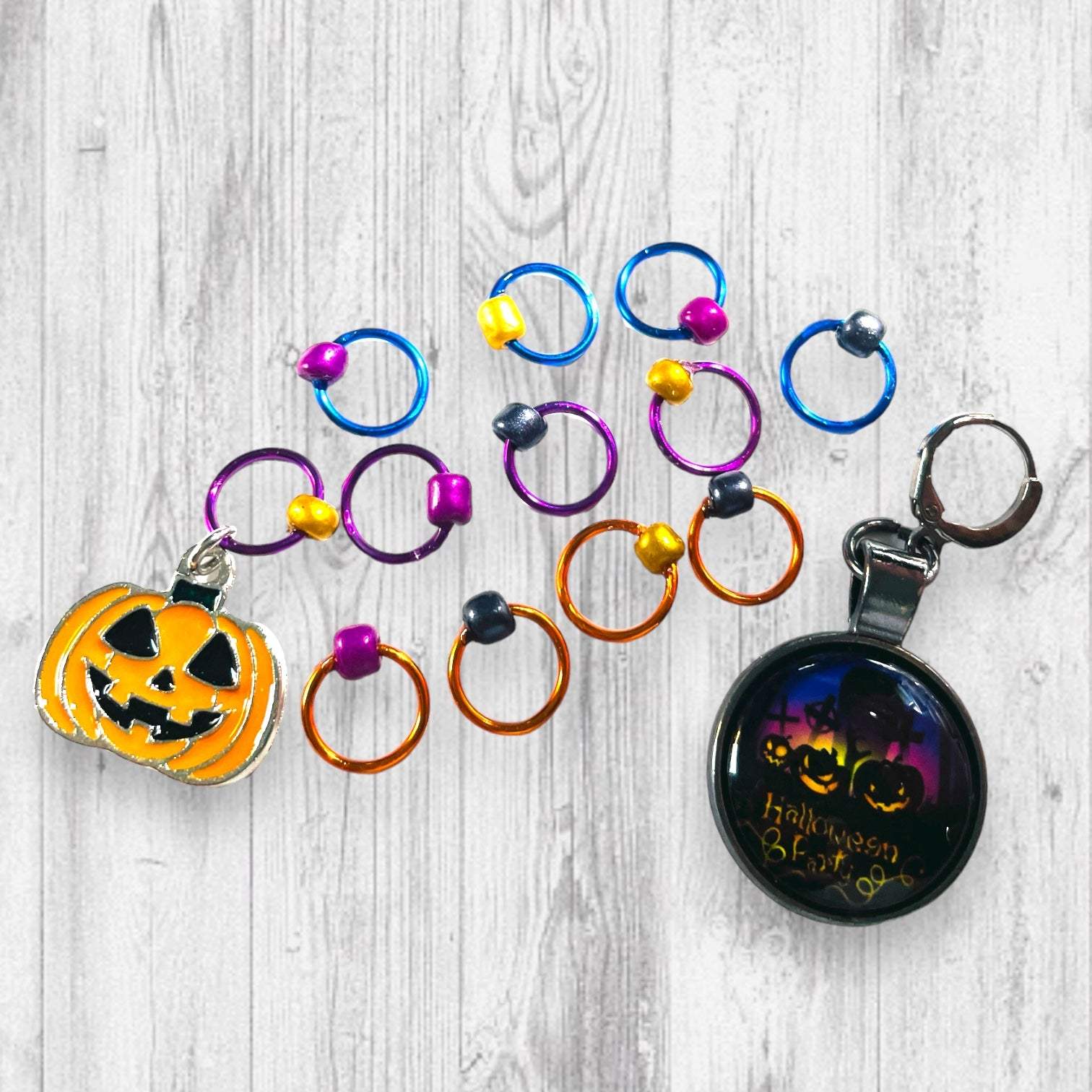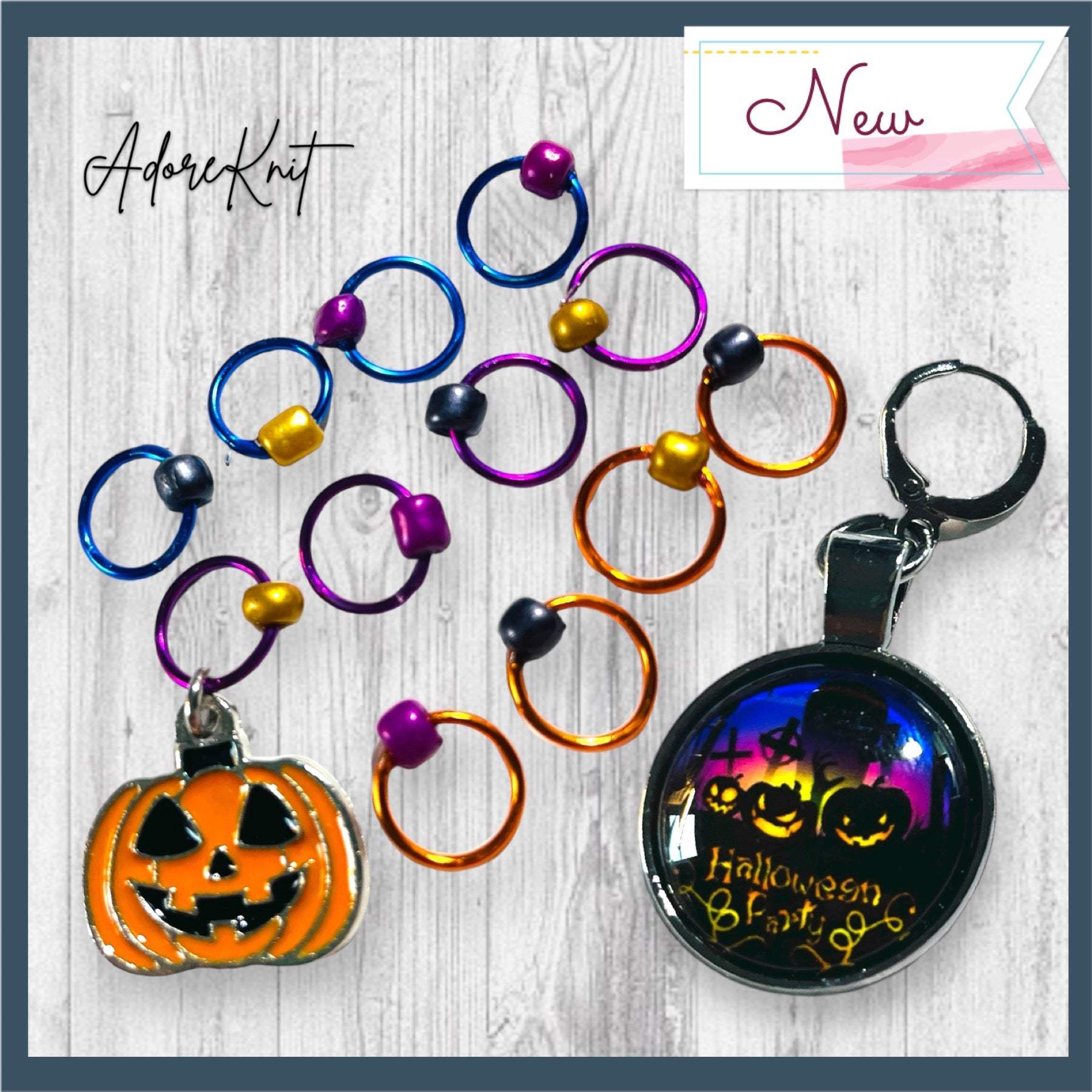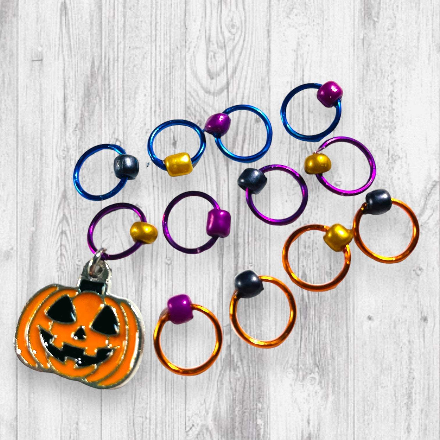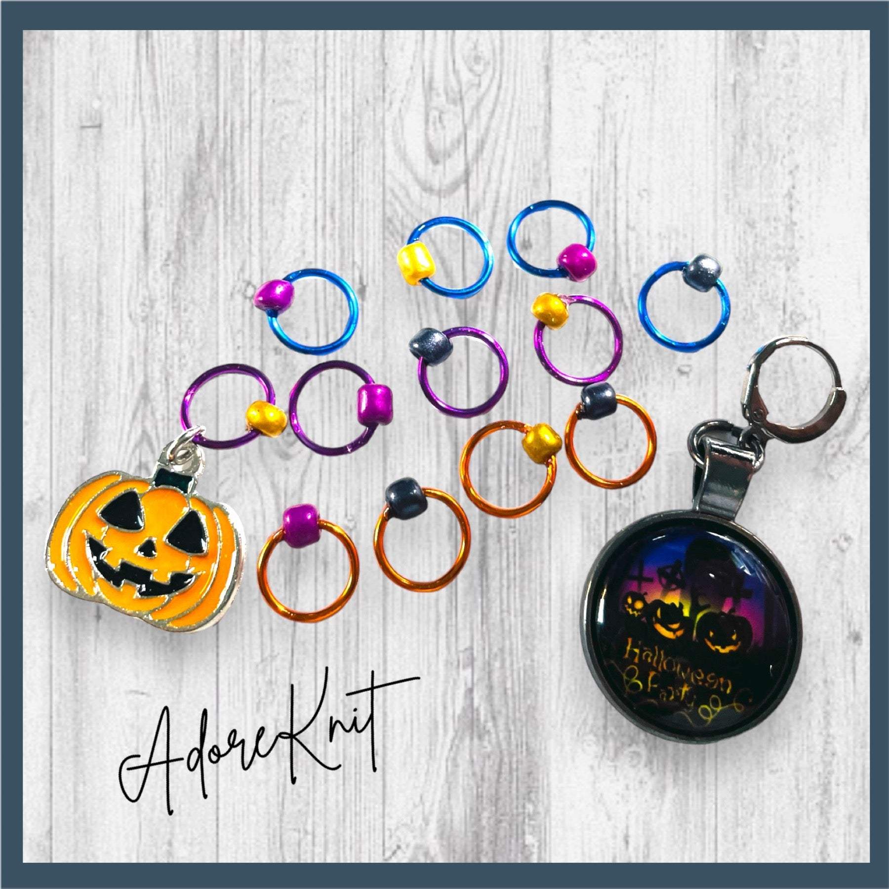 * A Set of 14 Stitch Markers including a jack-o-lantern beginning of the round marker or