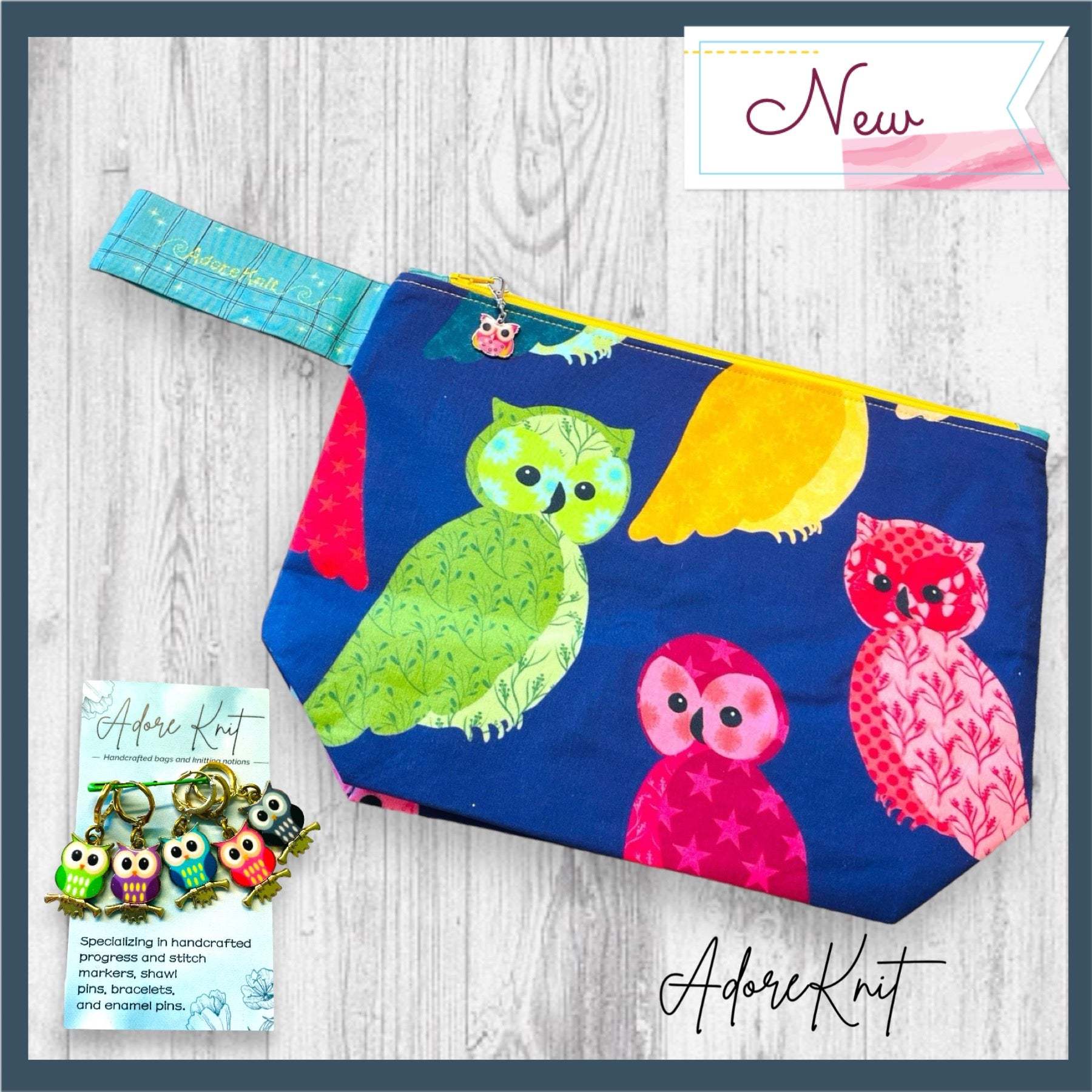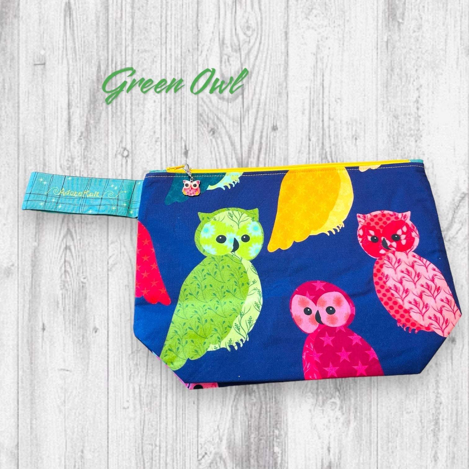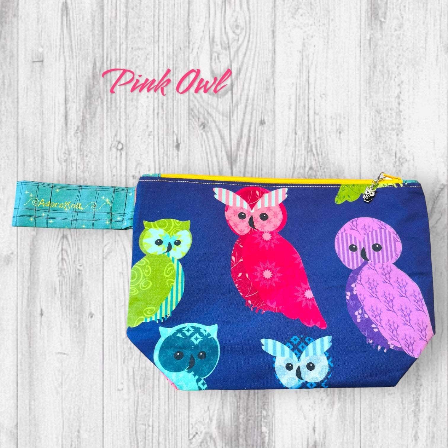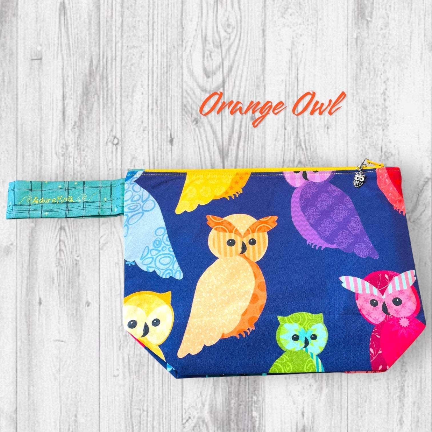 This bag features a decorative zipper pull and contrast wrist strap as well as a yellow AdoreKnit embroidered on the strap. The zipper pull is an owl (pink or black as pictured). It is removable and could double as a progress keeper in a pinch. The interior of all project bags is the same teal as the wrist strap.