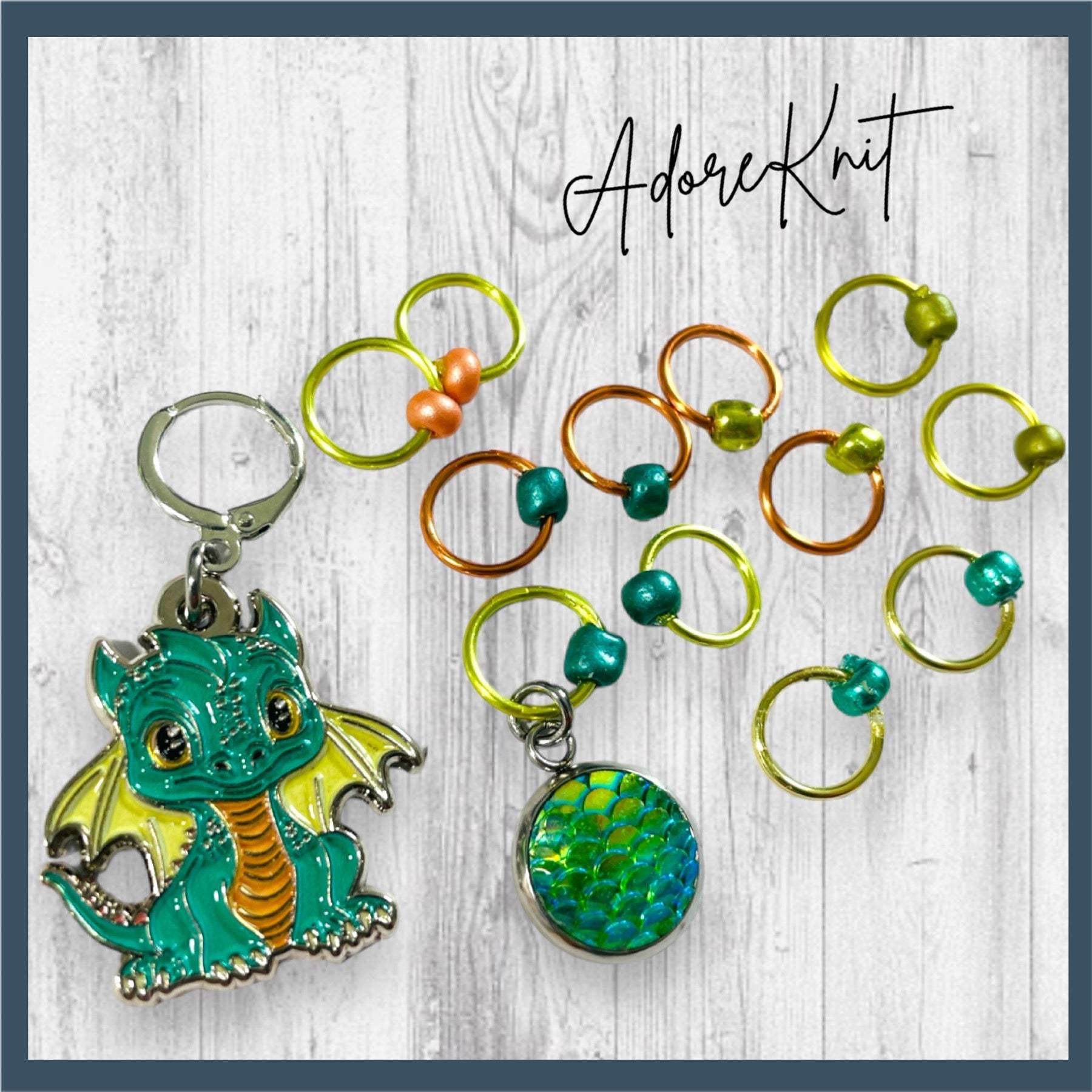 * A Set of 12 Stitch Markers that include a Green Dragon Scale beginning of the round (BOR) marker or