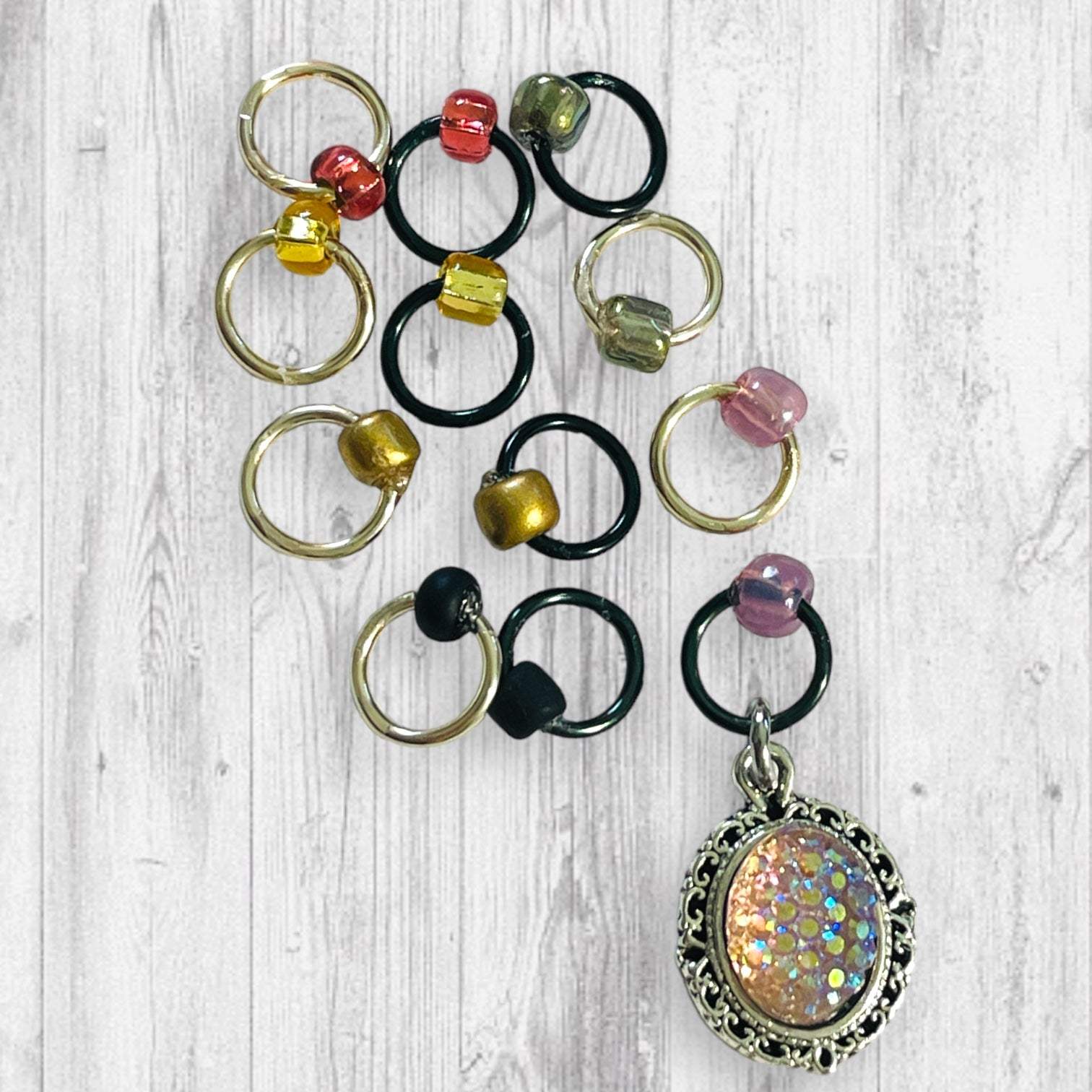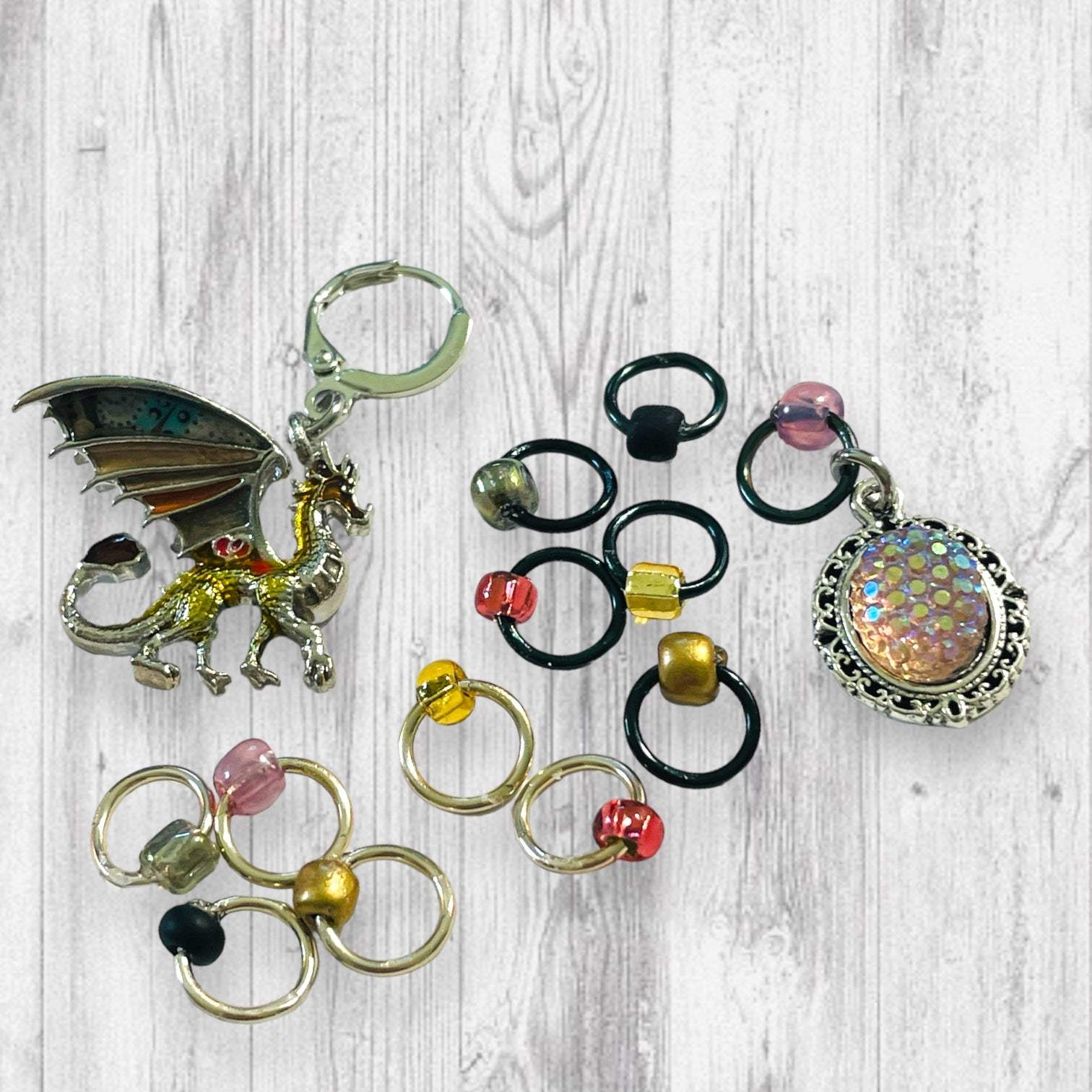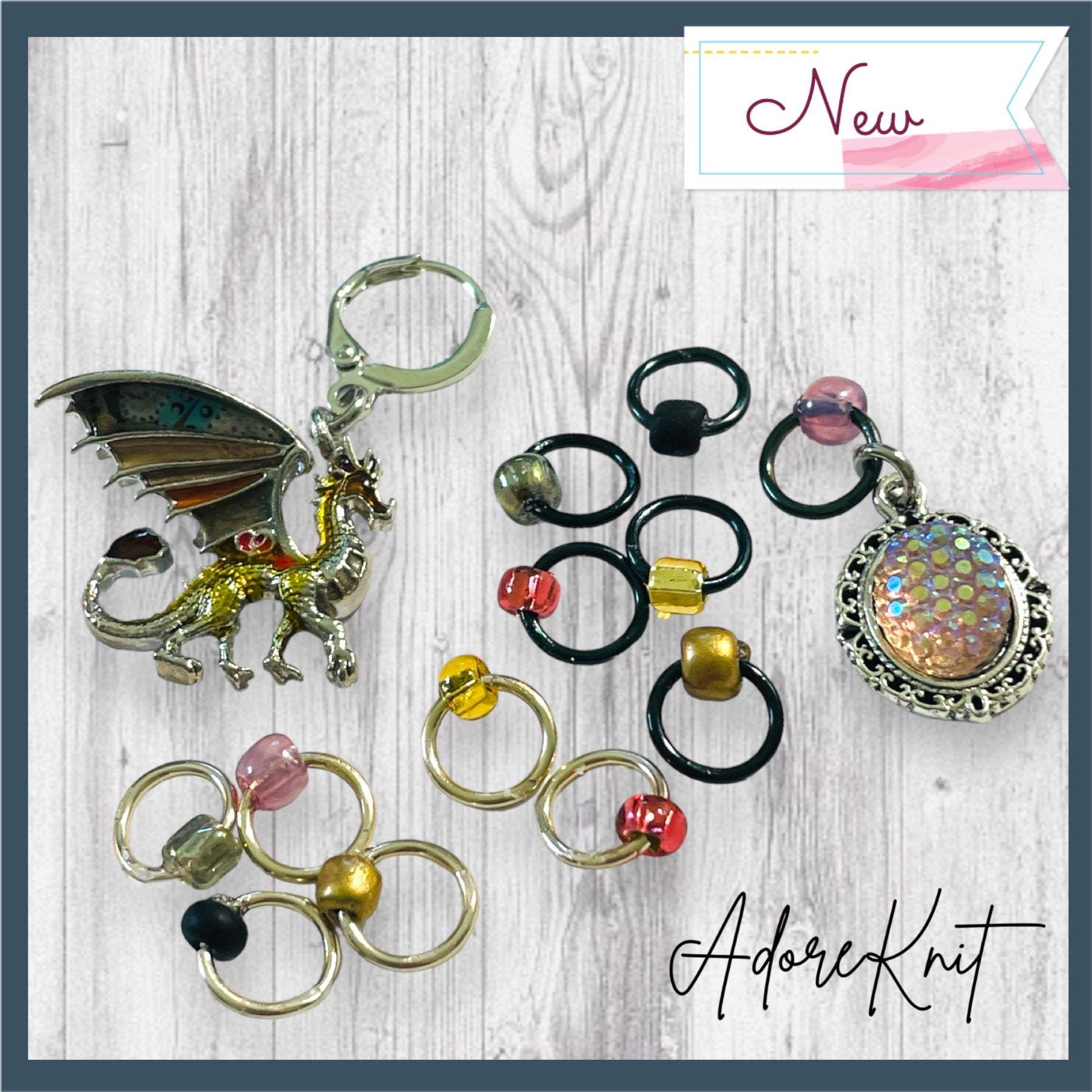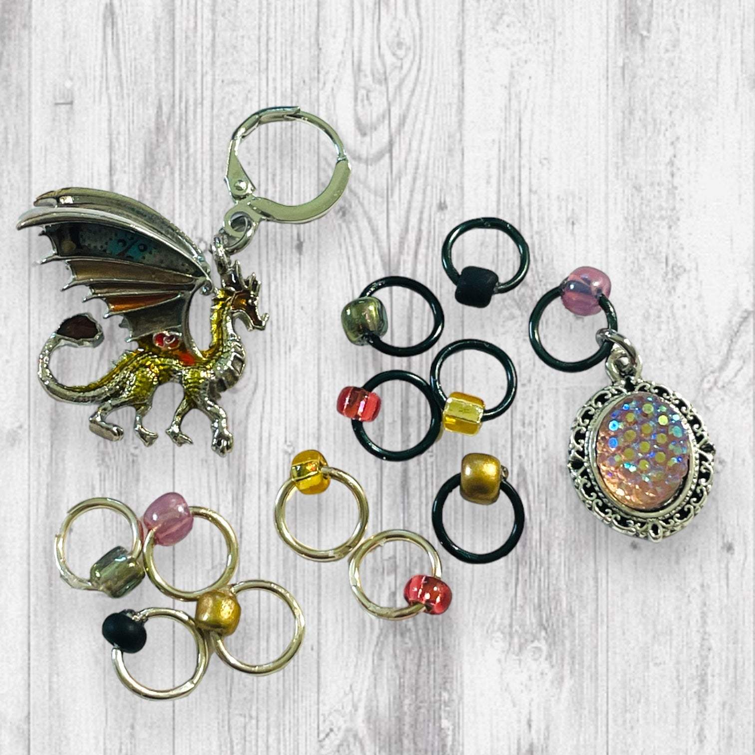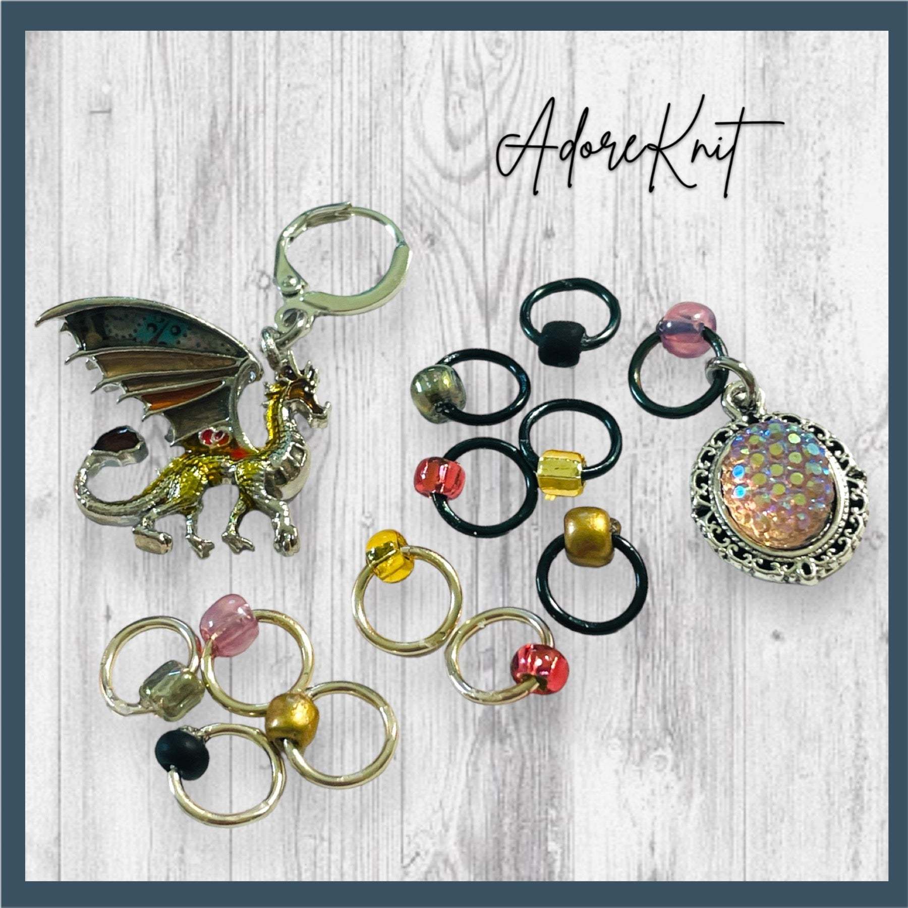 * A Set of 12 Stitch Markers that include a pearlized golden dragon scale beginning of the round (BOR) marker or