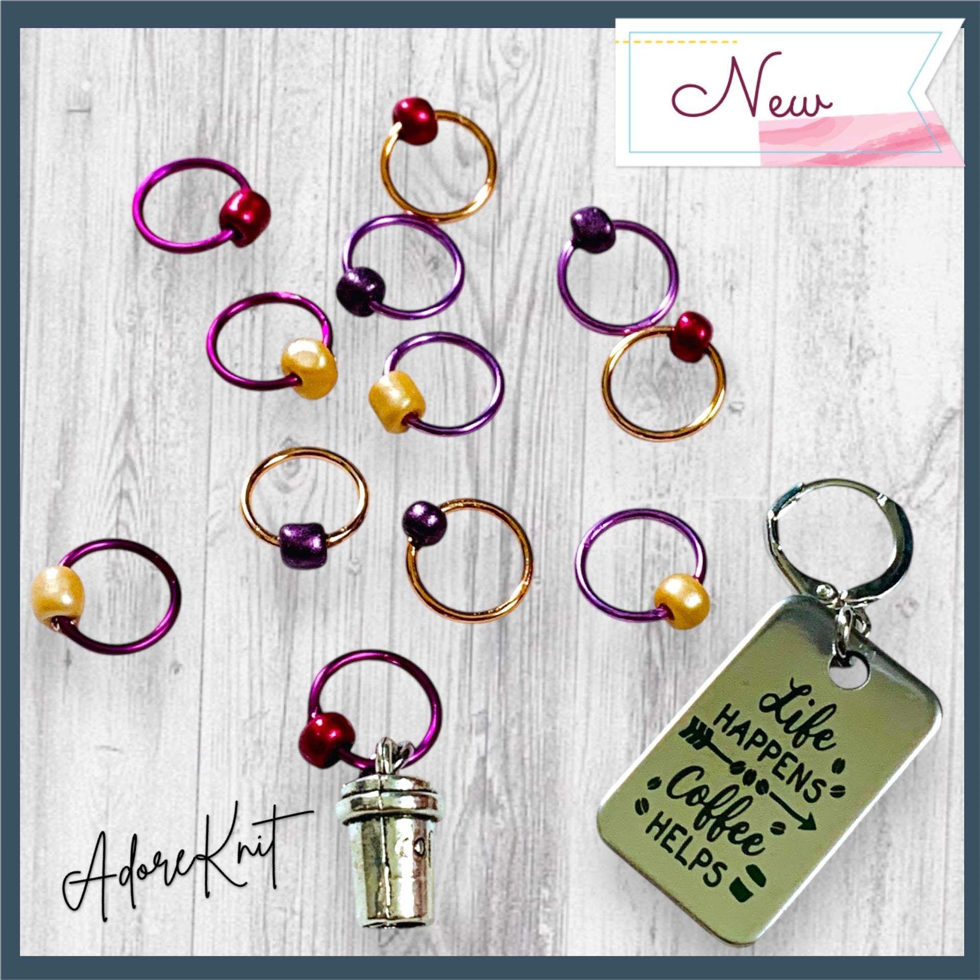 - Or go with both a "Life Happens Coffee Helps" Progress Marker and 12 Stitch Markers (including a Tiny Travel Coffee Cup BOR marker).