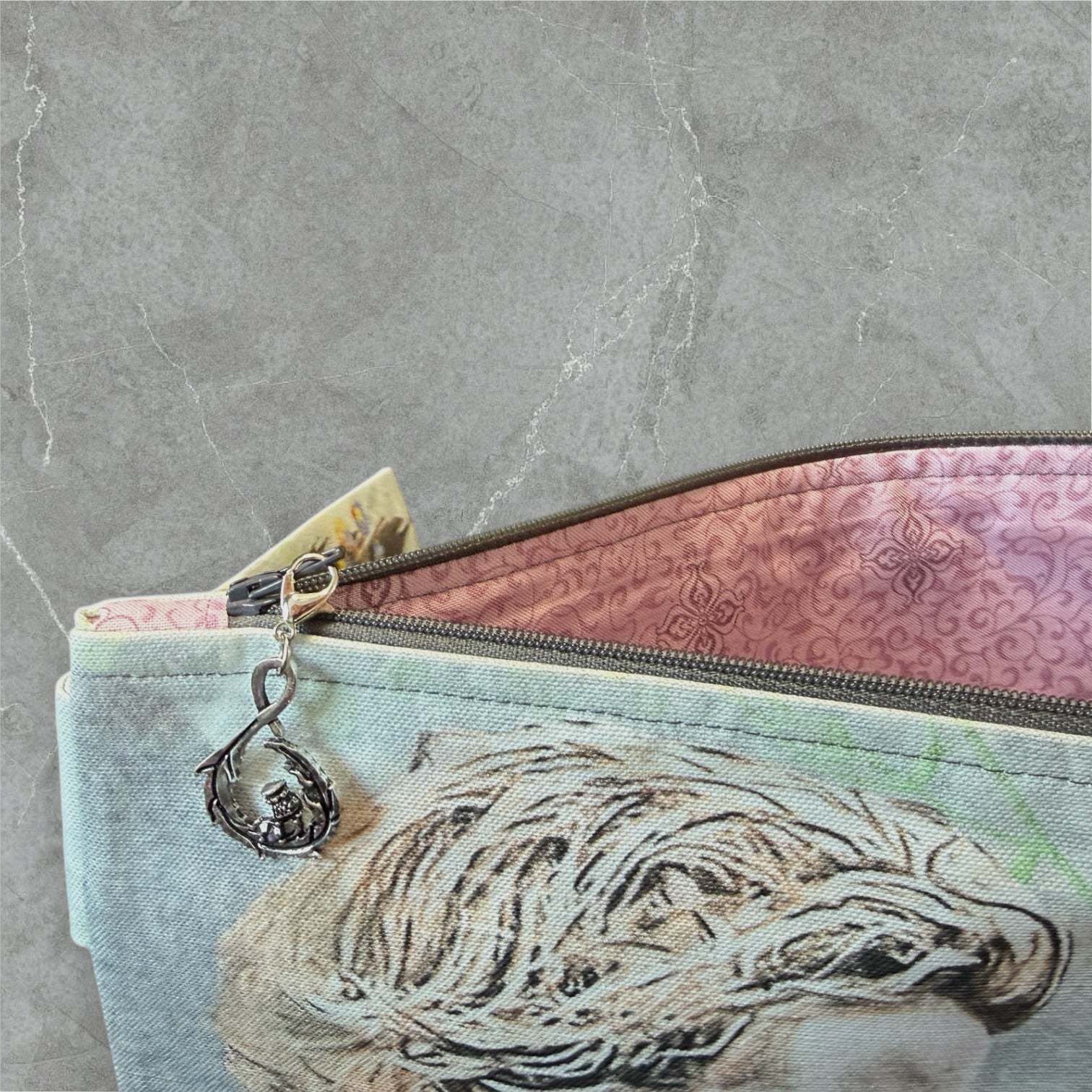 Notions Pouch is made to a minimum of 5” high and 5” wide at the zippered top. The fabrics match those used in the project bags. It is an envelope type pouch. It will comfortably fit darning needle case, measuring tape, stitch marker container and few other essentials.