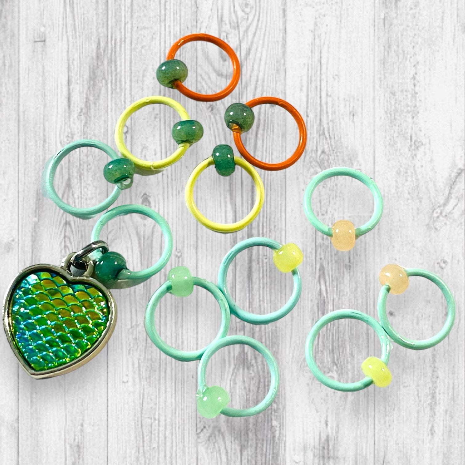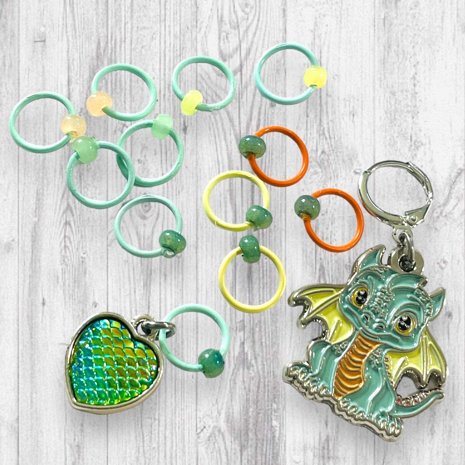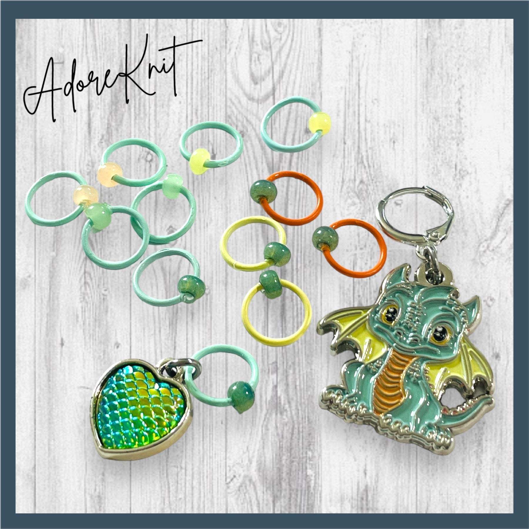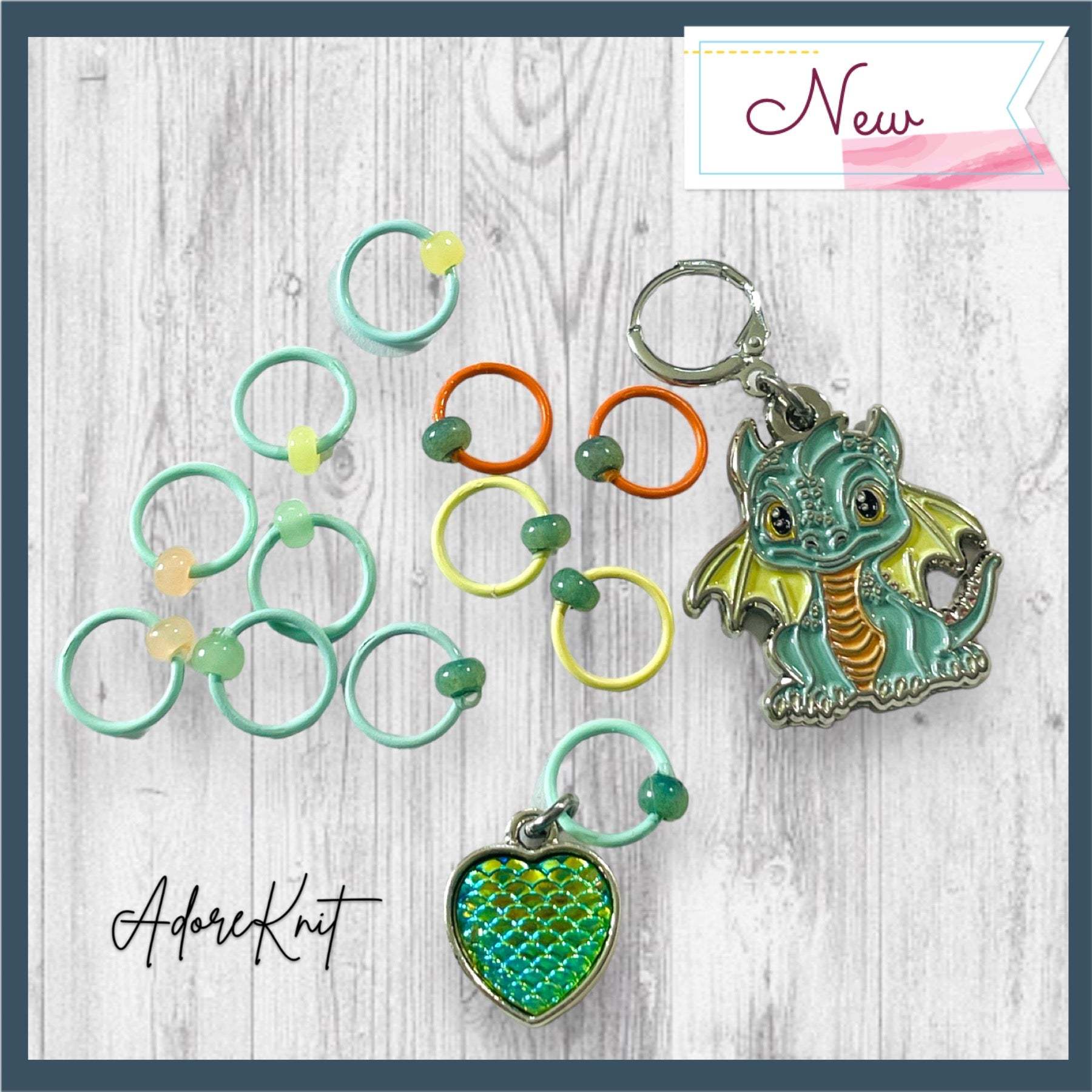 * A Set of 12 Stitch Markers that include a Green Dragon Scale Heart beginning of the round (BOR) marker or