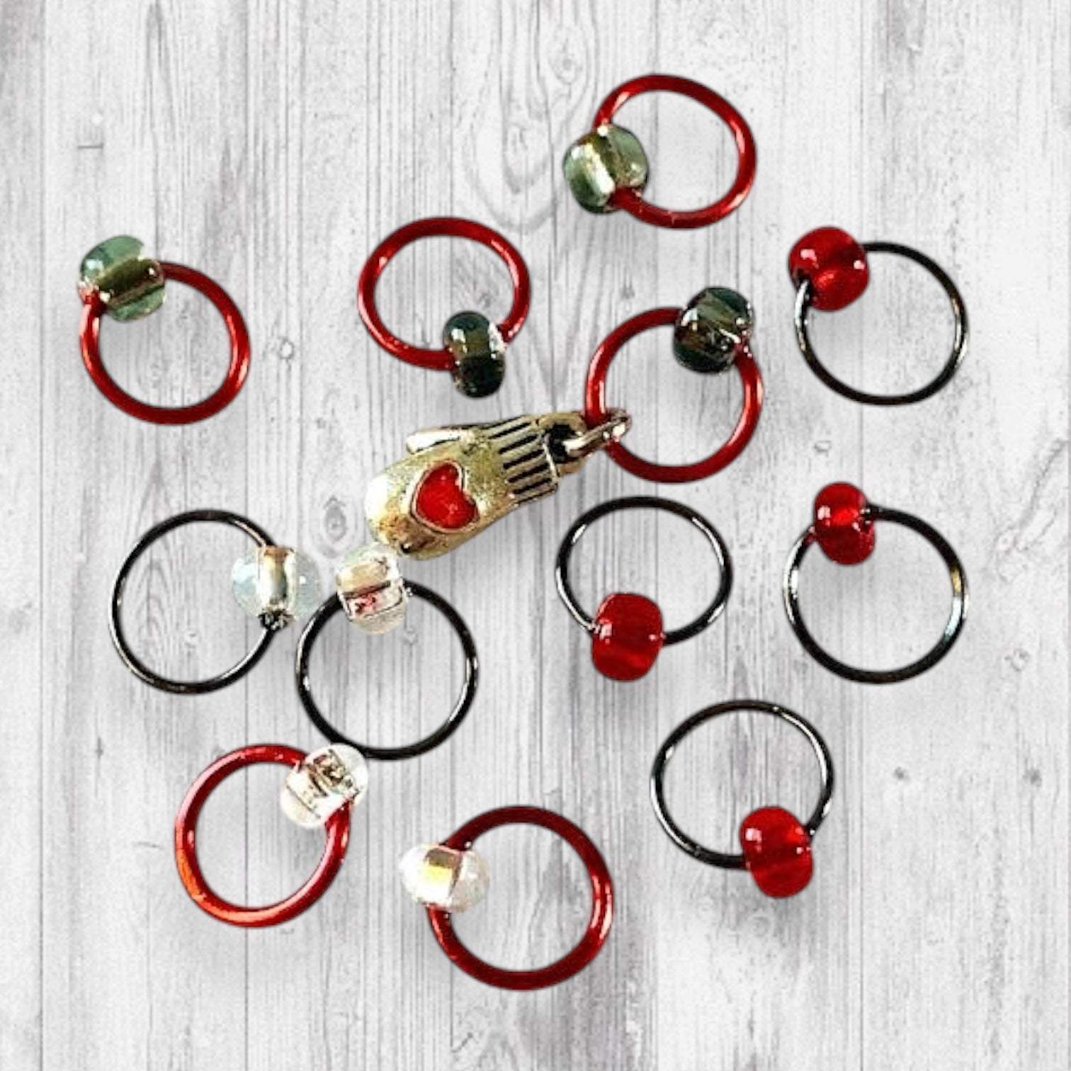 Set includes 12 markers; mitten red and metallic hat gray metal alloy rings carry clear beads of mitten red, clear silver and clear boot black. A mitten with a bright red heart serves as a beginning of the round marker.