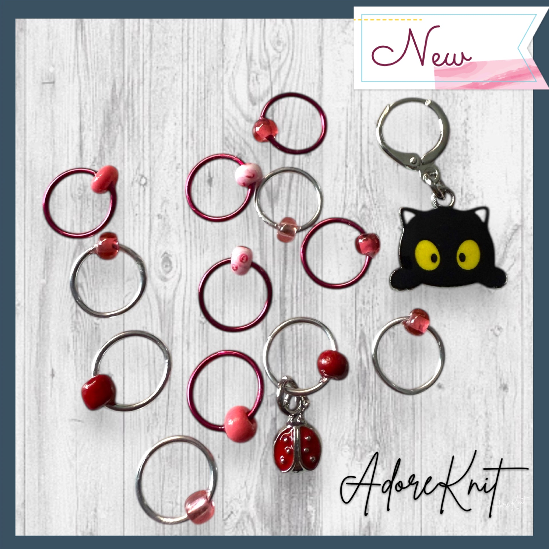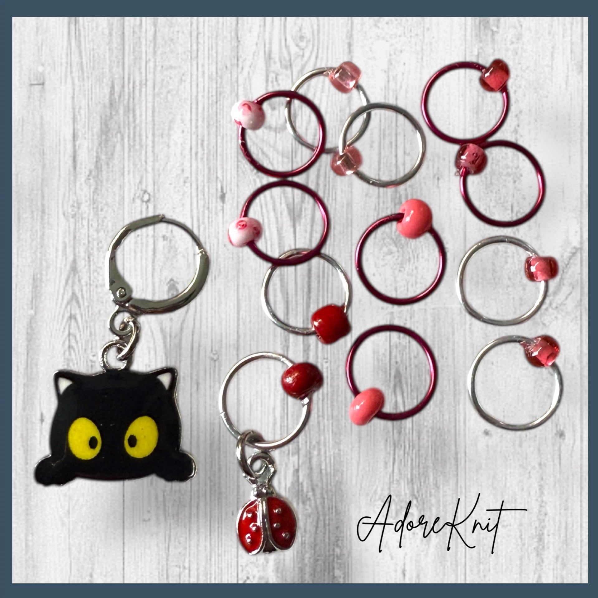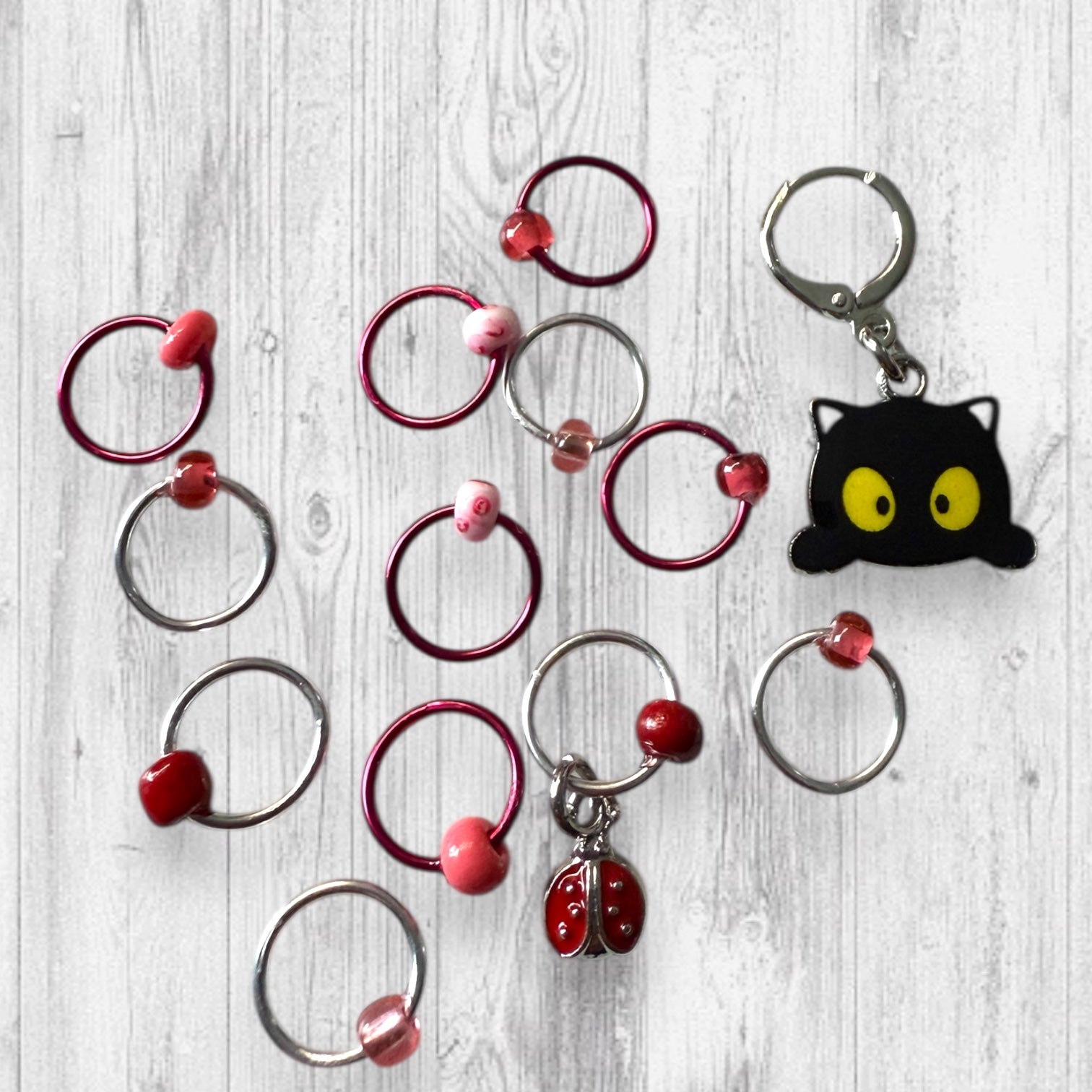- A combo of the mischievous Black Cat Progress Marker/Keeper and the Set of 12 Stitch Markers (Including either a ladybug or red flowers marker!)
