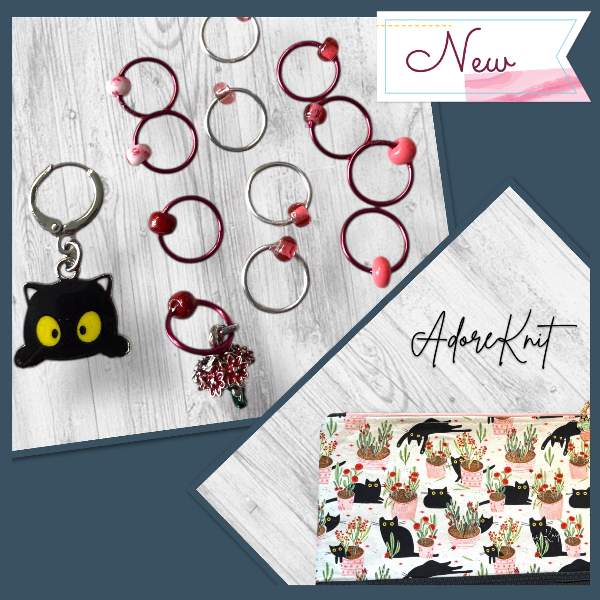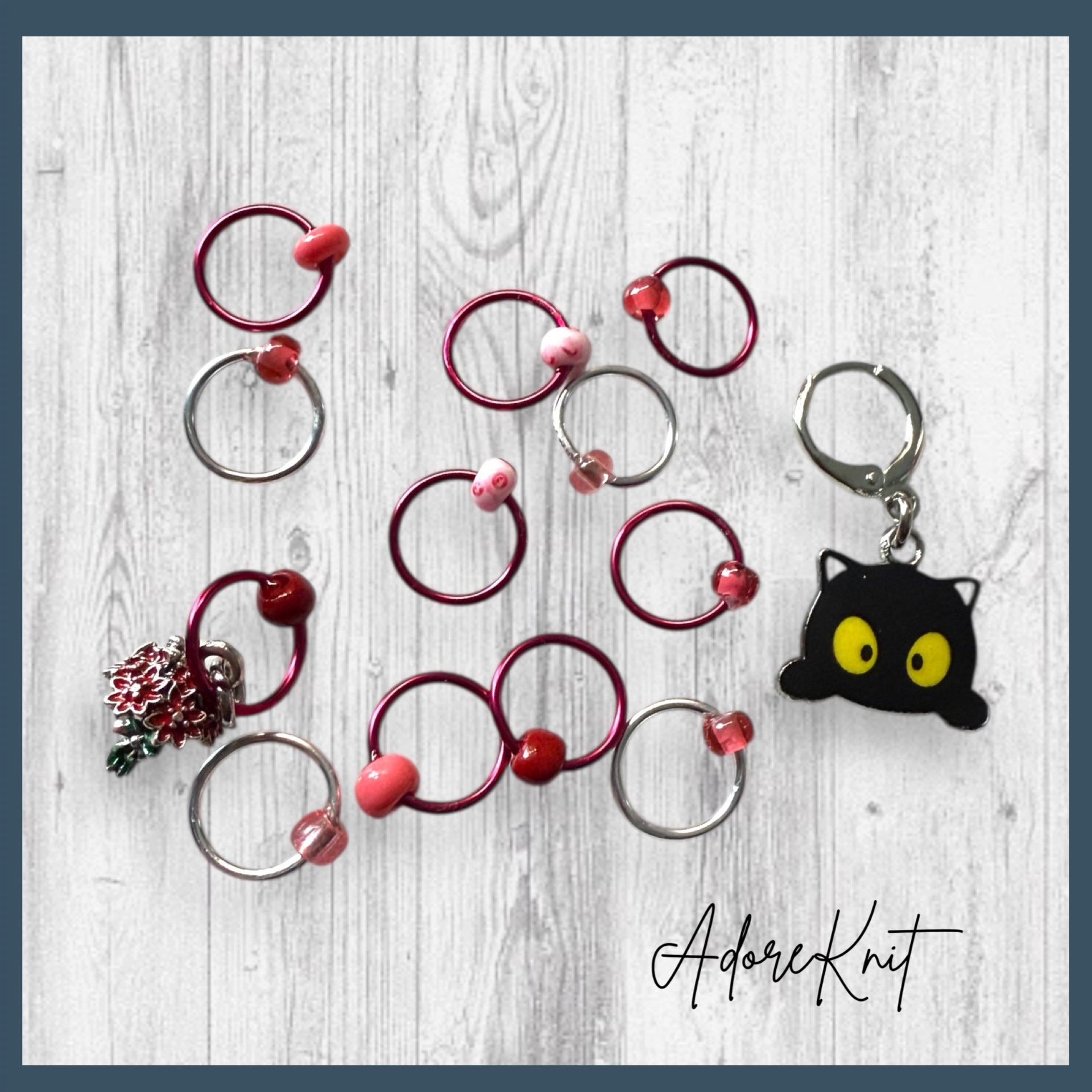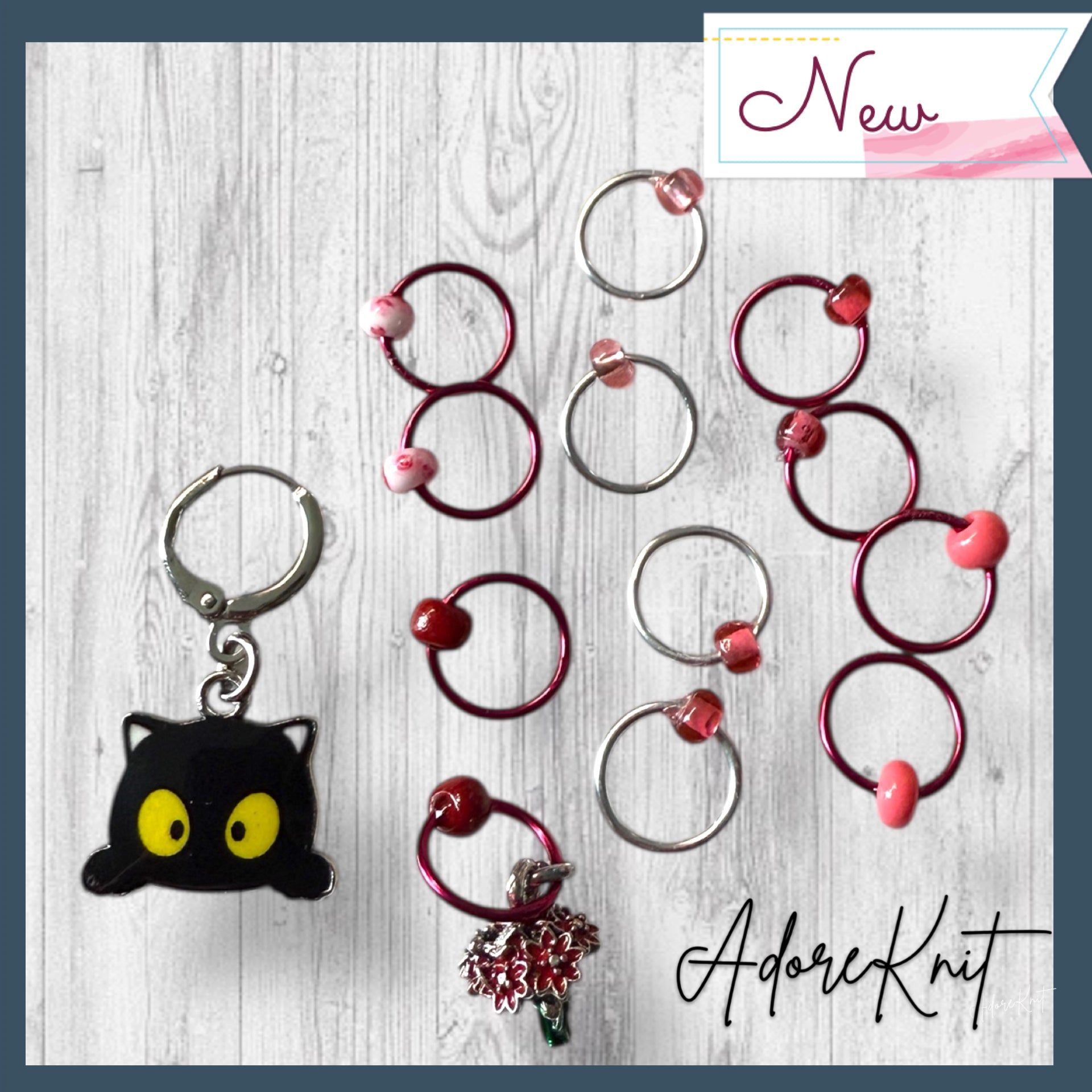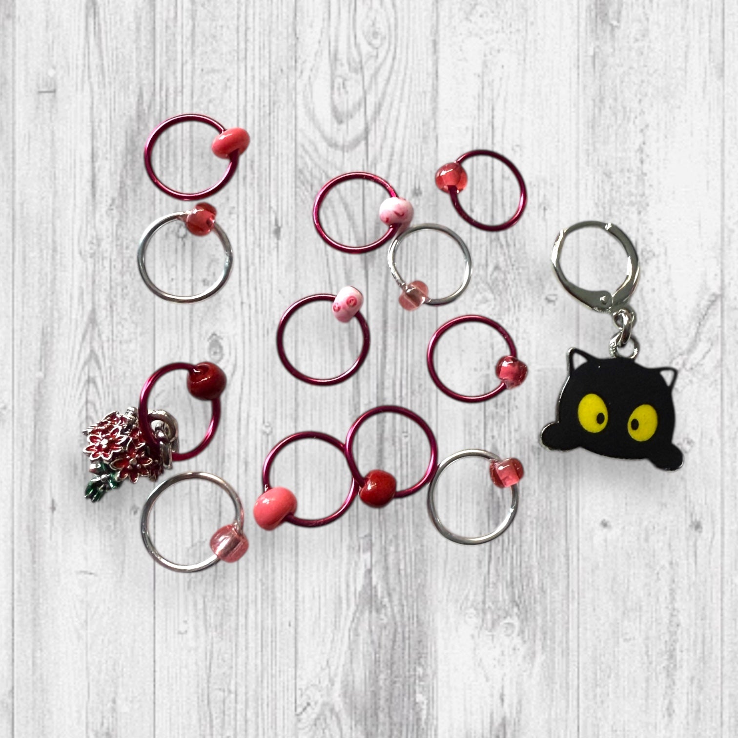- A combo of the mischievous Black Cat Progress Marker/Keeper and the Set of 12 Stitch Markers (Including either a ladybug or red flowers marker!)