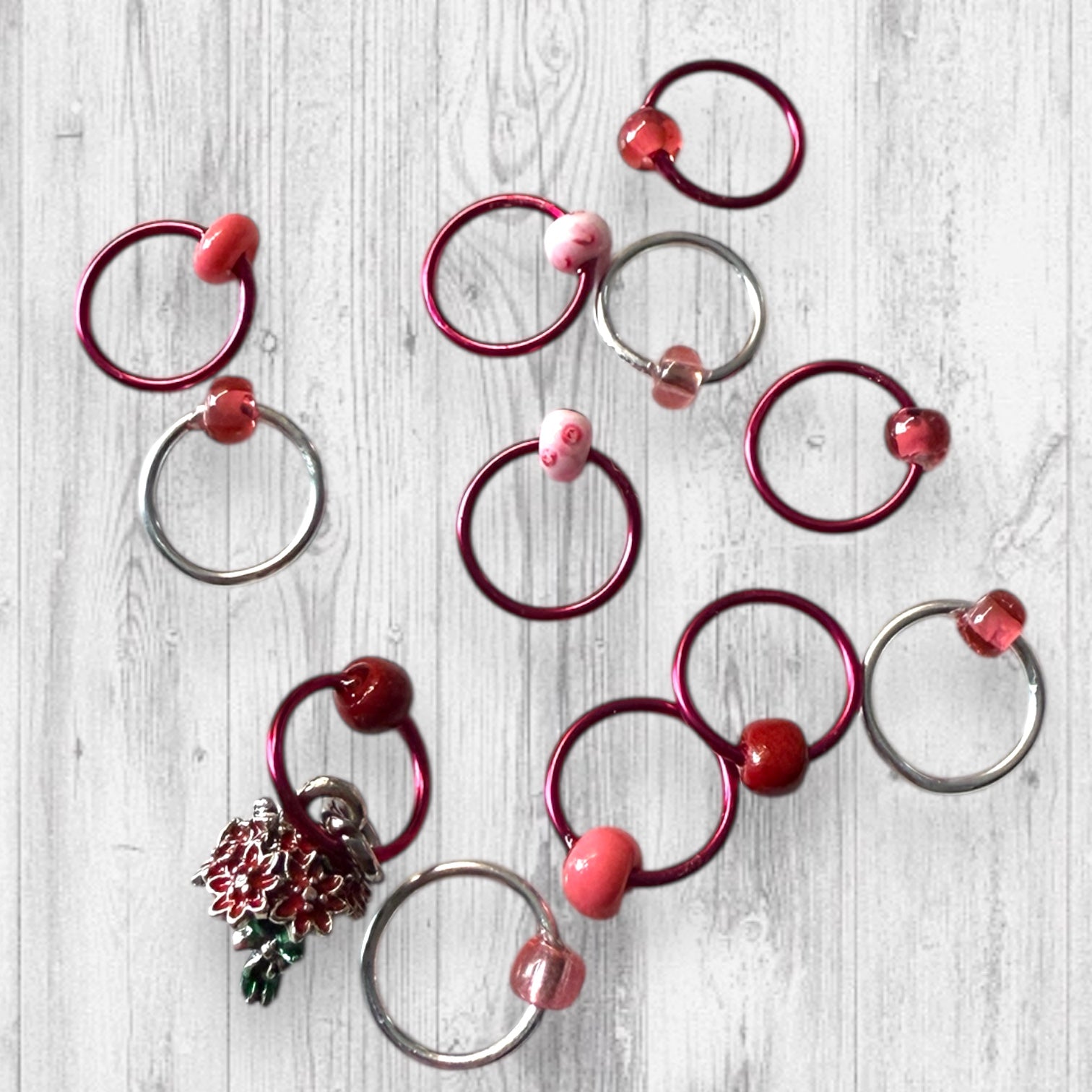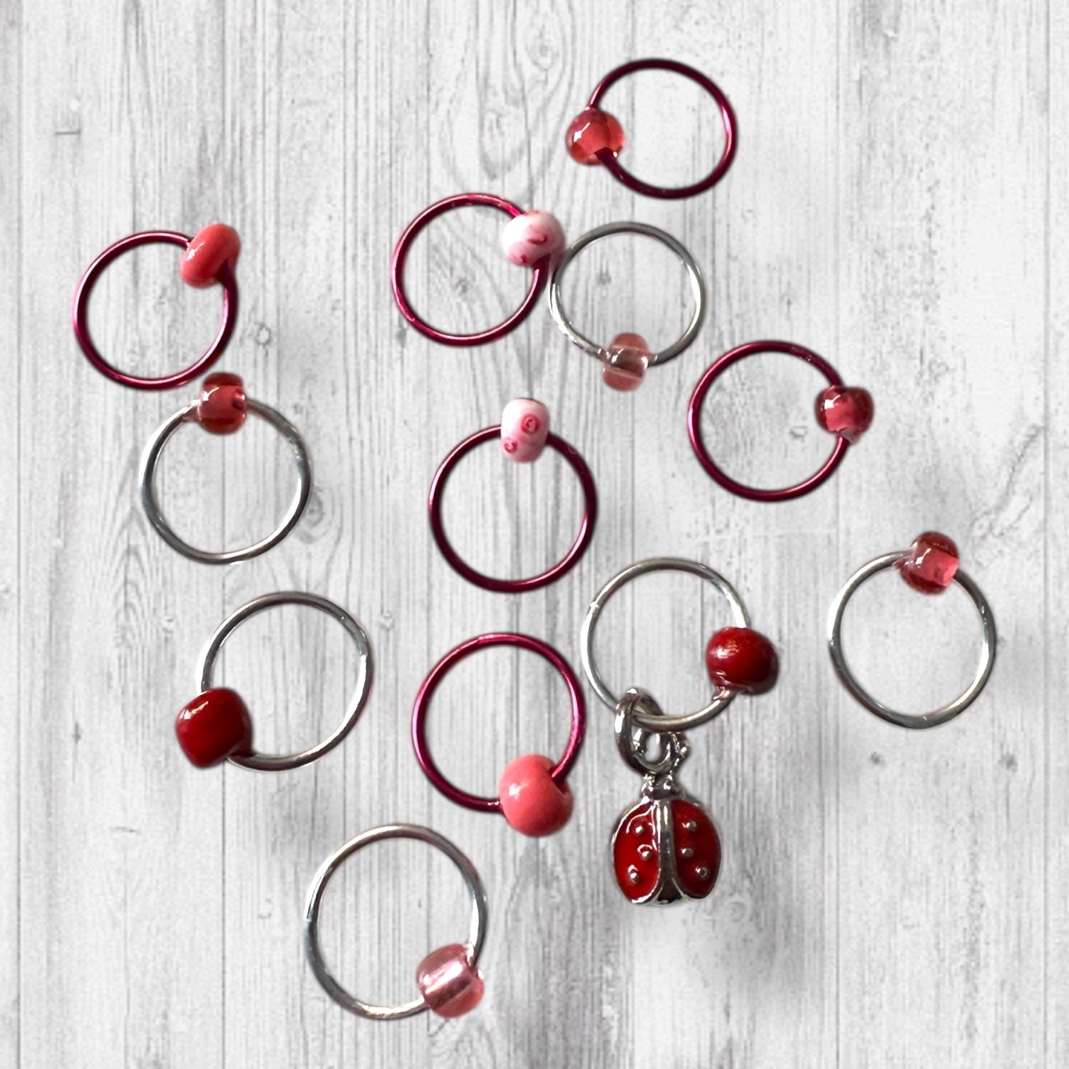 Set of 12 markers: Metal alloy rings in raspberry and silver hold a delightful mix of beads in shades of pink and red, featuring a variety of finishes that shimmer and shine like a ladybug’s wings.