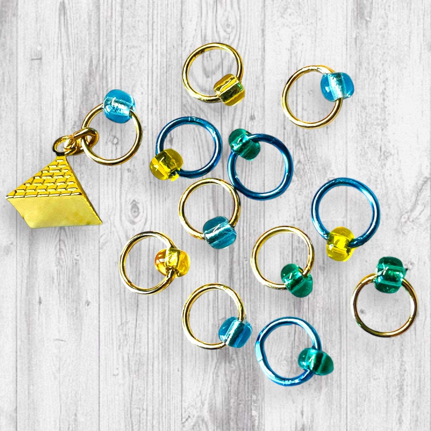 Set of 12 markers; light gold, and aqua rings carry clear beads of sky blue, chalkboard green, golden sand, and minion yellow beads.